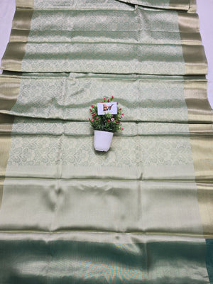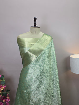 The beautifully contrasted Banarasi border enhances the overall look with classic woven craftsmanship, lending definition and grandeur to the drape. The coordinated pallu continues the woven theme, creating a harmonious and graceful flow throughout the saree.