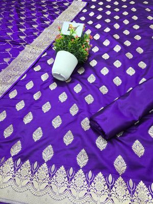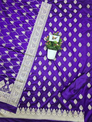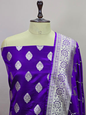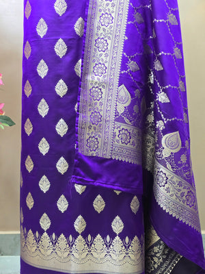 Indulge in timeless elegance with this exquisite Banarasi Malai Katan Silk Suit, crafted to reflect the richness of traditional Banarasi weaving. The suit features a smooth and lustrous malai katan silk base adorned with elegant all-over zari booti motifs, lending it a refined festive charm. The ensemble is paired with a beautifully woven Banarasi dupatta, highlighted by intricate floral zari patterns and a richly detailed border that enhances its regal appeal.