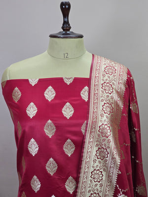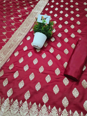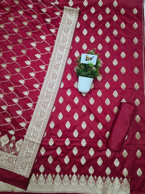 Indulge in timeless elegance with this exquisite Banarasi Malai Katan Silk Suit, crafted to reflect the richness of traditional Banarasi weaving. The suit features a smooth and lustrous malai katan silk base adorned with elegant all-over zari booti motifs, lending it a refined festive charm. The ensemble is paired with a beautifully woven Banarasi dupatta, highlighted by intricate floral zari patterns and a richly detailed border that enhances its regal appeal.