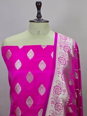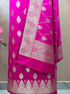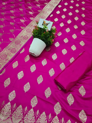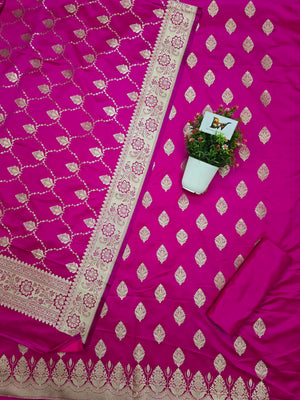 Indulge in timeless elegance with this exquisite Banarasi Malai Katan Silk Suit, crafted to reflect the richness of traditional Banarasi weaving. The suit features a smooth and lustrous malai katan silk base adorned with elegant all-over zari booti motifs, lending it a refined festive charm. The ensemble is paired with a beautifully woven Banarasi dupatta, highlighted by intricate floral zari patterns and a richly detailed border that enhances its regal appeal.