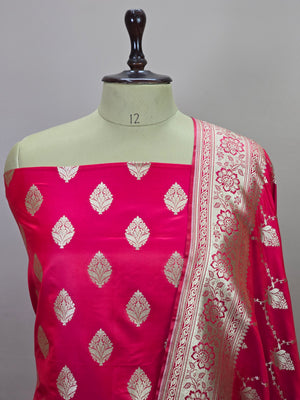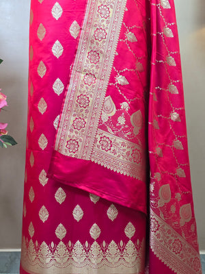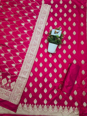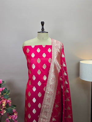 Indulge in timeless elegance with this exquisite Banarasi Malai Katan Silk Suit, crafted to reflect the richness of traditional Banarasi weaving. The suit features a smooth and lustrous malai katan silk base adorned with elegant all-over zari booti motifs, lending it a refined festive charm. The ensemble is paired with a beautifully woven Banarasi dupatta, highlighted by intricate floral zari patterns and a richly detailed border that enhances its regal appeal.