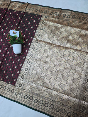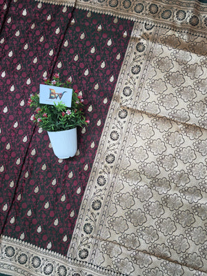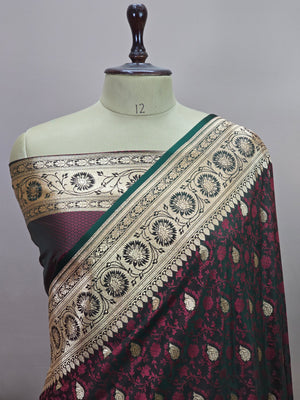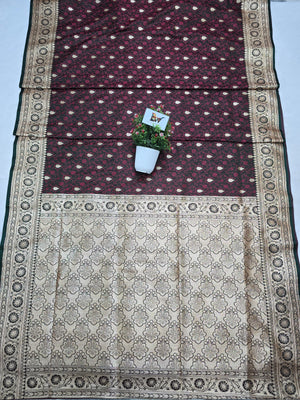 Accentuated by a richly detailed Banarasi woven border with traditional motifs, this saree drapes beautifully with a soft sheen and structured fall. Ideal for weddings, evening festivities, and grand traditional occasions, it is a timeless choice for those who appreciate complex weaves and classic Banarasi heritage.