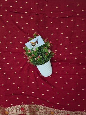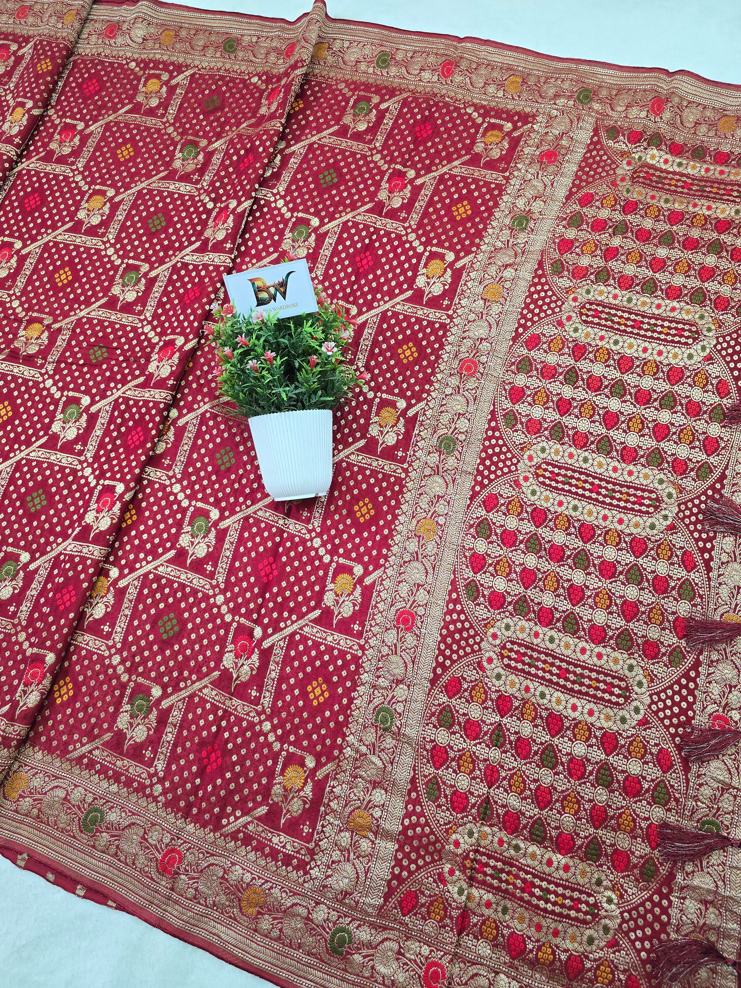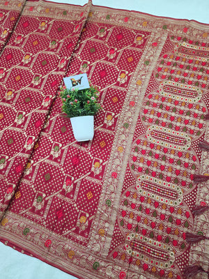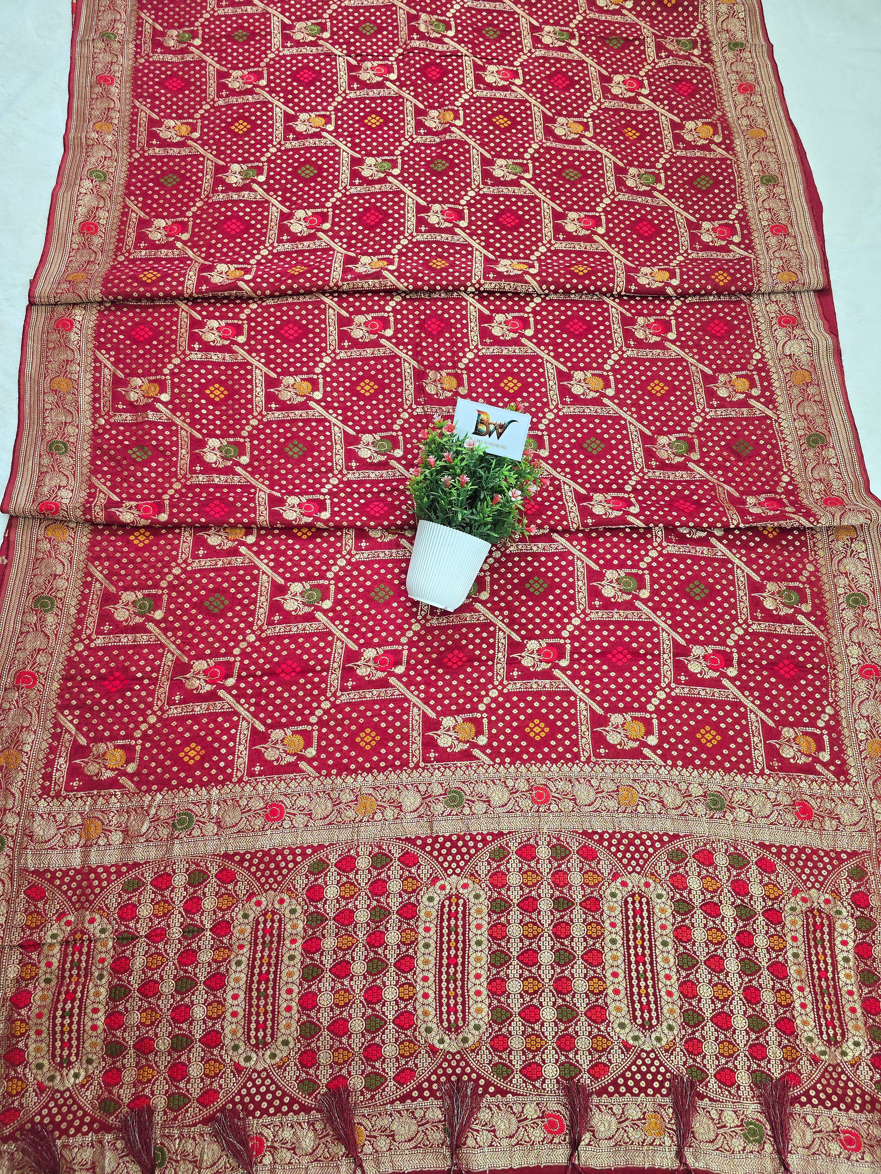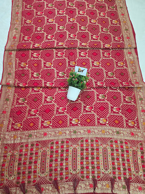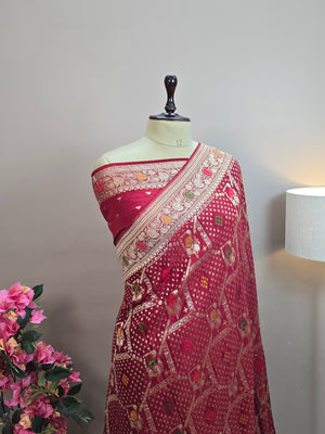 Elevate your festive style with this stunning Crush Crepe Jaal Bandhej Saree, beautifully enhanced with intricate meenakari flower motifs all over. The rich red base highlights the elegant hexagon bandhej pattern, while the exquisite meenakari floral jaal border adds a luxurious Banarasi touch.