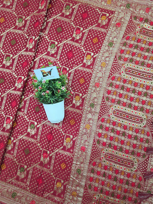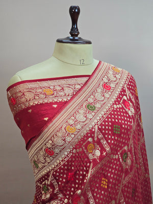 Crush Crepe Alfi Bandhej Saree – Red with Meenakari Flower Bootas