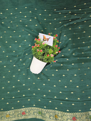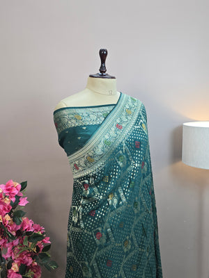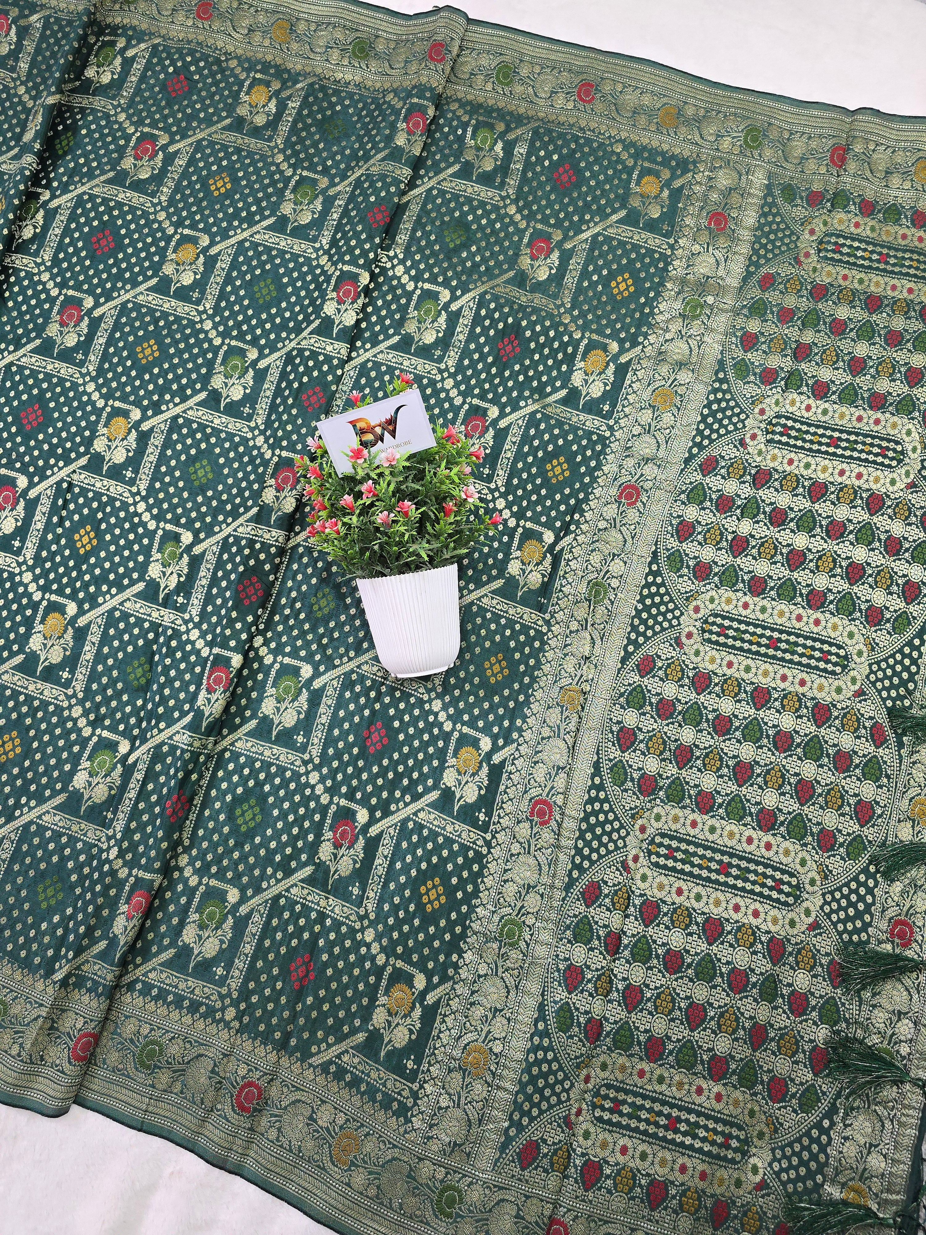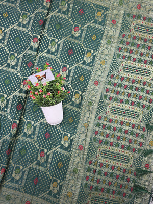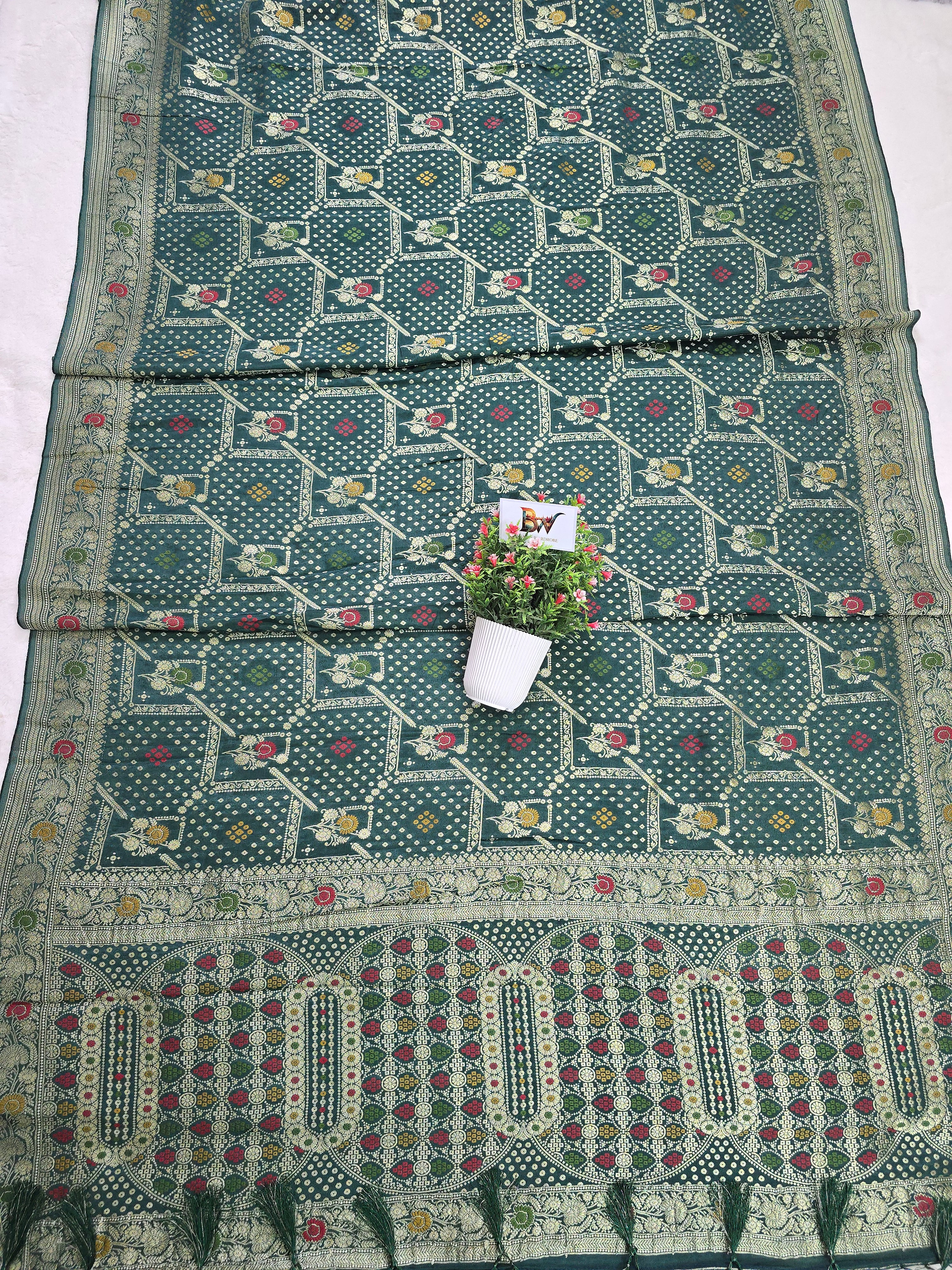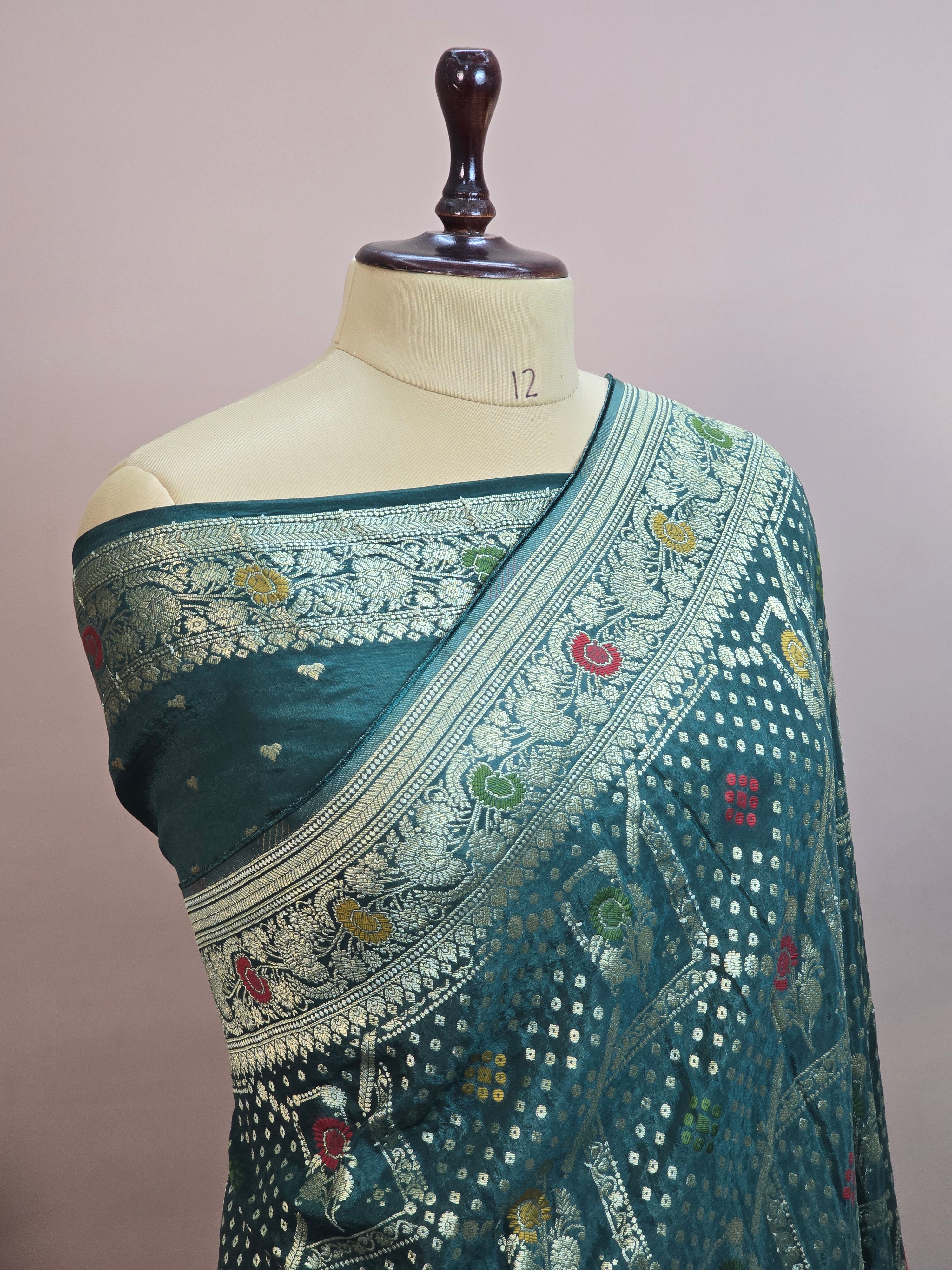 Elevate your festive style with this stunning Crush Crepe Jaal Bandhej Saree, beautifully enhanced with intricate meenakari flower motifs all over. The rich sea green base highlights the elegant hexagon bandhej pattern, while the exquisite meenakari floral jaal border adds a luxurious Banarasi touch.