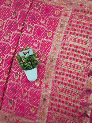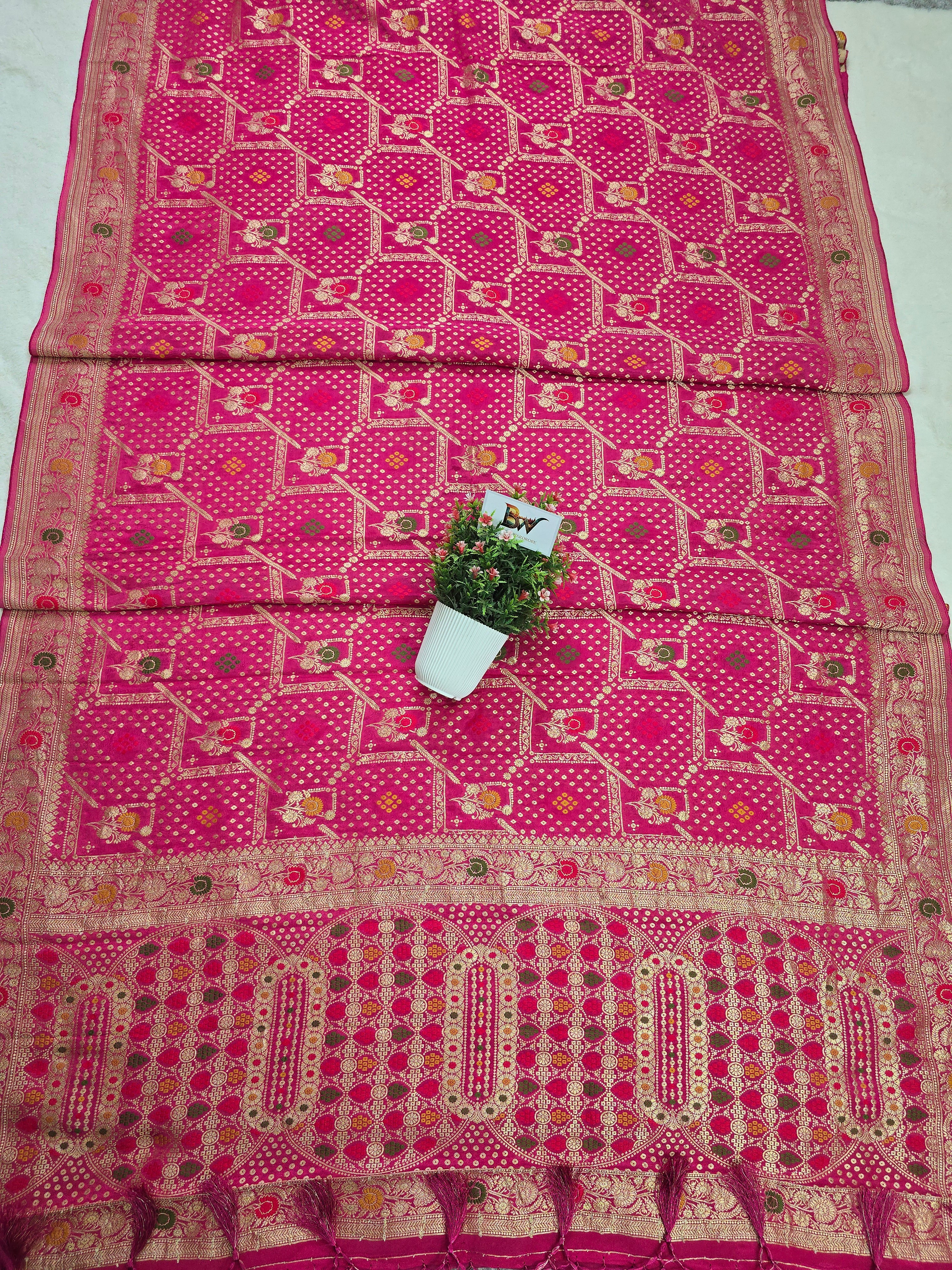 Elevate your festive style with this stunning Crush Crepe Jaal Bandhej Saree, beautifully enhanced with intricate meenakari flower motifs all over. The rich rani pink base highlights the elegant hexagon bandhej pattern, while the exquisite meenakari floral jaal border adds a luxurious Banarasi touch.