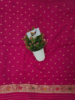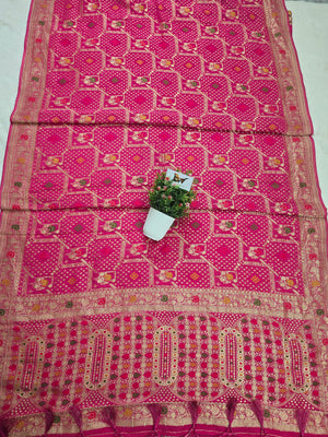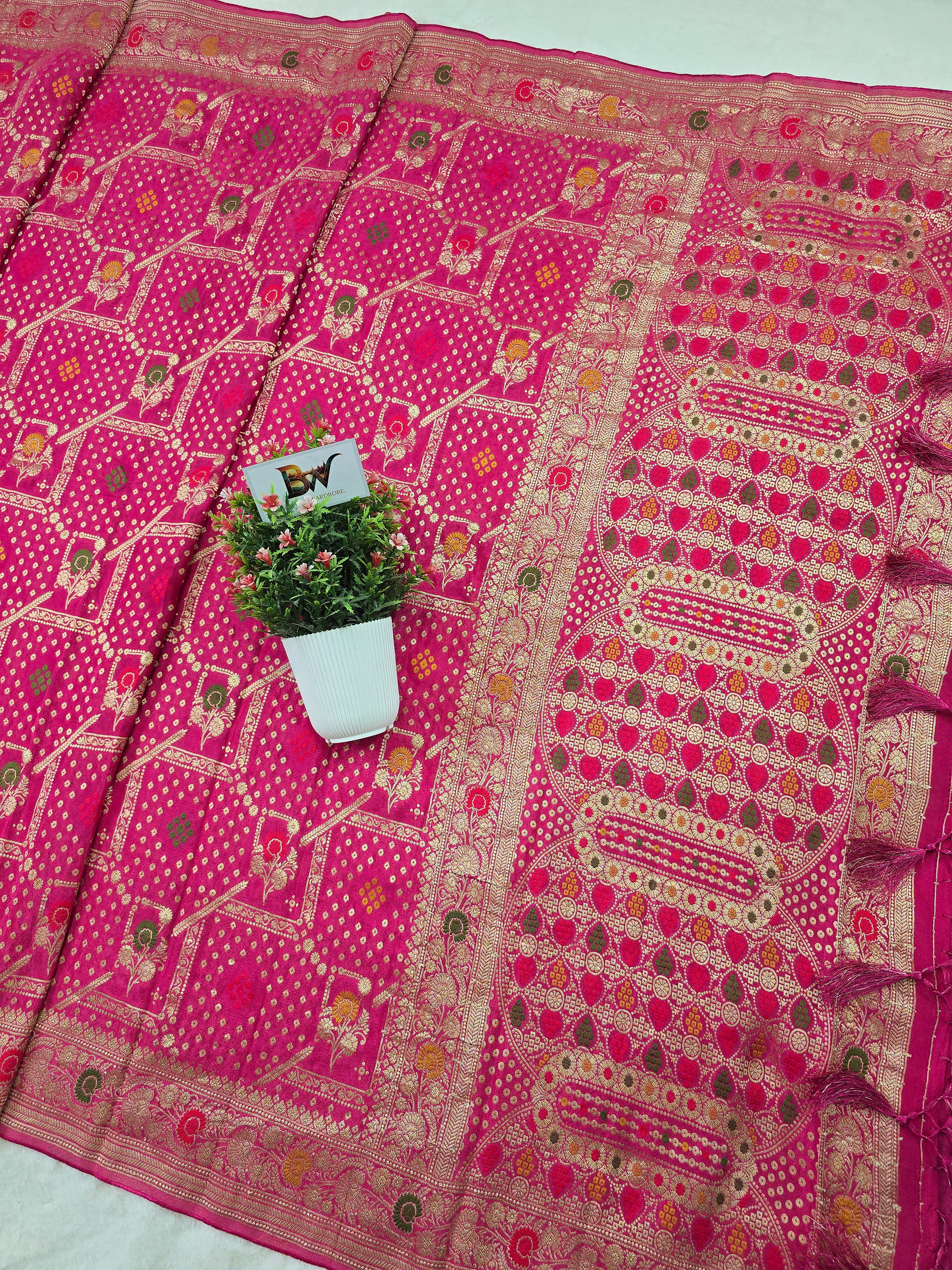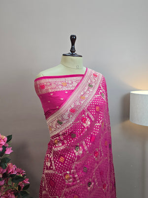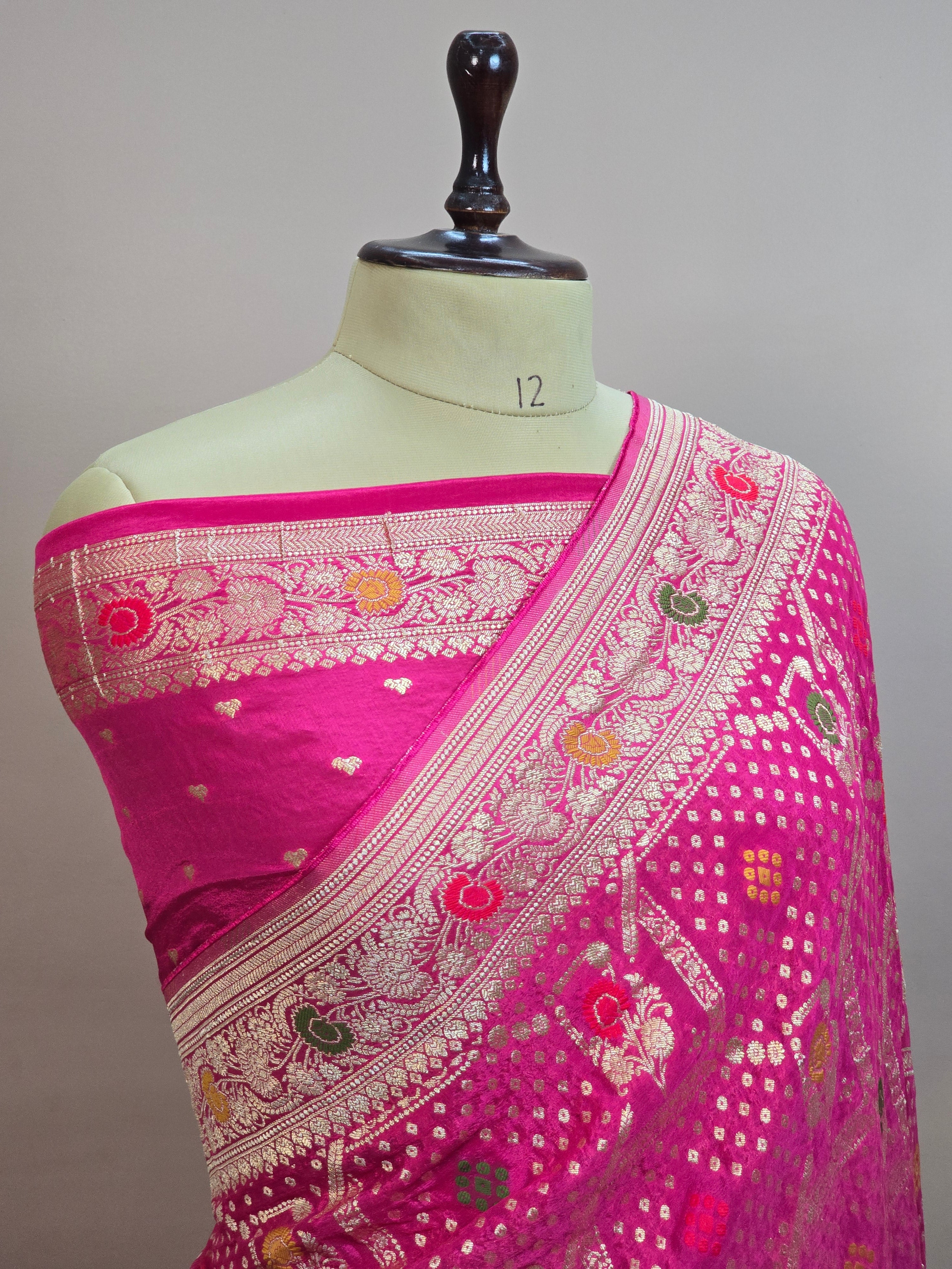 Crush Crepe Alfi Bandhej Saree – Rani Pink with Meenakari Flower Bootas
