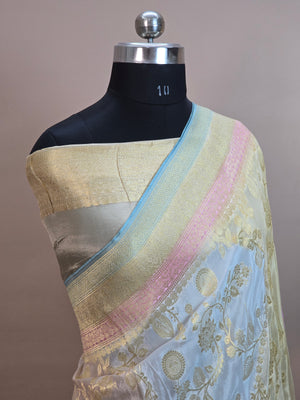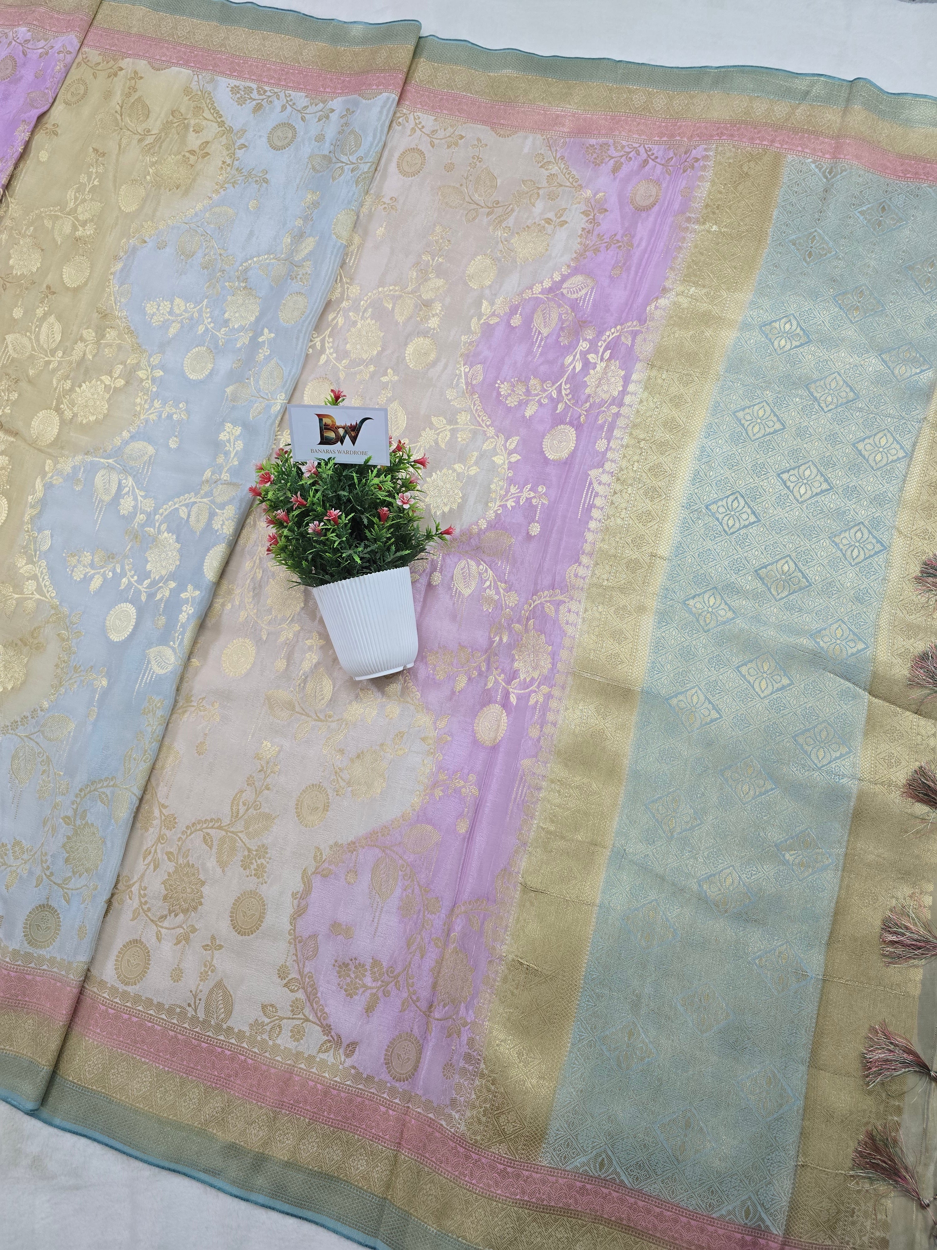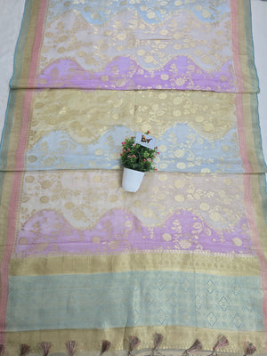 Crush Crepe Light MultiColor Rangkaat Jaal Banarasi Saree with Boota & Tricolour Border