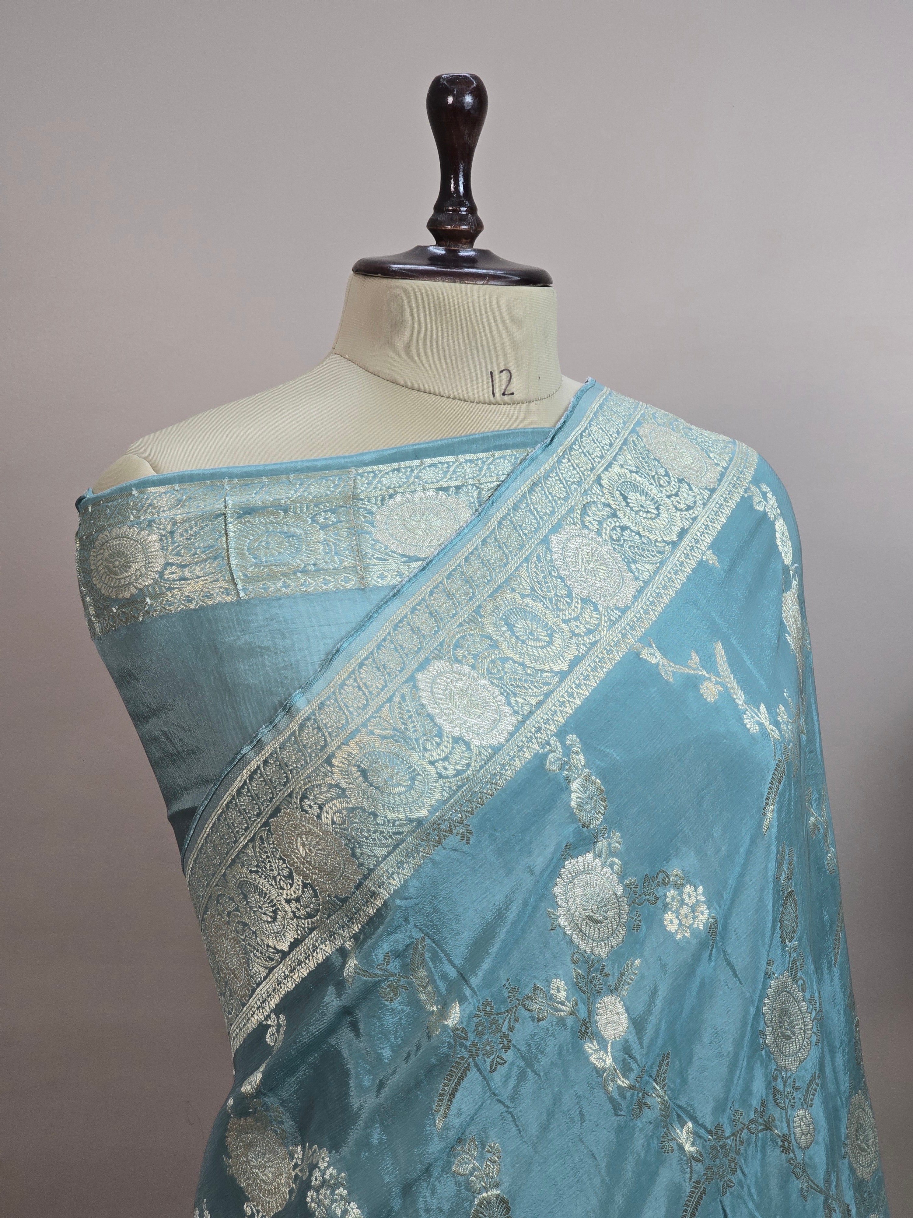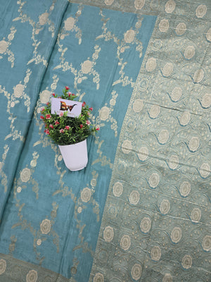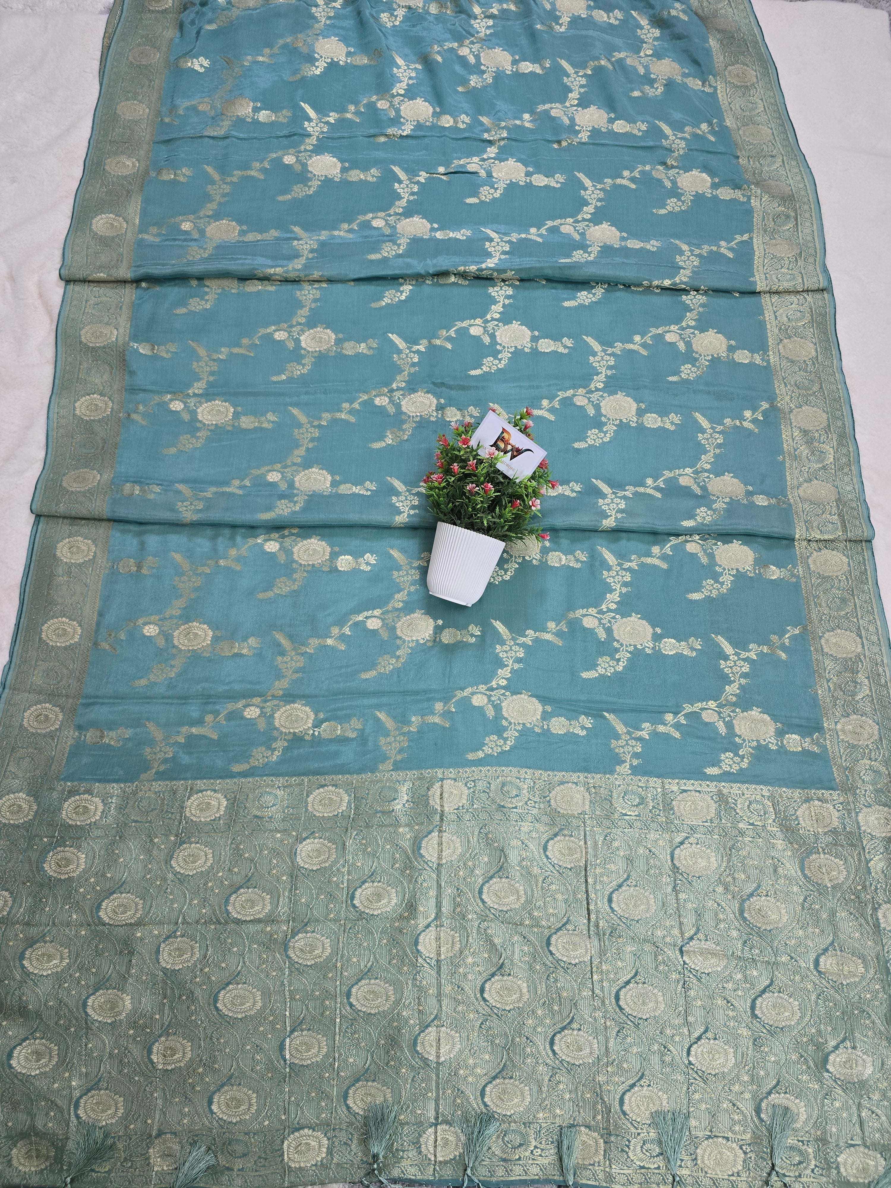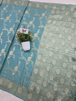 Elevate your traditional collection with this exquisite Crush Crepe Banarasi Saree featuring an all-over floral jaal weave. Designed in a rich sea green shade, the saree showcases intricate zari boota motifs along with a beautifully crafted boota jaal pattern border that enhances its regal Banarasi charm.