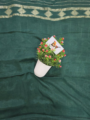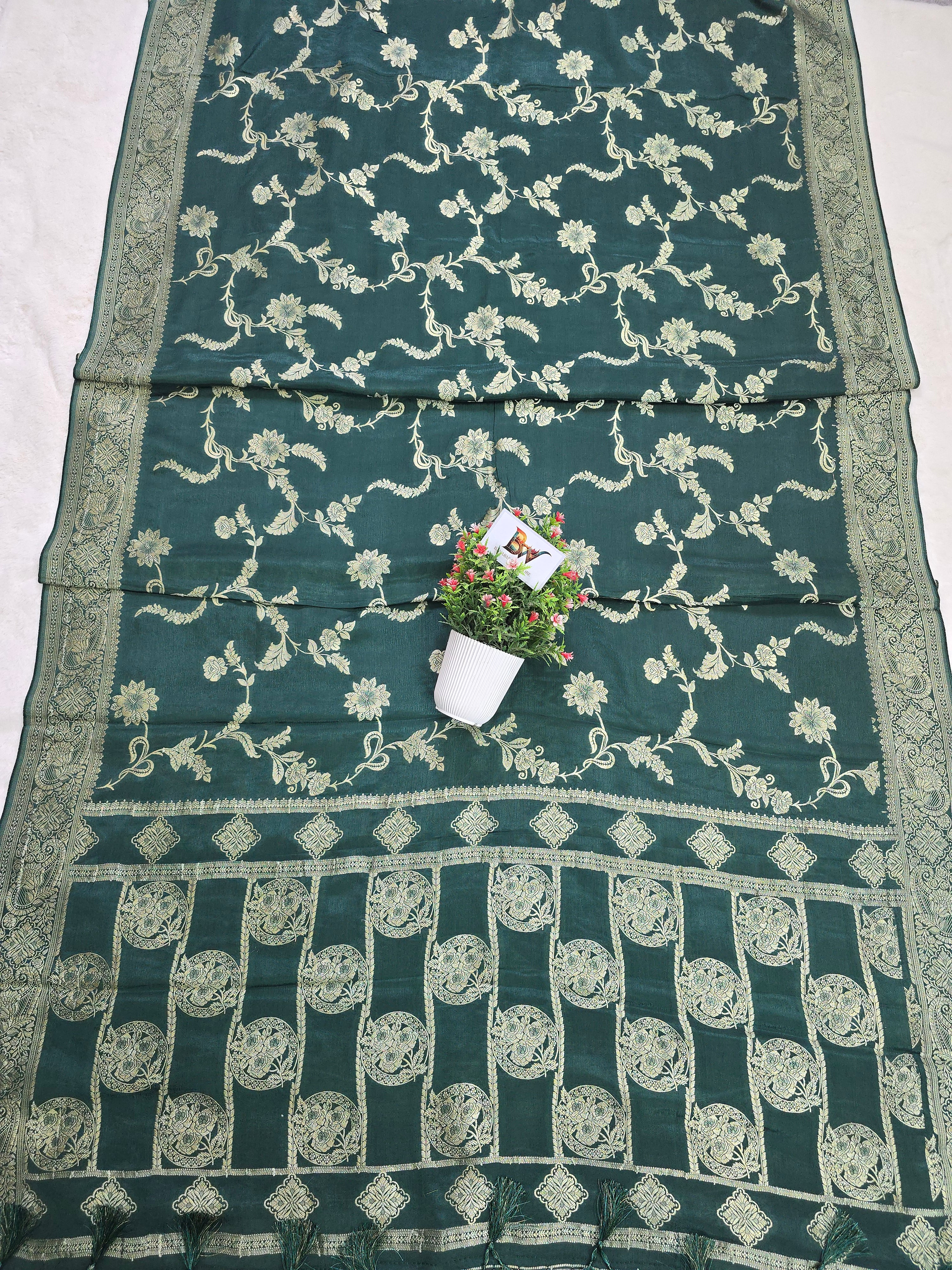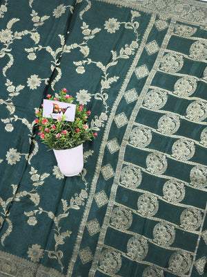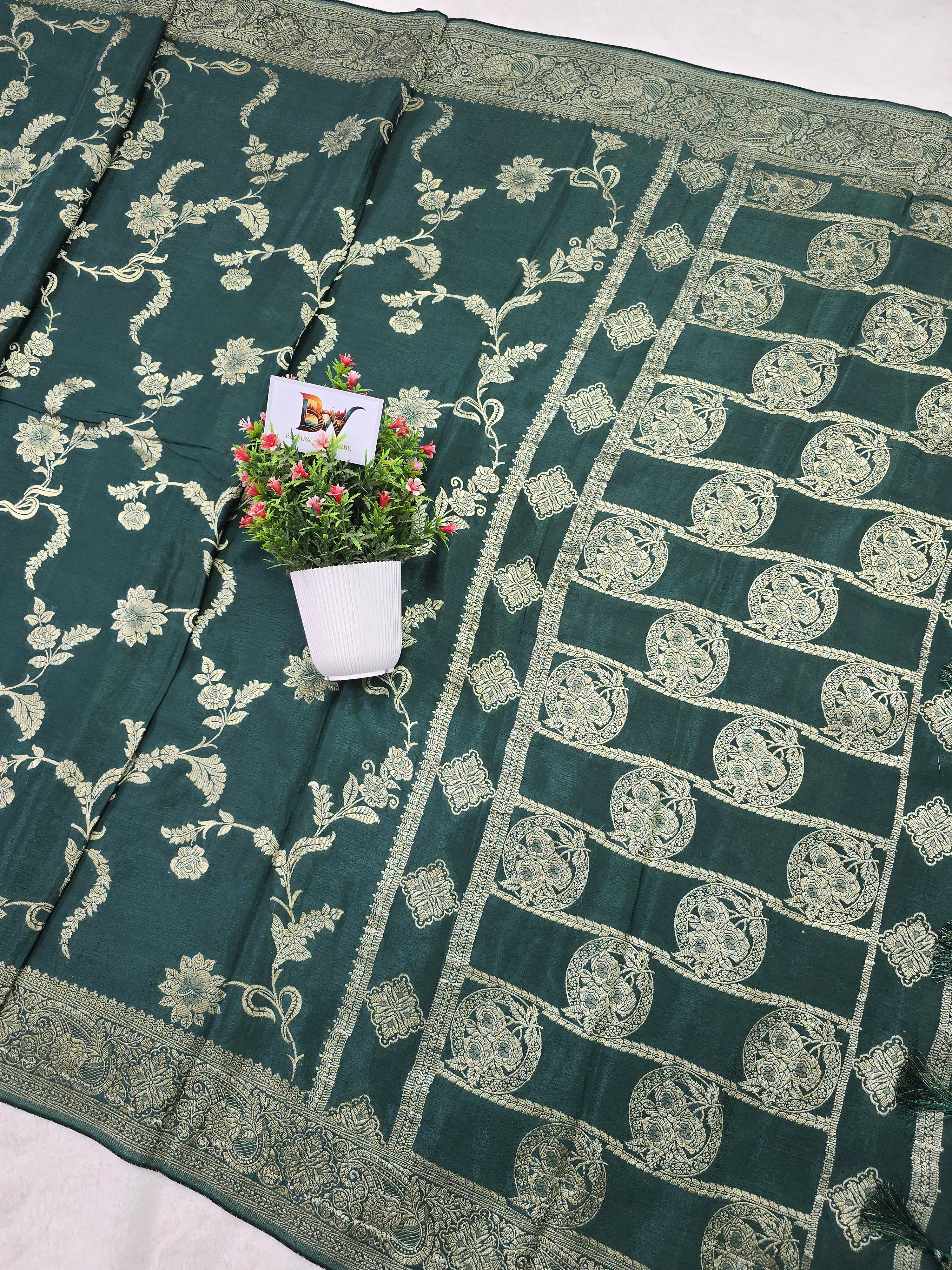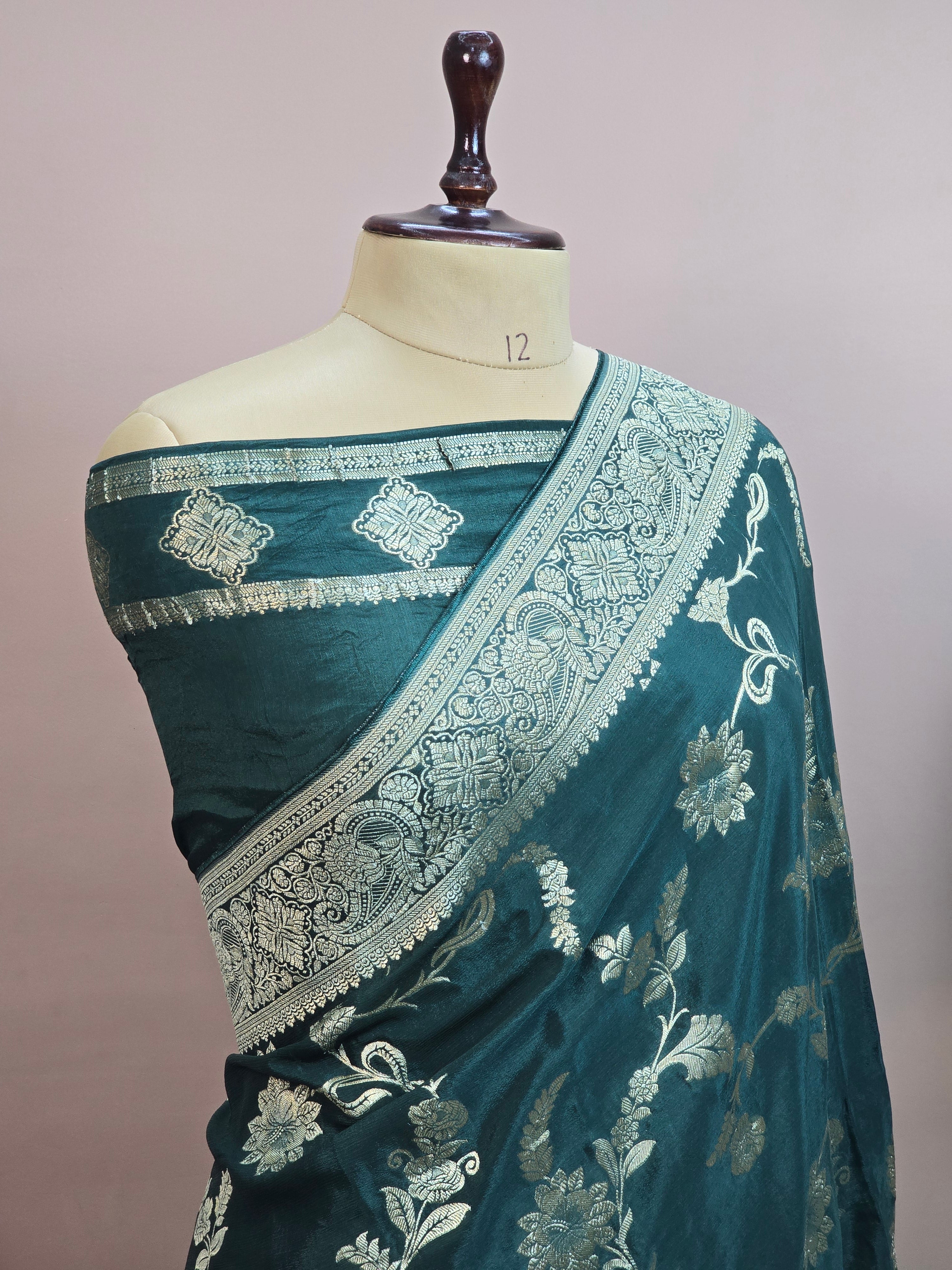 Elevate your traditional collection with this exquisite Crush Crepe Banarasi Saree featuring an all-over floral jaal weave. Designed in a rich sea green shade, the saree showcases intricate zari boota motifs along with a beautifully crafted boota jaal pattern border that enhances its regal Banarasi charm.