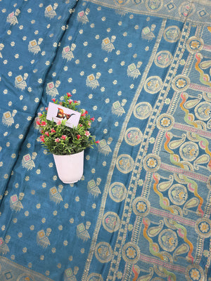 Elevate your festive wardrobe with this elegant Crush Crepe Alfi Meenakari Boota Banarasi Saree, crafted in a graceful firozi blue shade. The saree is adorned with intricate meenakari bootas and complemented by a beautifully detailed meenakari bootas Banarasi border, adding richness and traditional charm.