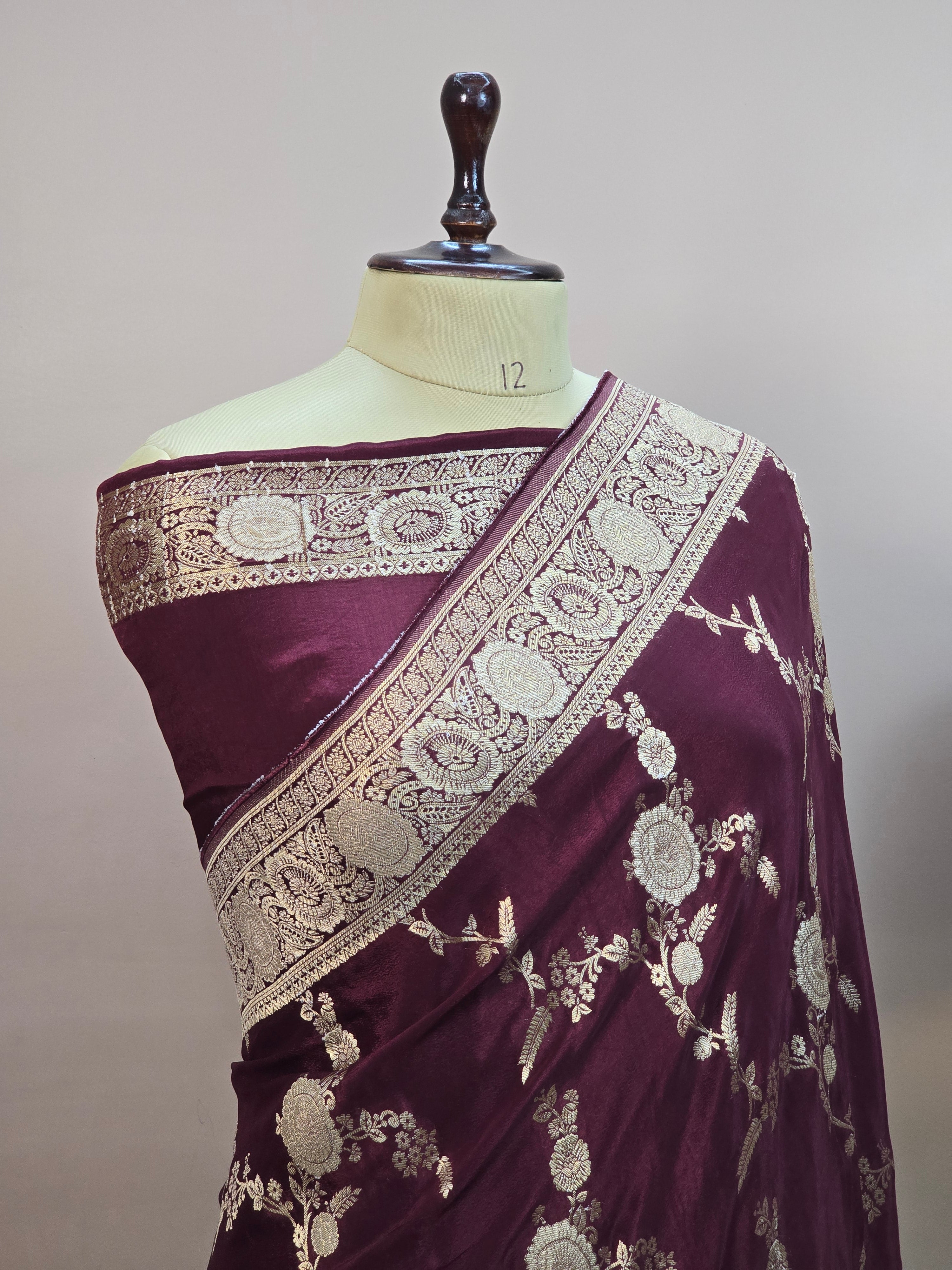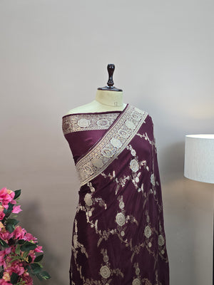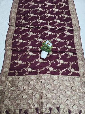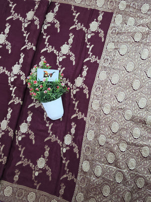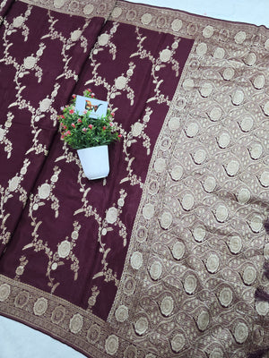 Elevate your traditional collection with this exquisite Crush Crepe Banarasi Saree featuring an all-over floral jaal weave. Designed in a rich brown shade, the saree showcases intricate zari boota motifs along with a beautifully crafted boota jaal pattern border that enhances its regal Banarasi charm.