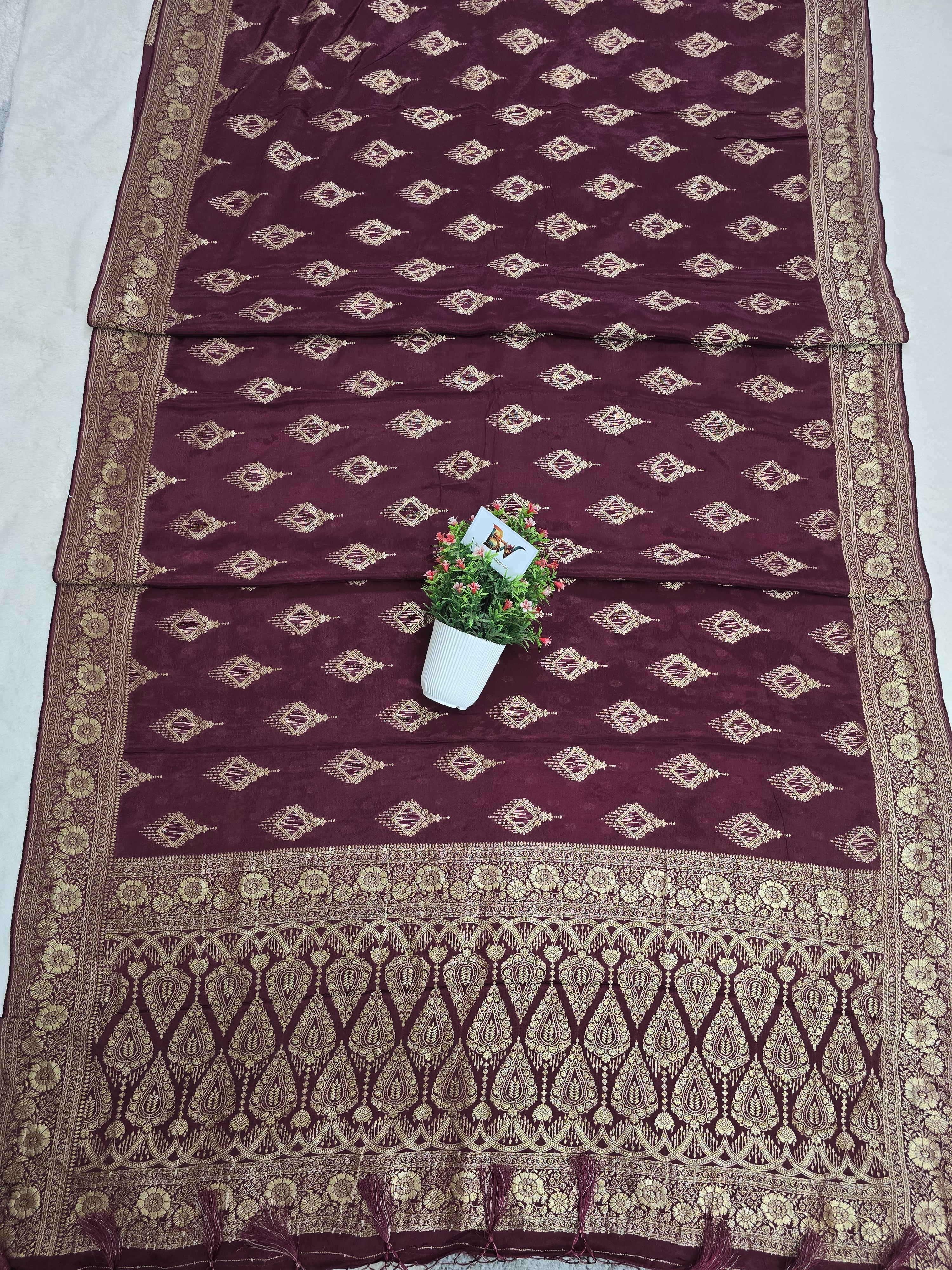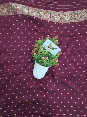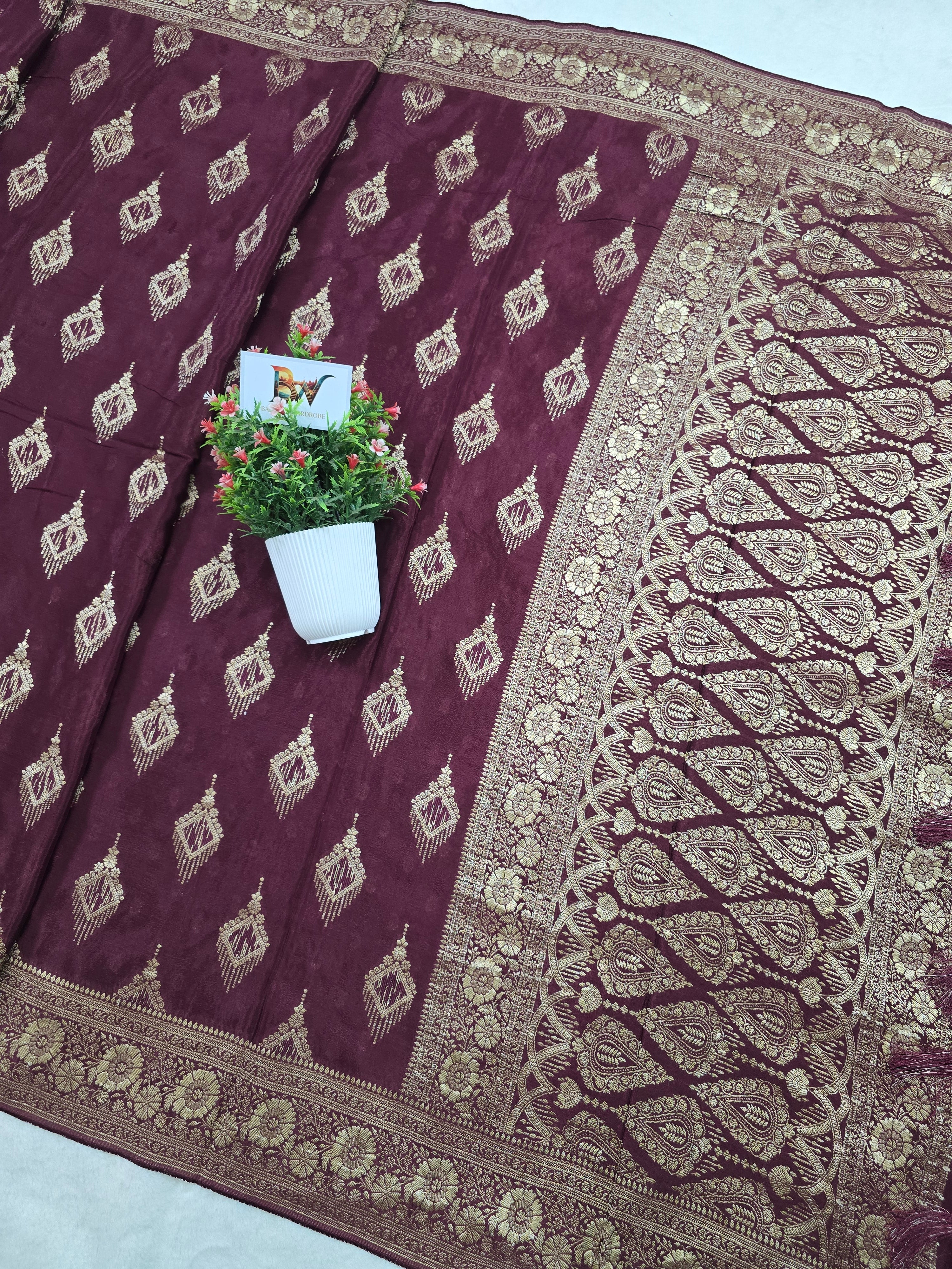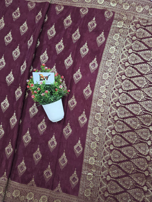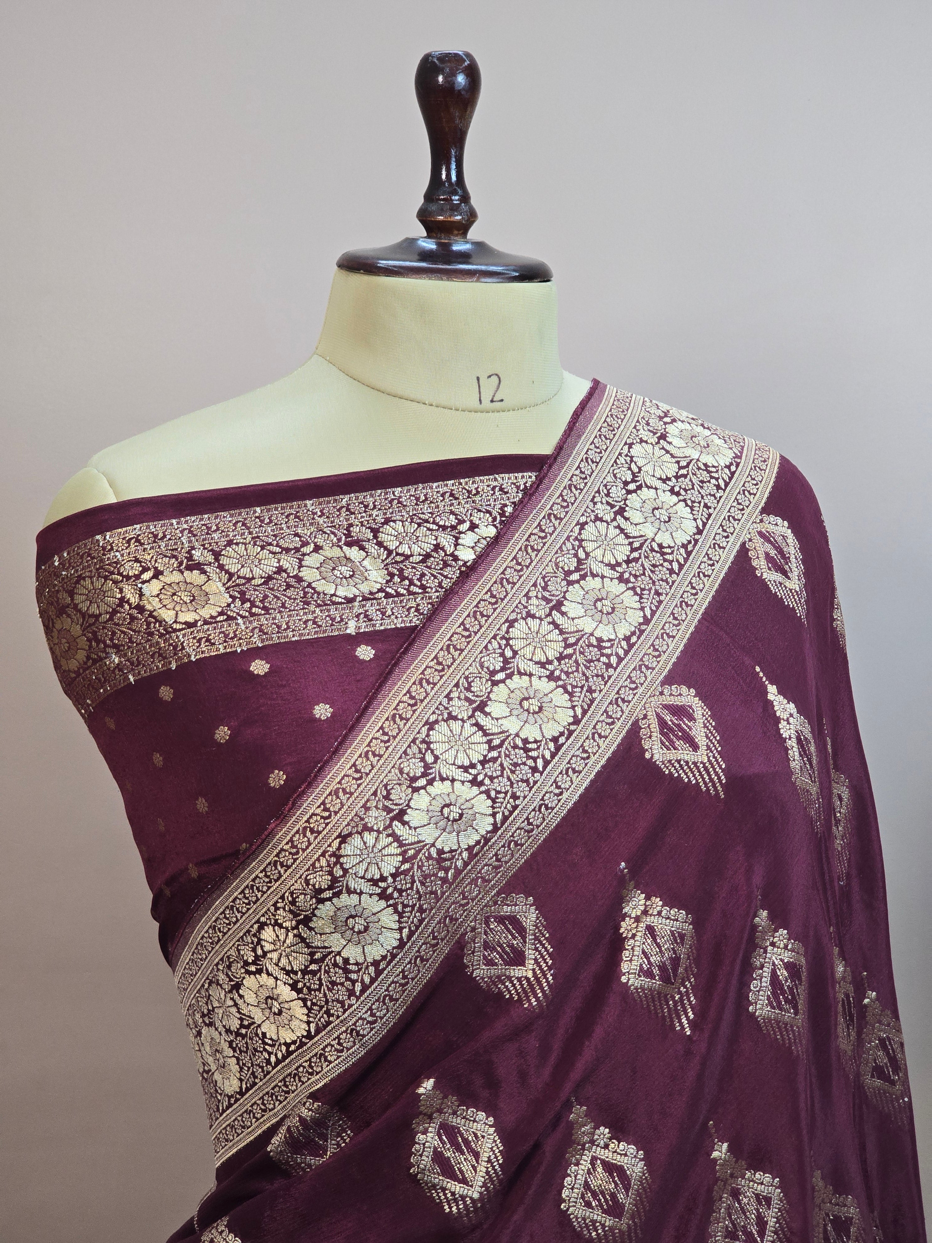 Crush Crepe Banarasi Saree – Deep Wine Body with Geometric Zari Boota