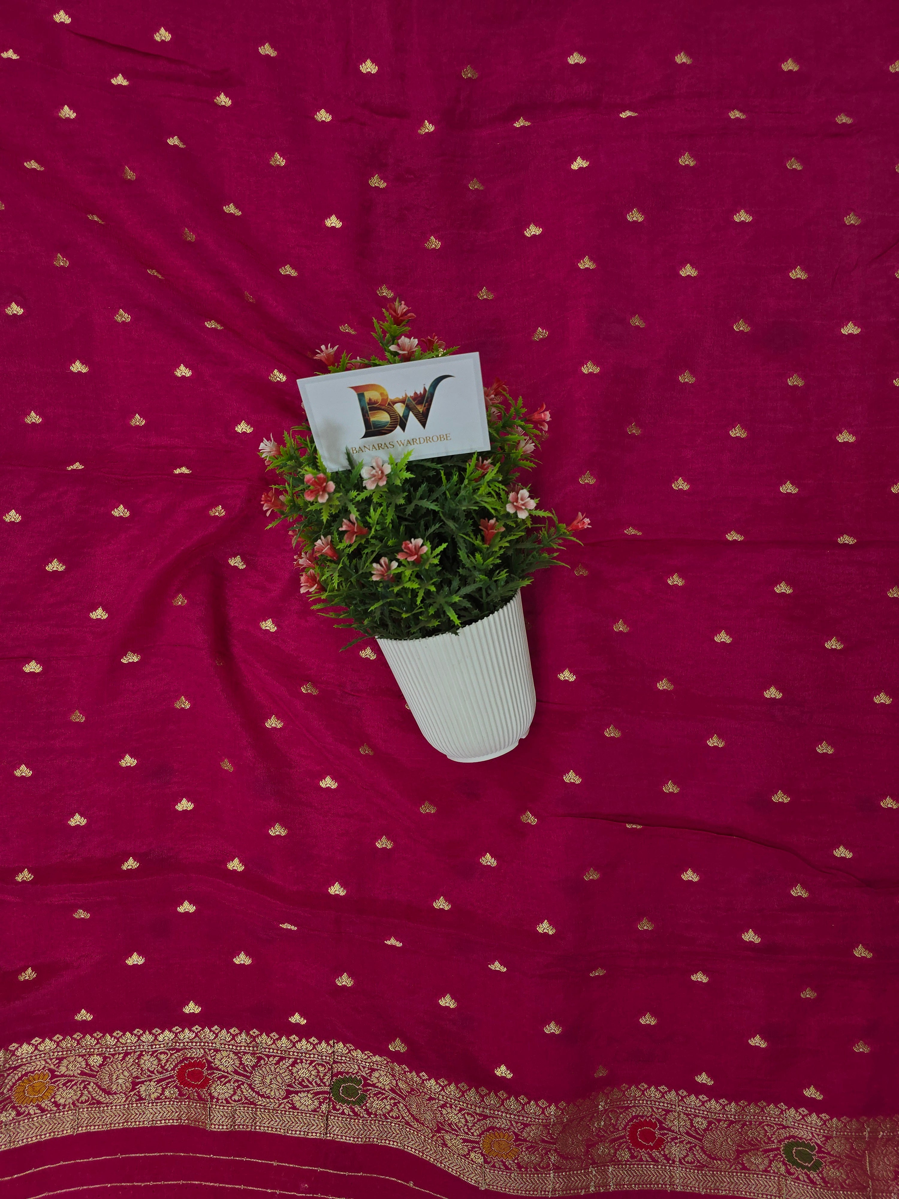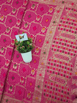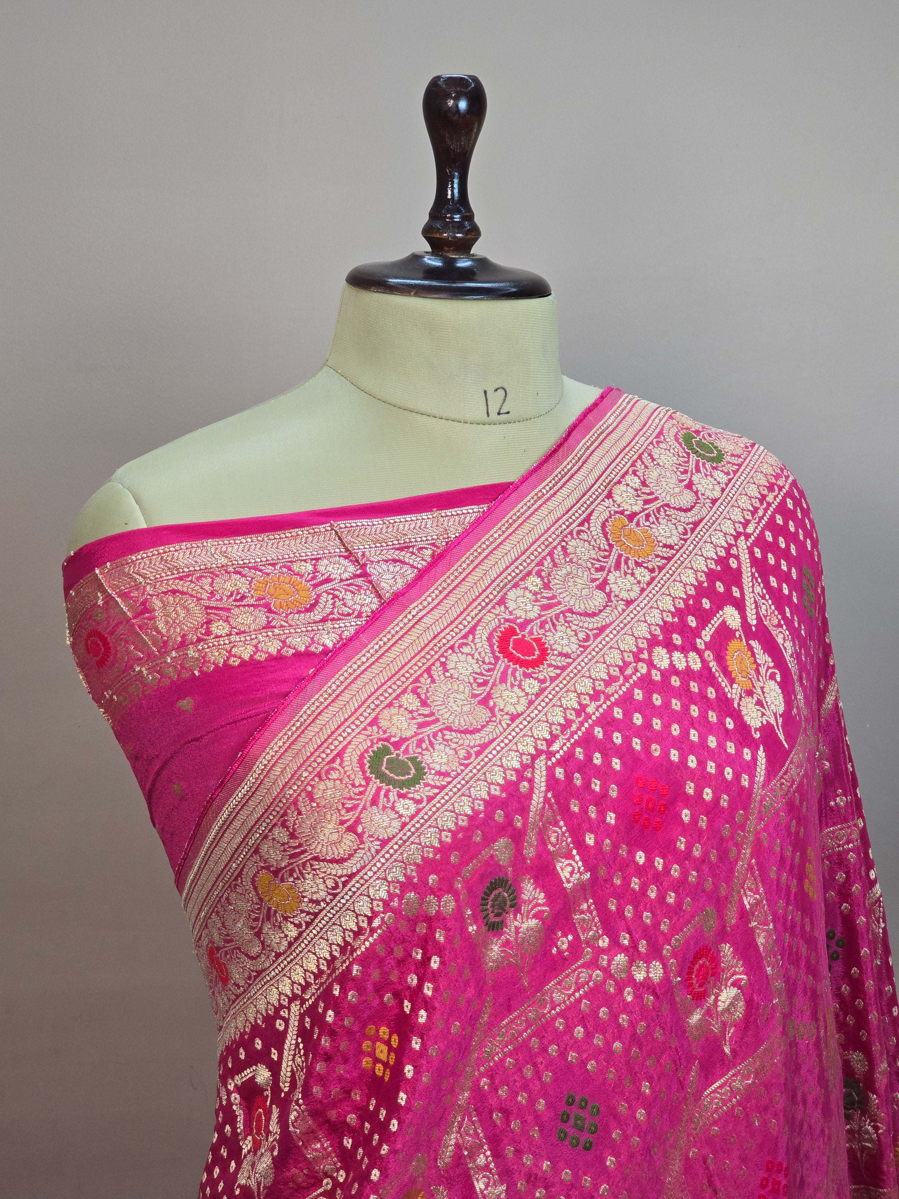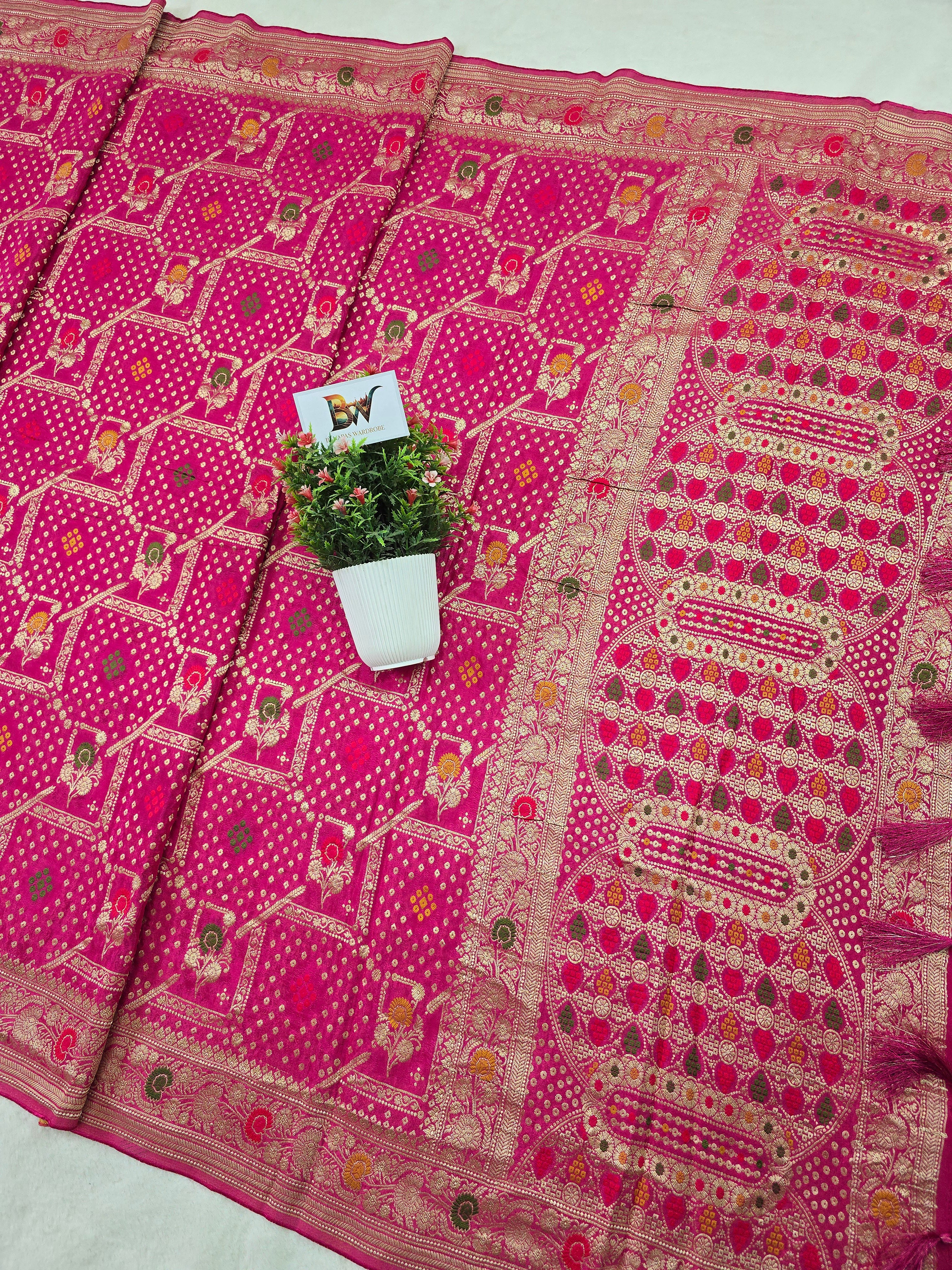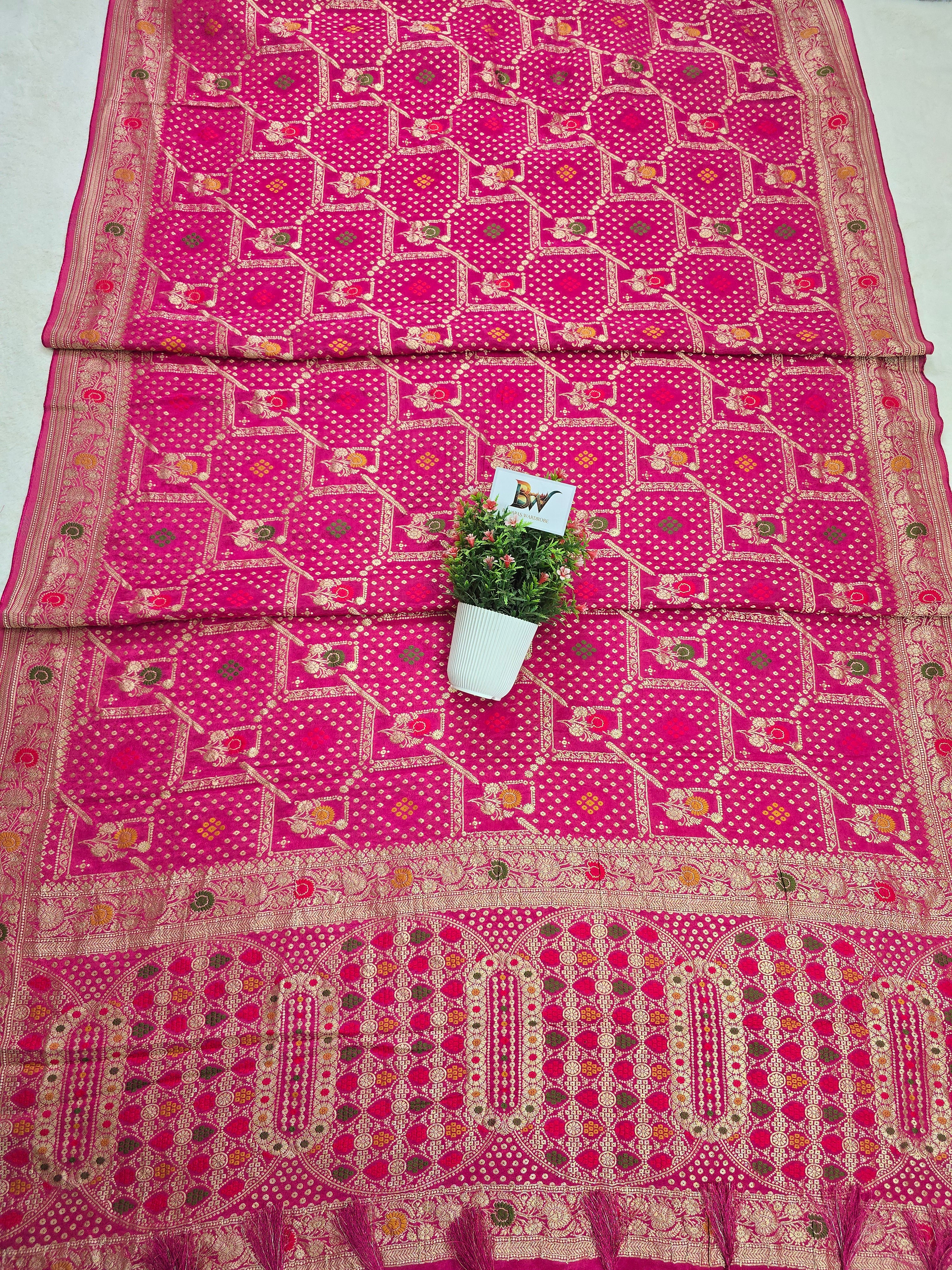 Elevate your festive style with this stunning Crush Crepe Jaal Bandhej Saree, beautifully enhanced with intricate meenakari flower motifs all over. The rich baby-pink base highlights the elegant hexagon bandhej pattern, while the exquisite meenakari floral jaal border adds a luxurious Banarasi touch.