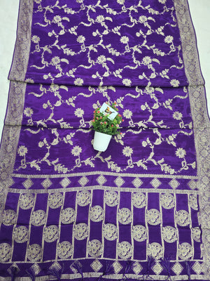 Elevate your traditional collection with this exquisite Crush Crepe Banarasi Saree featuring an all-over floral jaal weave. Designed in a rich royal purple shade, the saree showcases intricate zari boota motifs along with a beautifully crafted boota jaal pattern border that enhances its regal Banarasi charm.