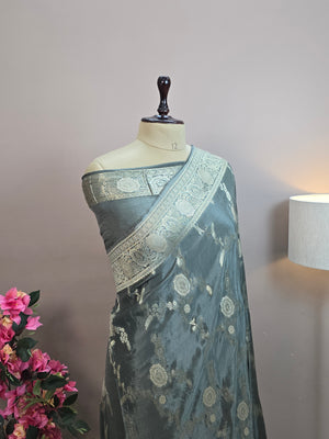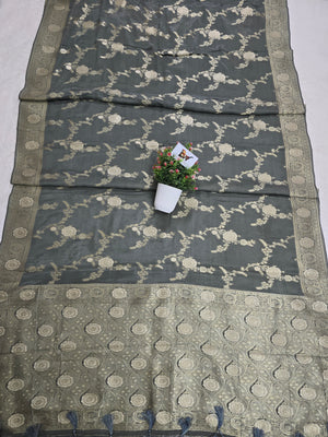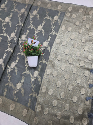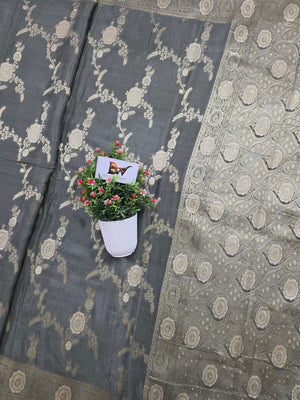 Elevate your traditional collection with this exquisite Crush Crepe Banarasi Saree featuring an all-over floral jaal weave. Designed in a rich grey shade, the saree showcases intricate zari boota motifs along with a beautifully crafted boota jaal pattern border that enhances its regal Banarasi charm.