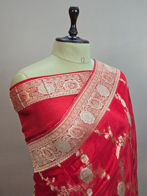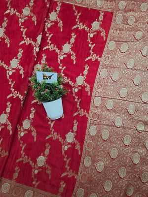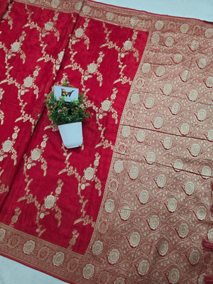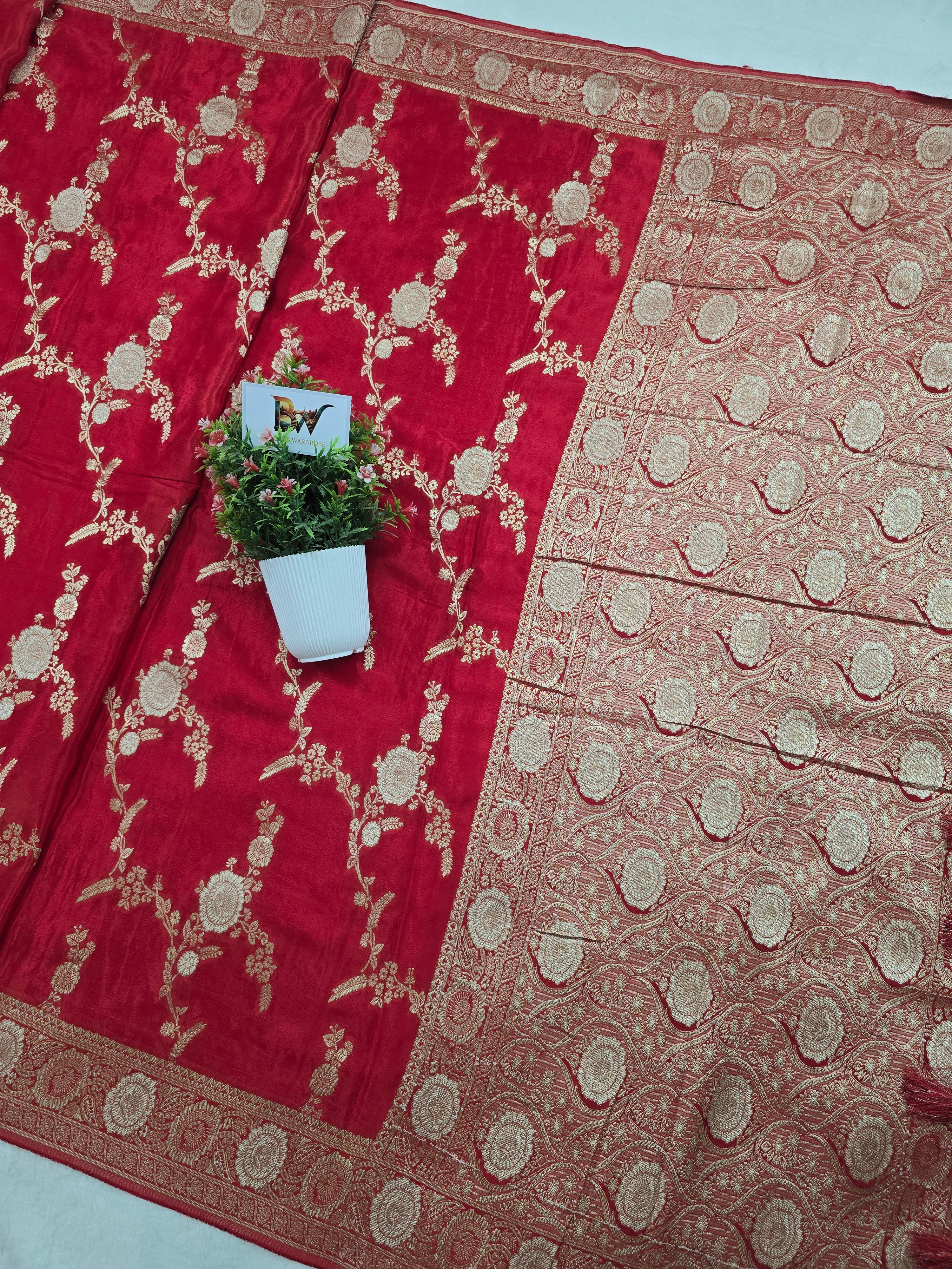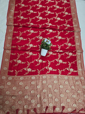 Elevate your traditional collection with this exquisite Crush Crepe Banarasi Saree featuring an all-over floral jaal weave. Designed in a rich red shade, the saree showcases intricate zari boota motifs along with a beautifully crafted boota jaal pattern border that enhances its regal Banarasi charm.