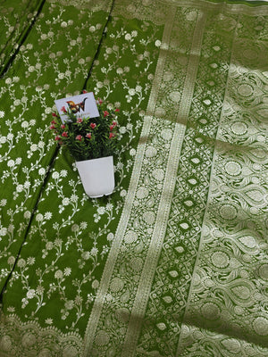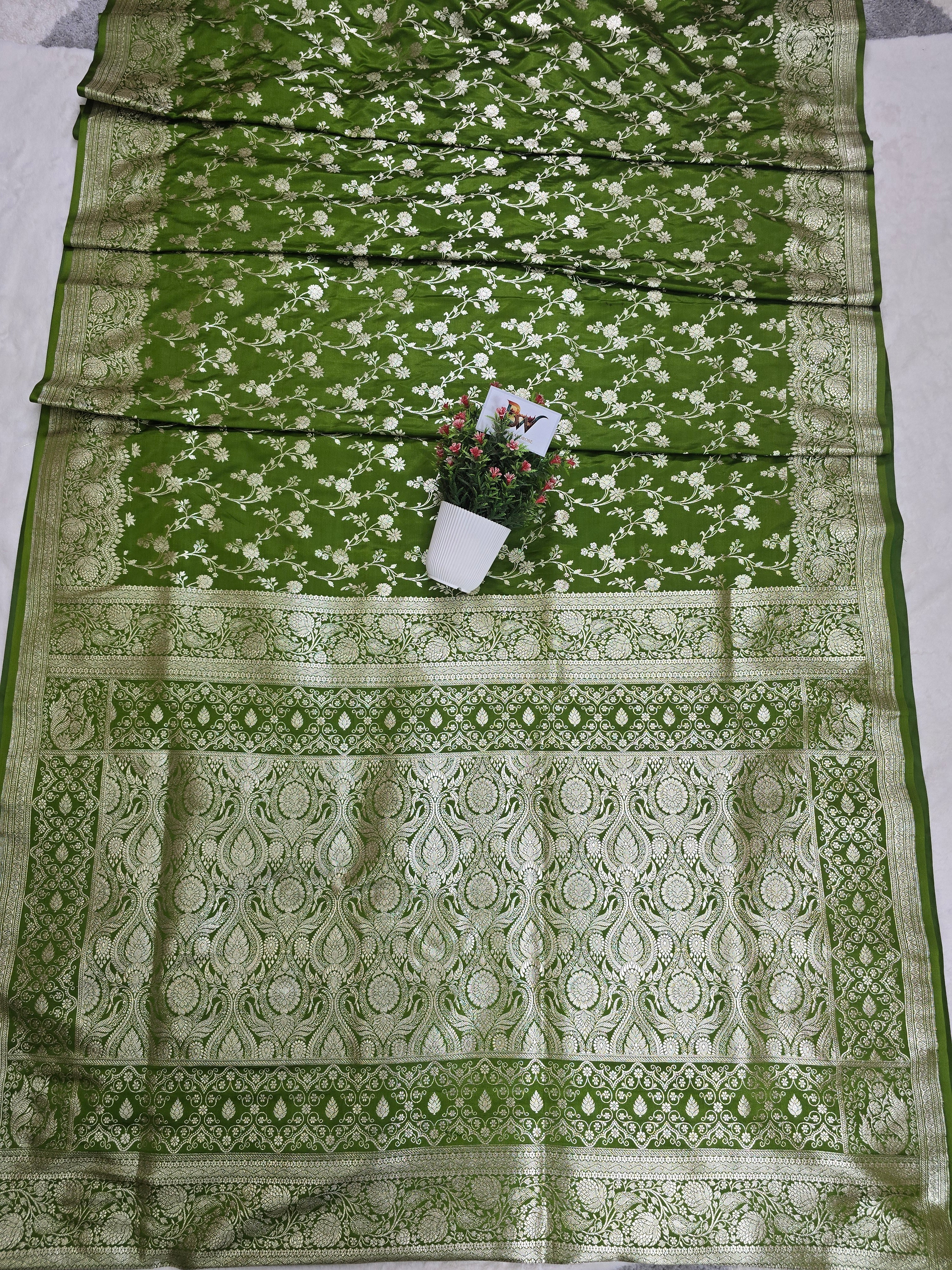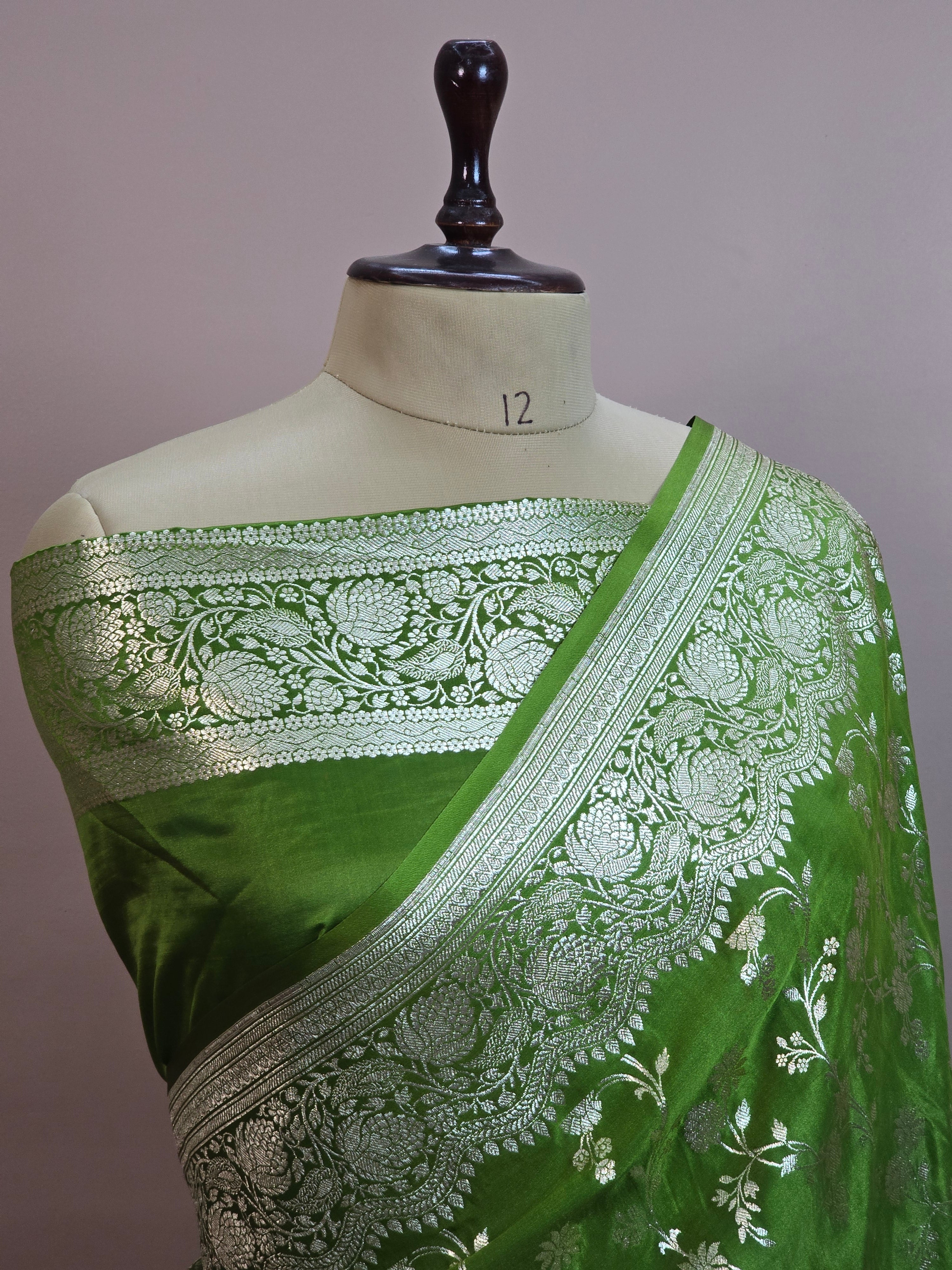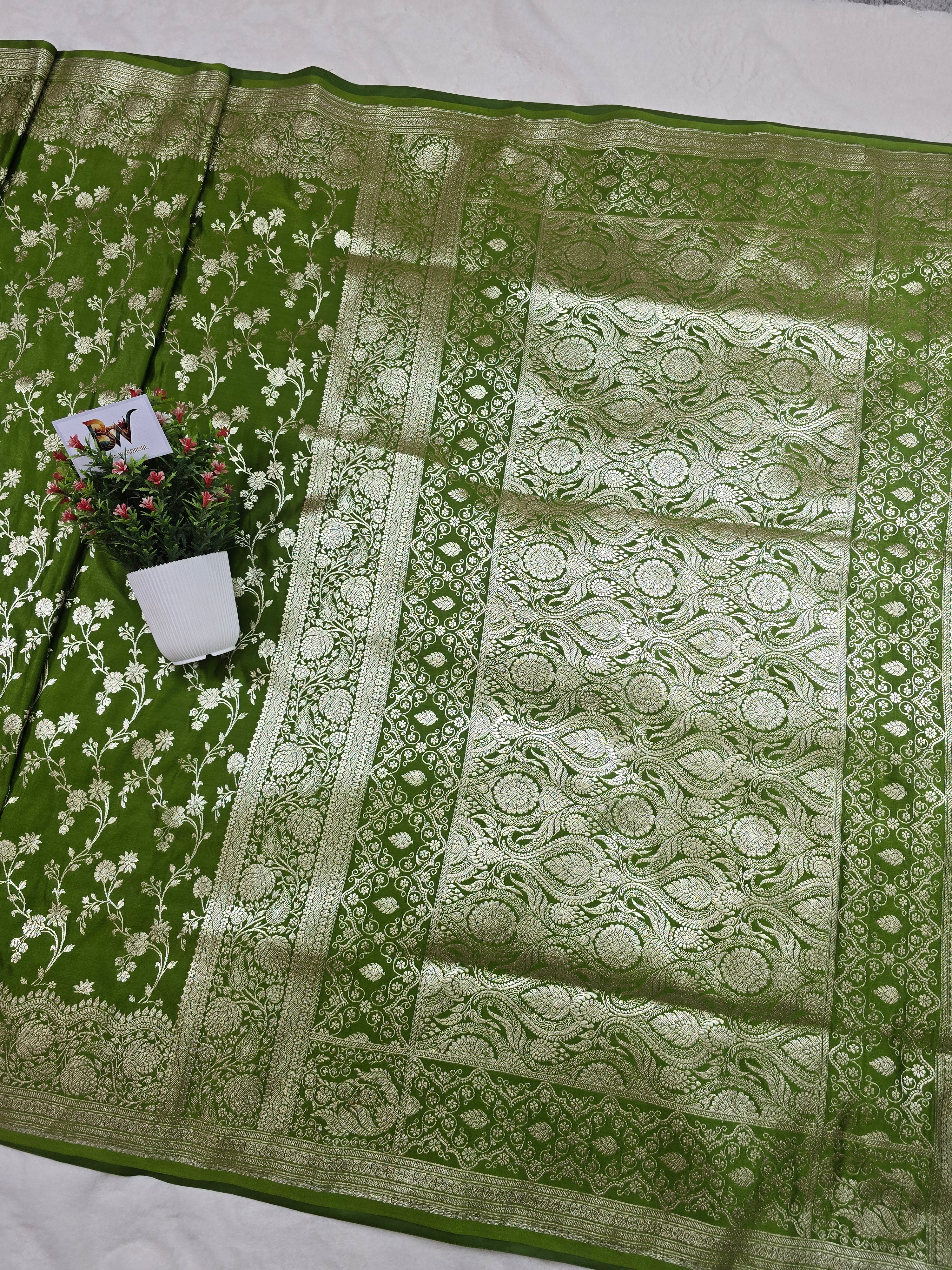 Malai Katan Satin Silk Banarasi Saree - Pista Green Body with All Over Jaal