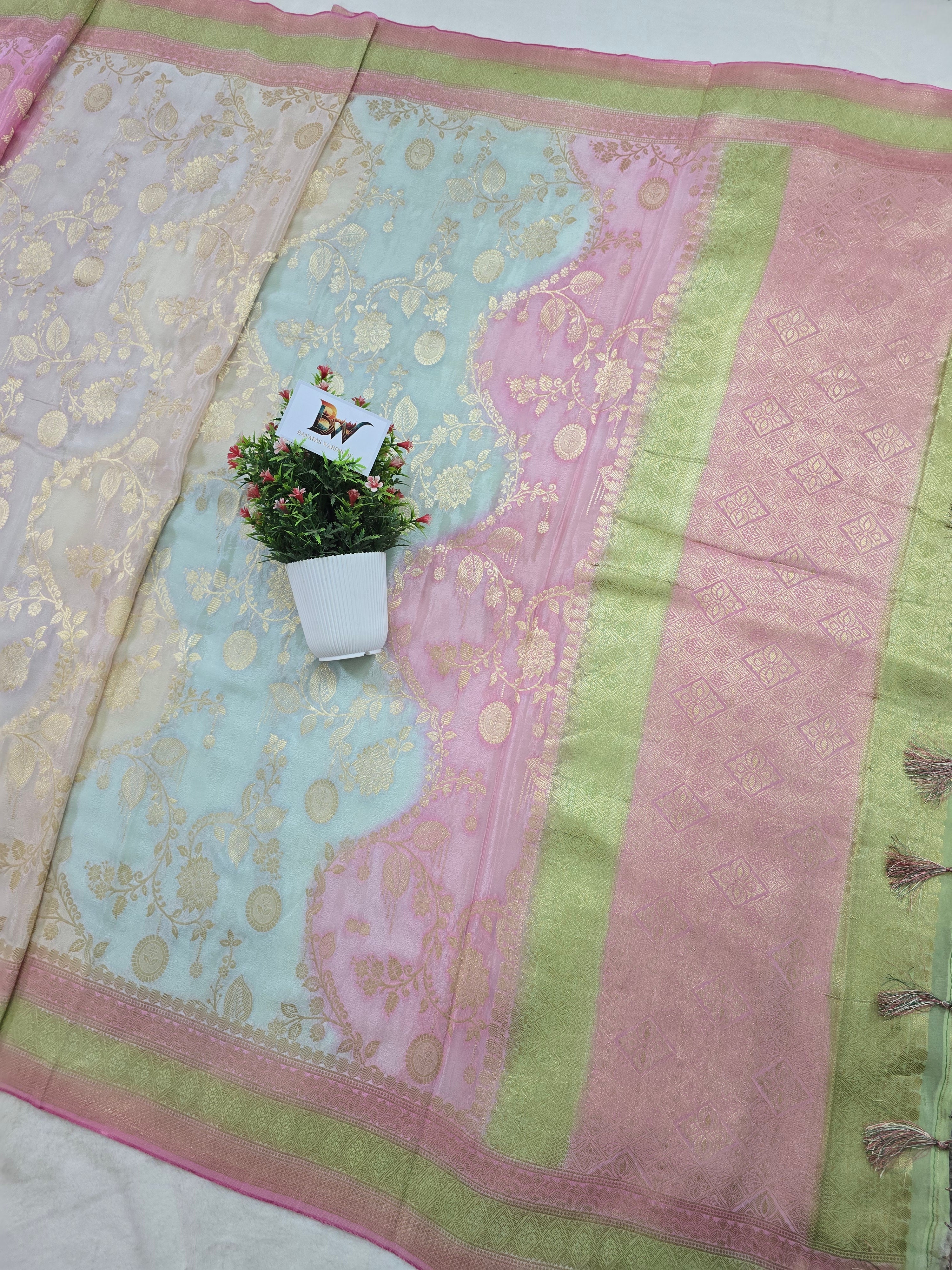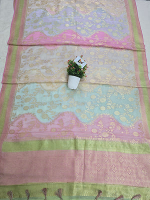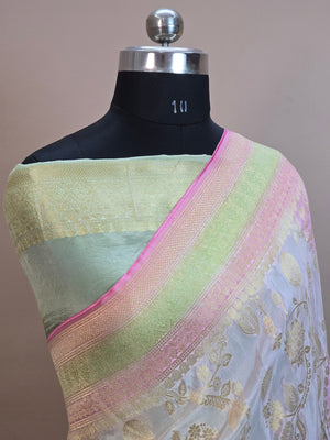 Crush Crepe Light MultiColor Rangkaat Jaal Banarasi Saree with Boota & Tricolour Border