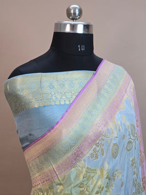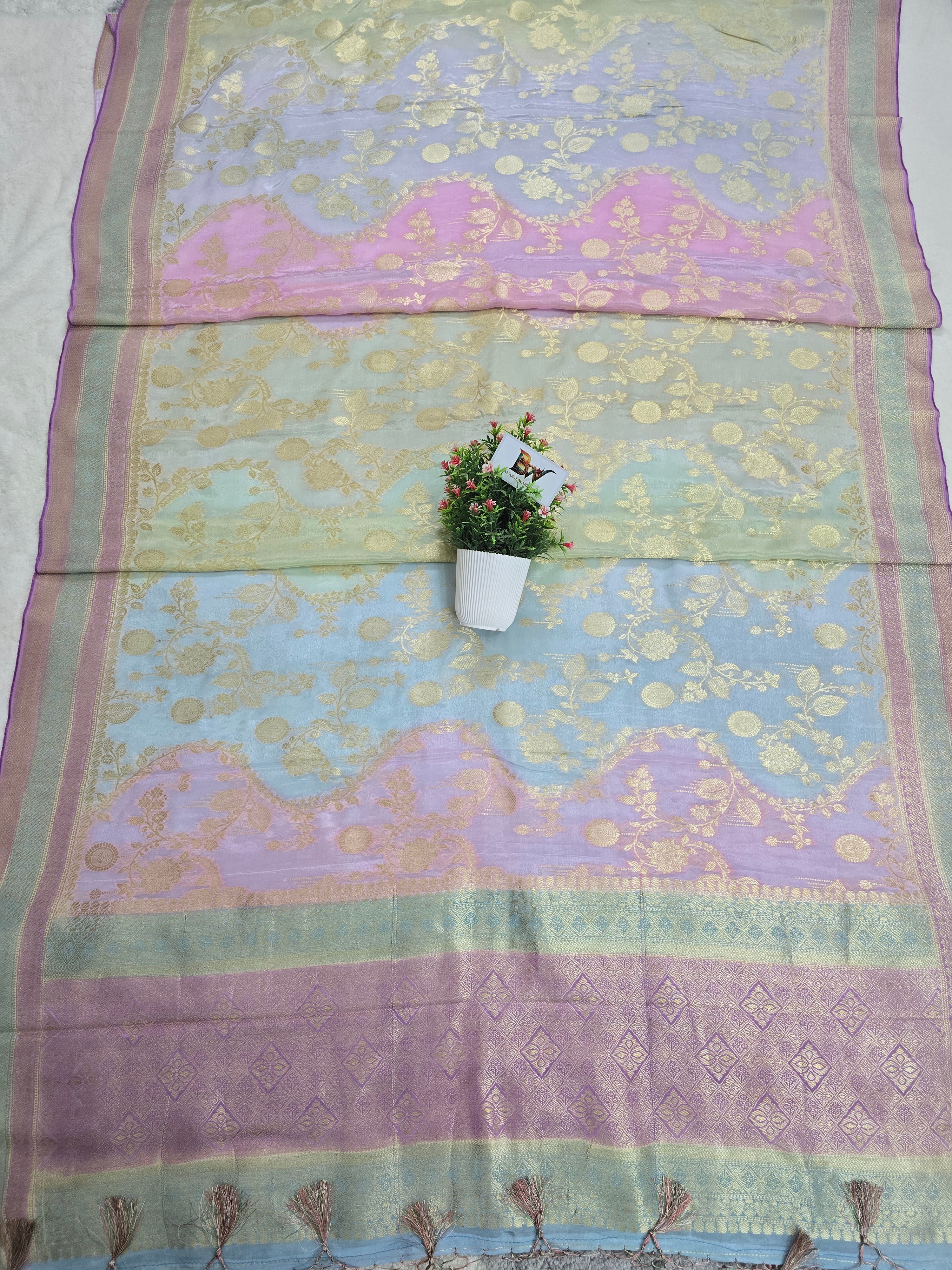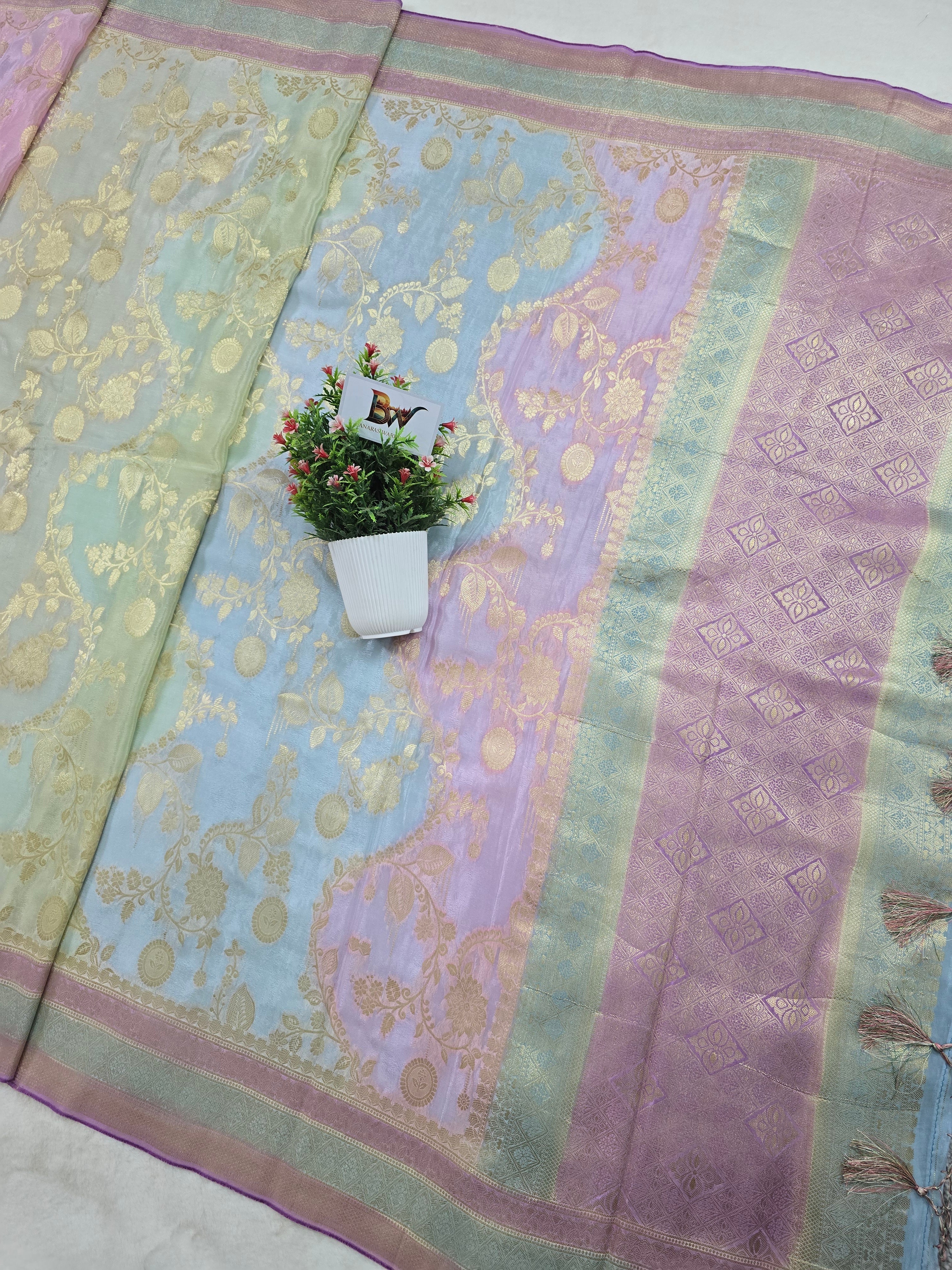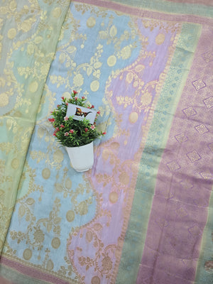 Crush Crepe Light MultiColor Rangkaat Jaal Banarasi Saree with Boota & Tricolour Border
