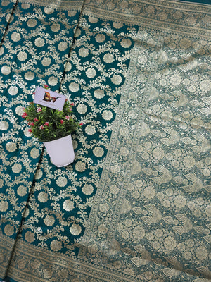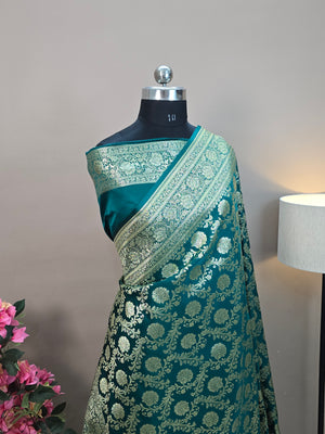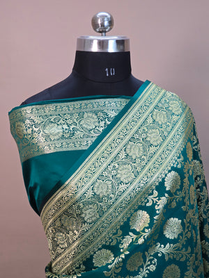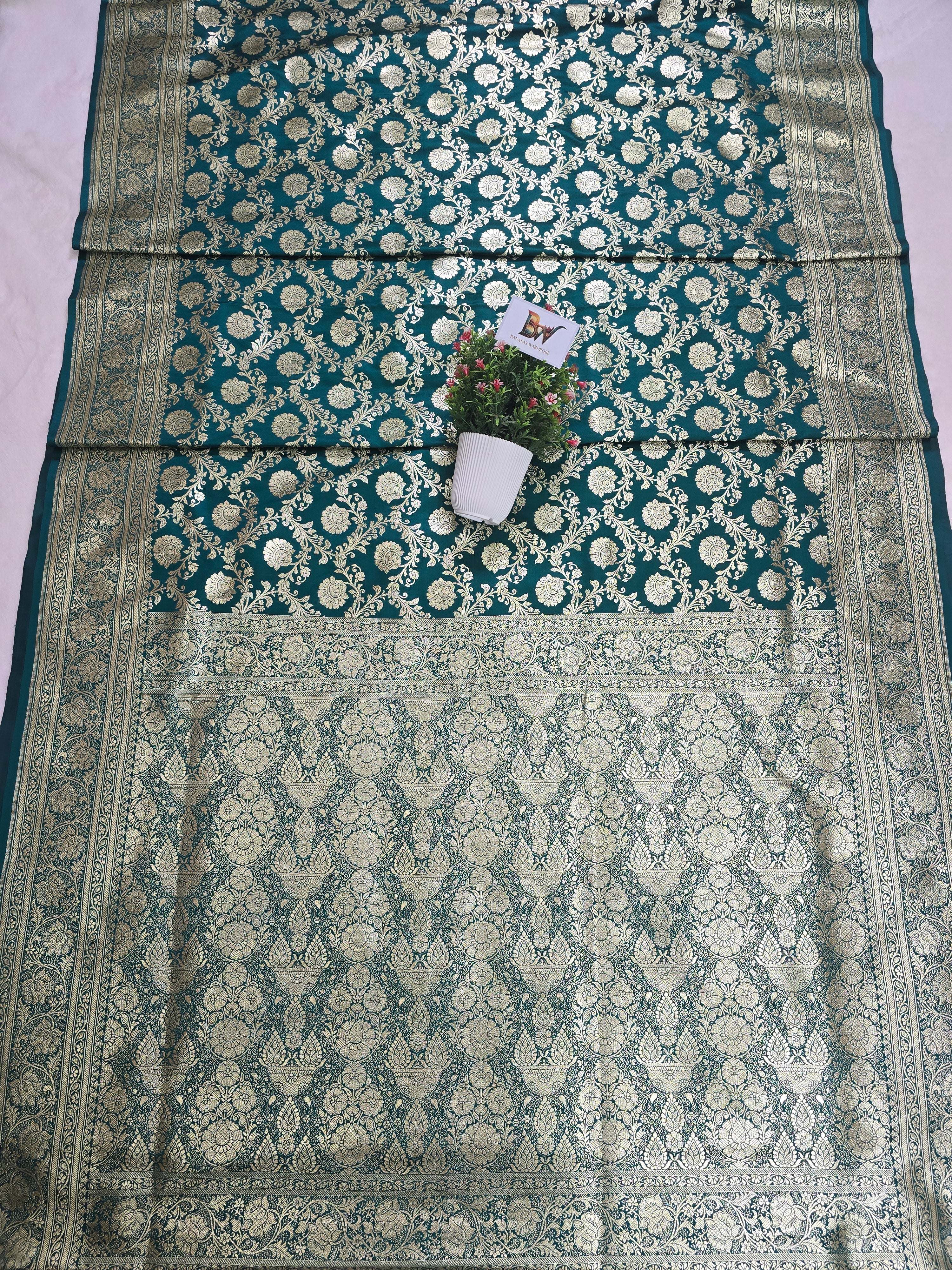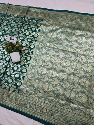 Experience classic Banarasi artistry with this Satin Katan Silk Jaal Banarasi Saree, featuring a rich sea green body adorned with an exquisite all-over gold zari jaal. The intricate floral patterns and the beautifully detailed zari border give the saree a regal, luxurious appeal.