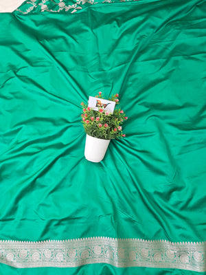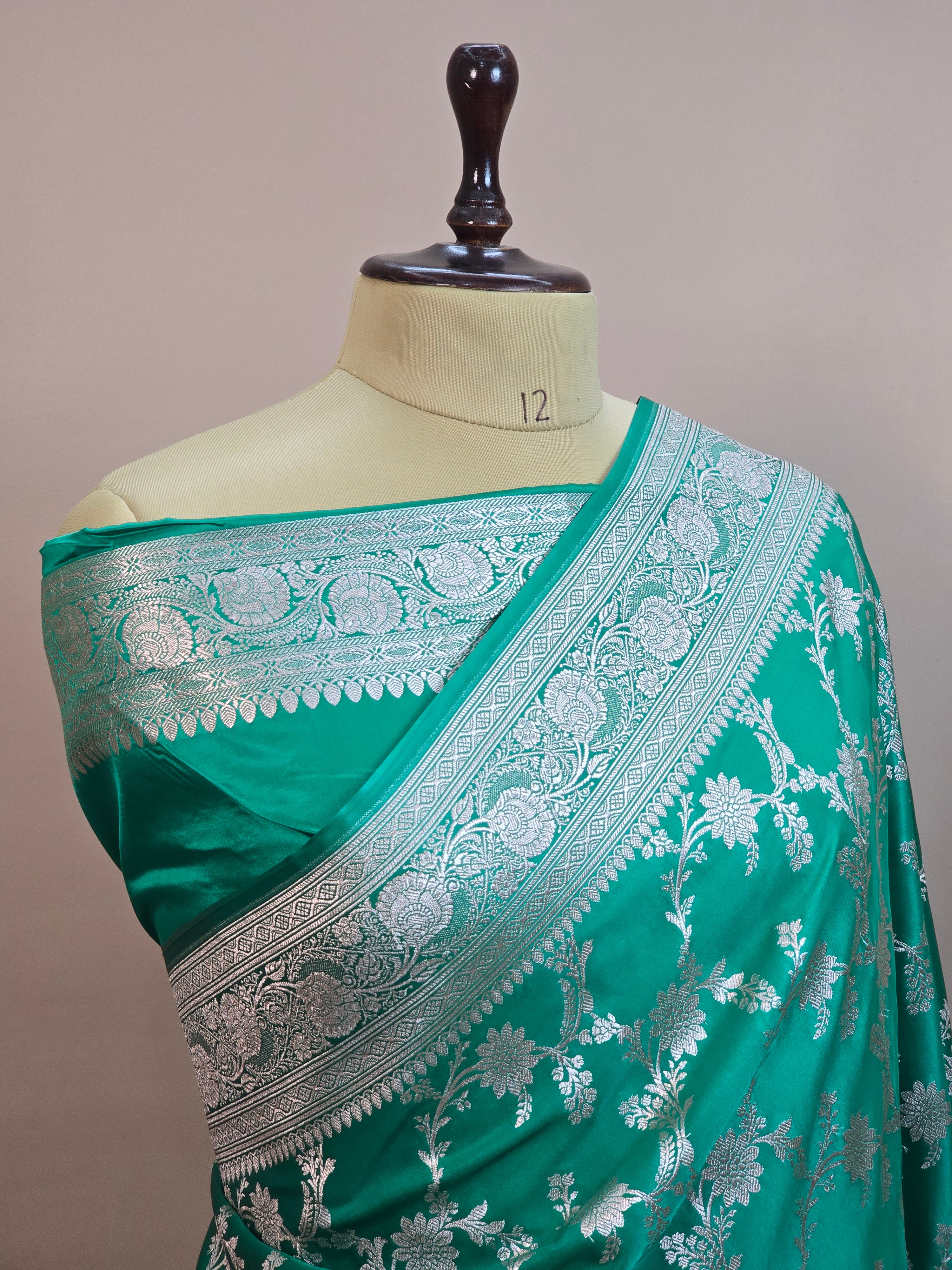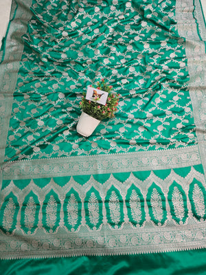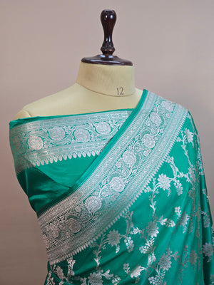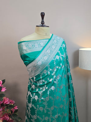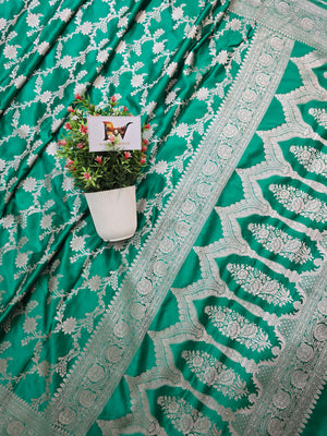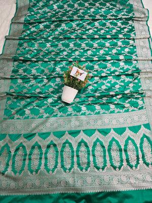 Mashru Katan Silk Banarasi Saree - Sea Green Body with Silver Zari All Over Jaal