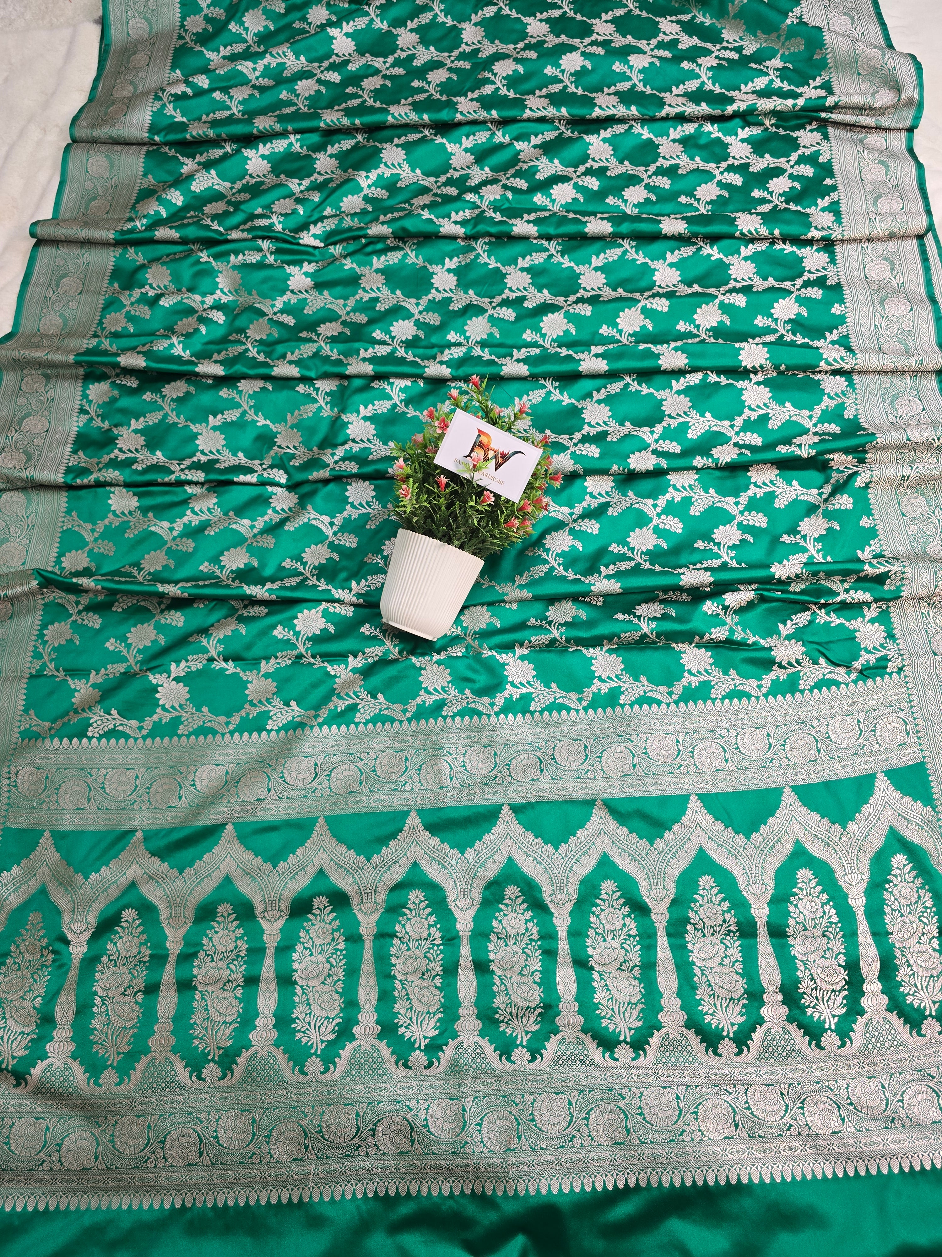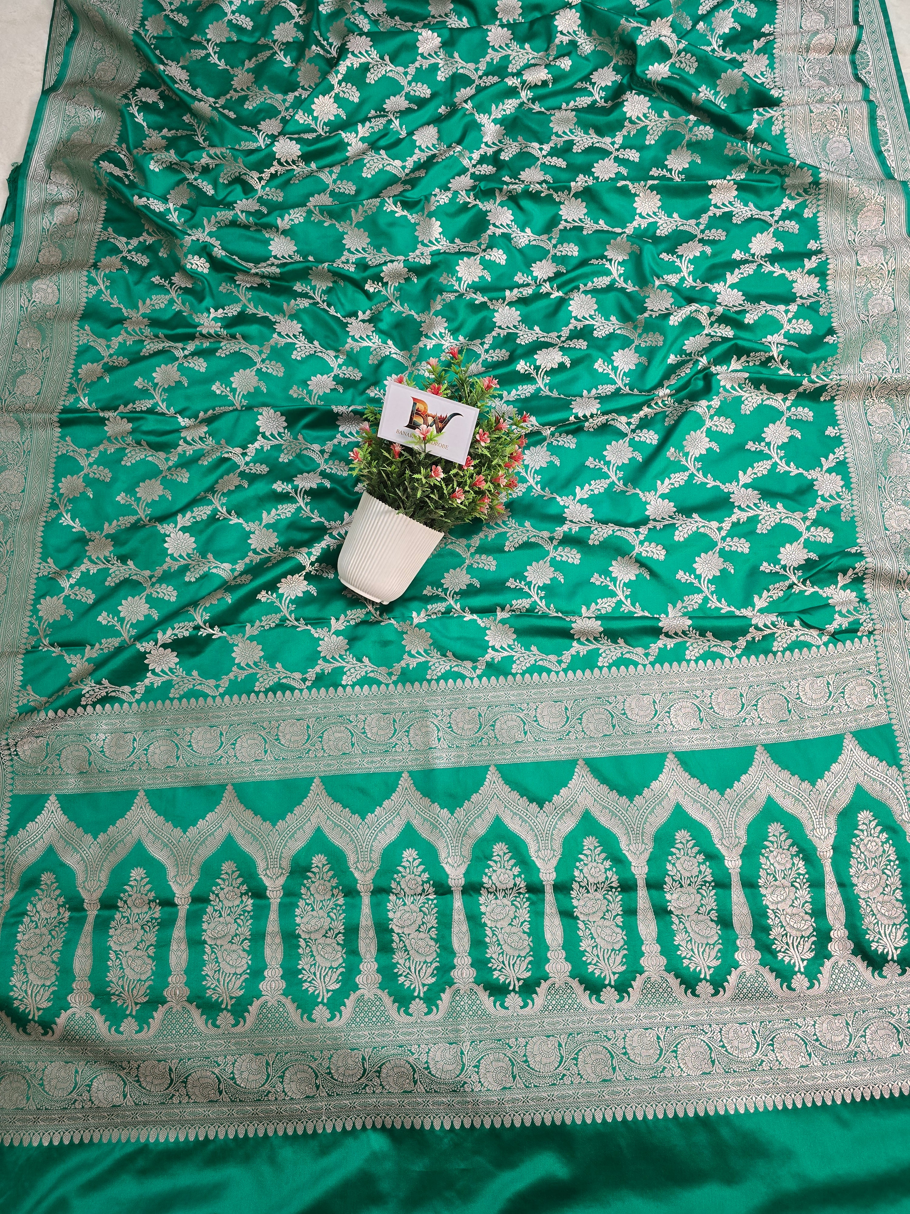 The highlight of this piece is its silver zari floral jaal pattern border, adding a regal Banarasi charm while maintaining a soft, smooth, and lustrous drape. Perfect for weddings, parties, festive occasions, and traditional events, this saree blends heritage artistry with modern sophistication.