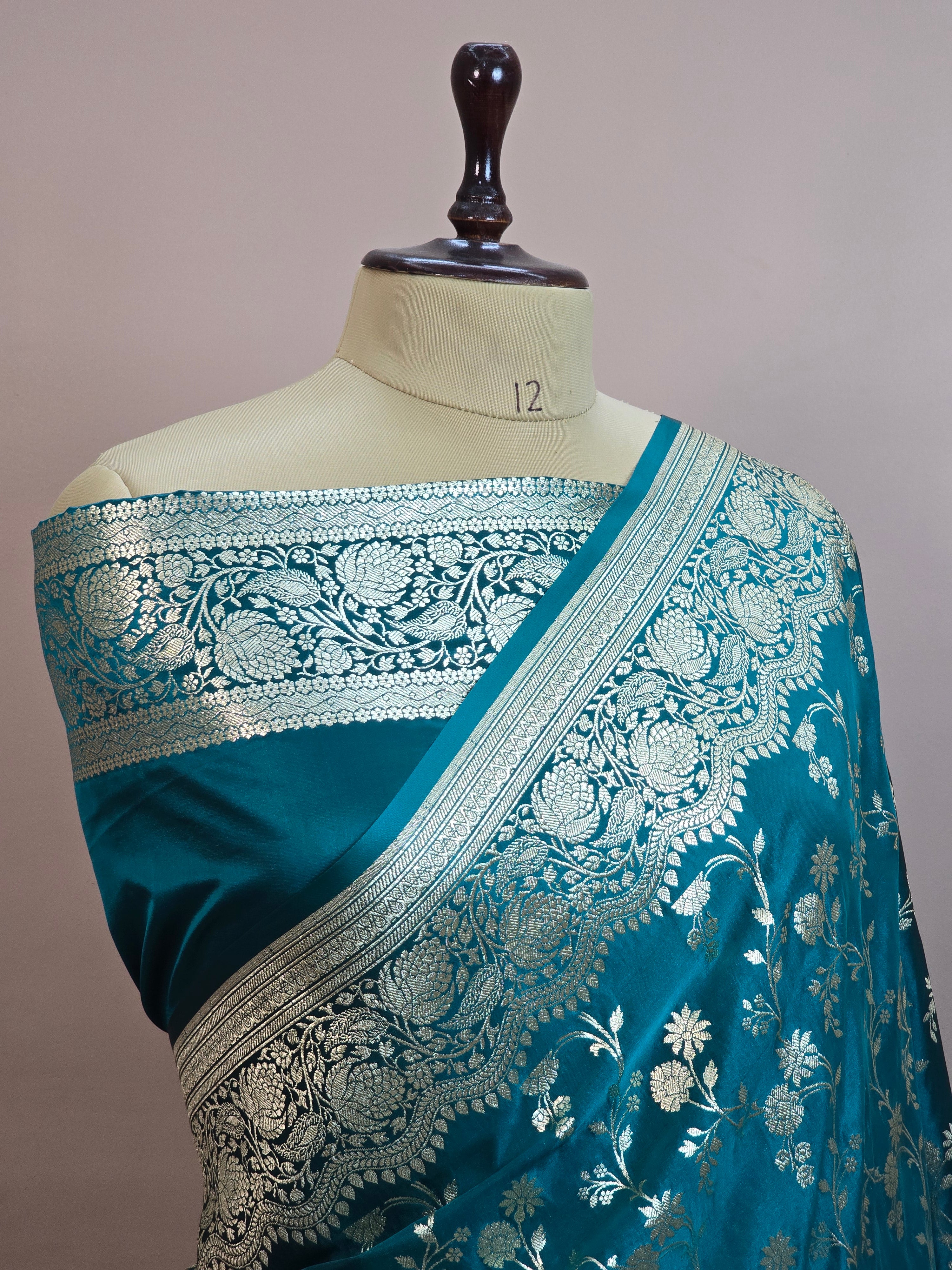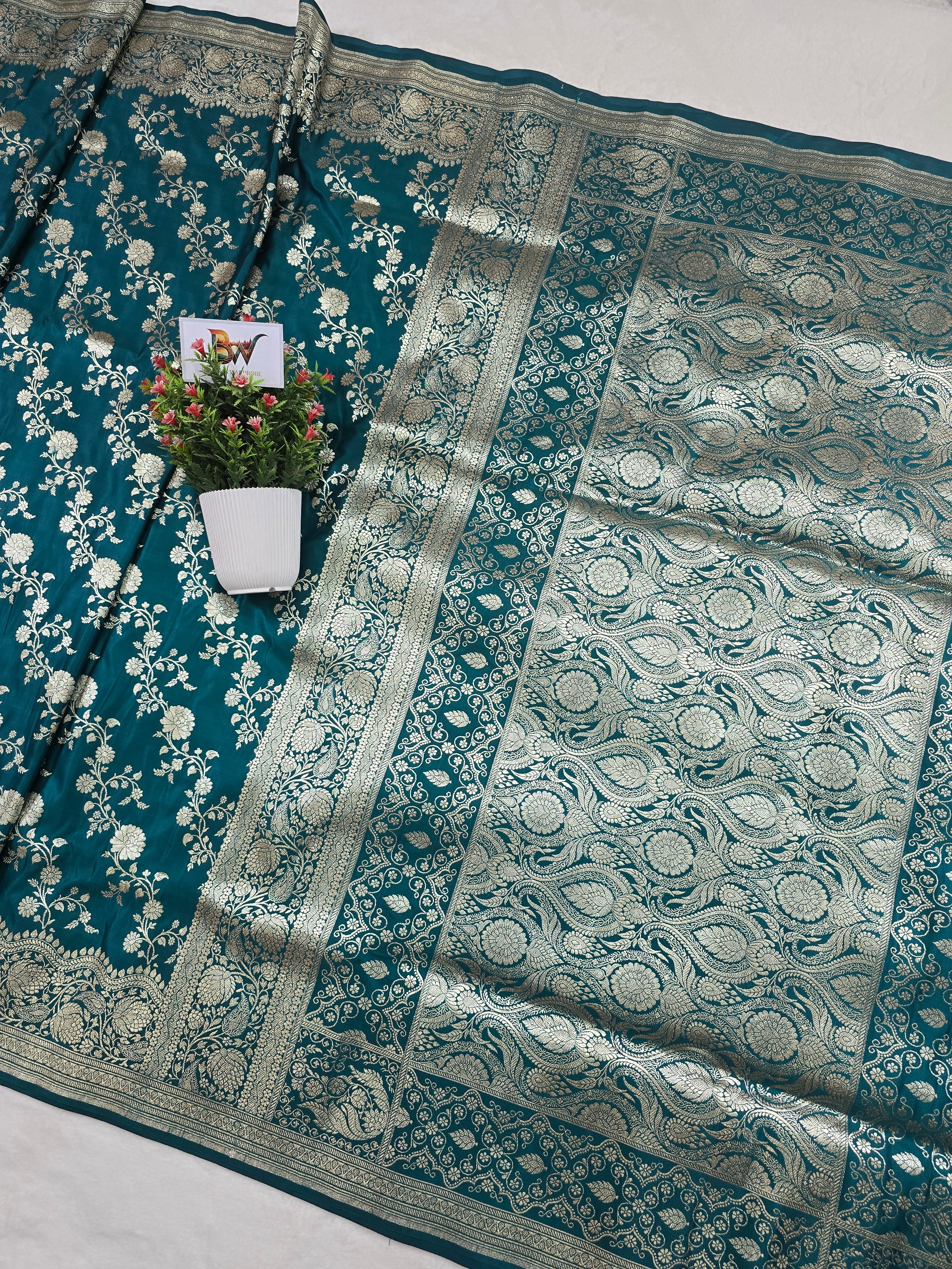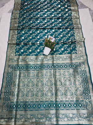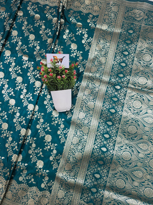 Malai Katan Satin Silk Banarasi Saree - Firozi Blue Body with All Over Jaal