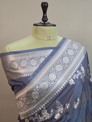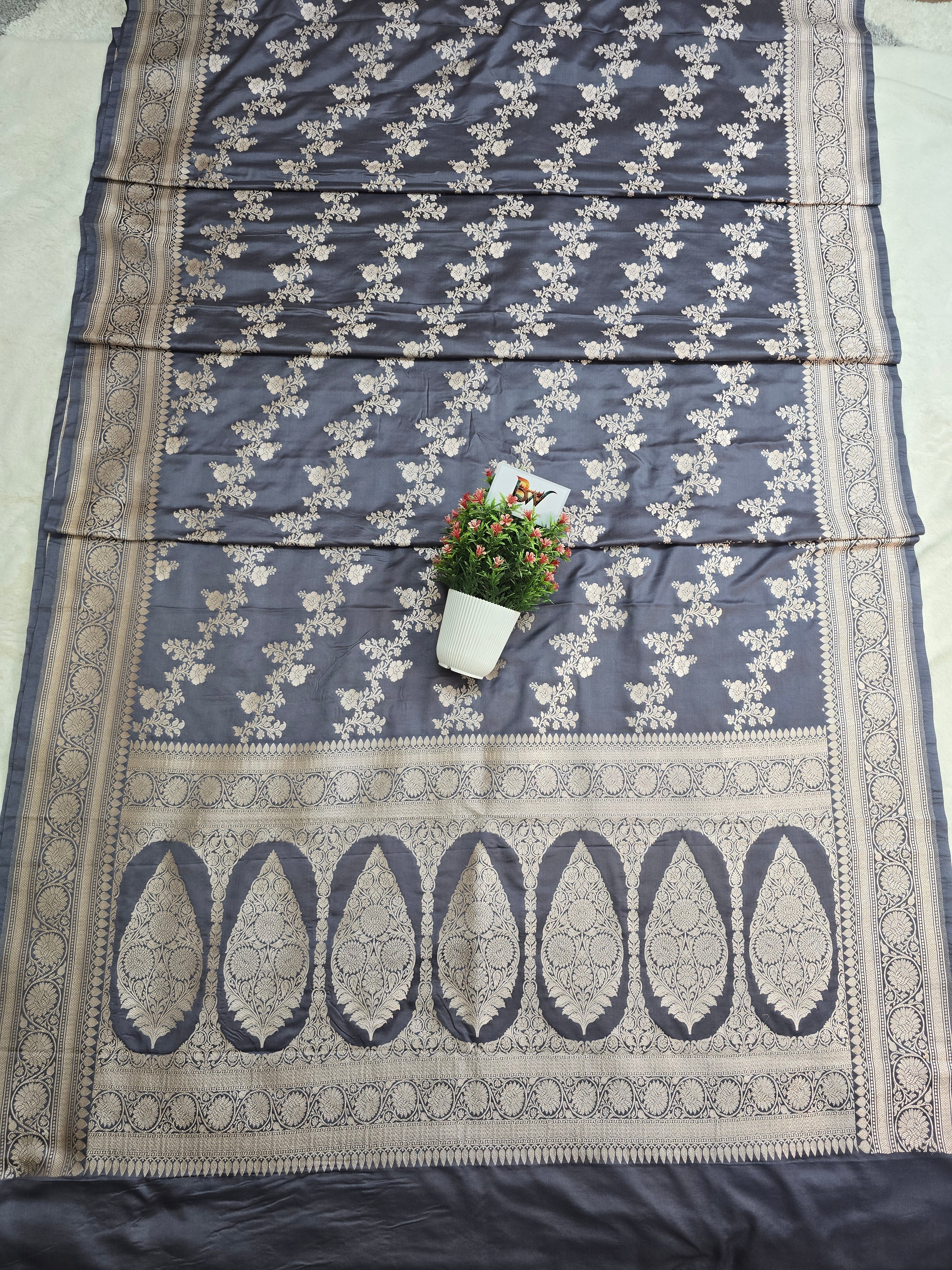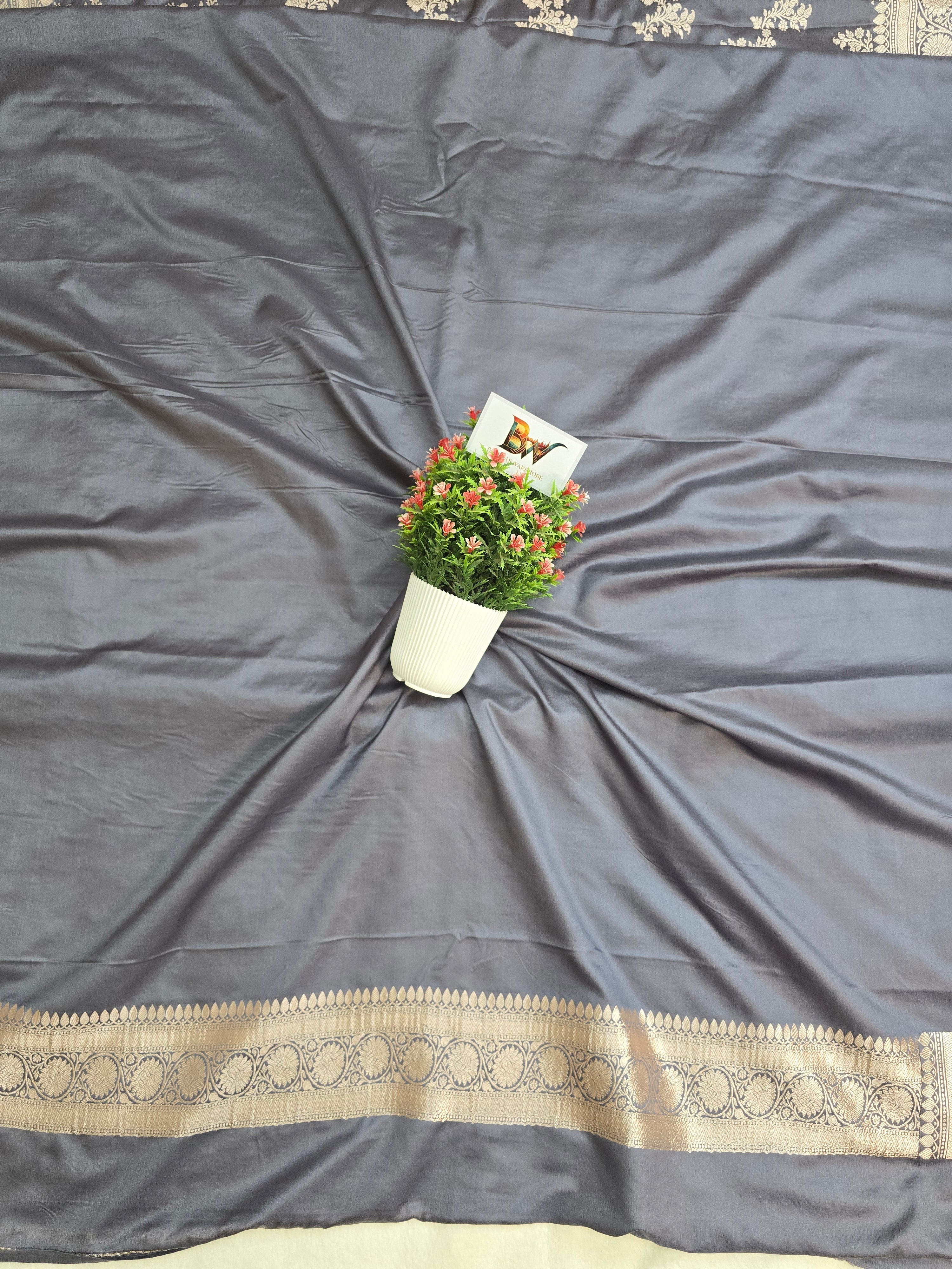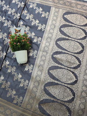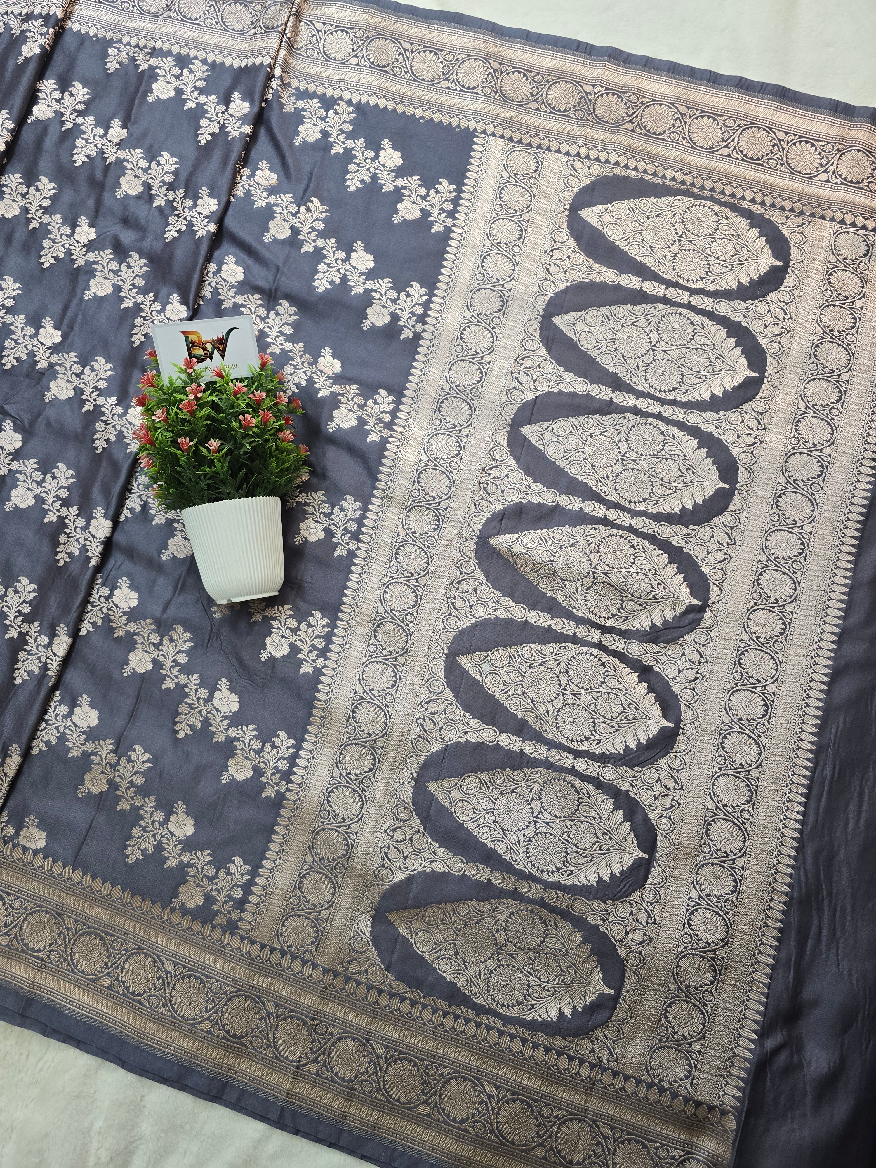 Mashru Katan Silk Banarasi Saree – Grey Body with All Over Silver Zari Jaal