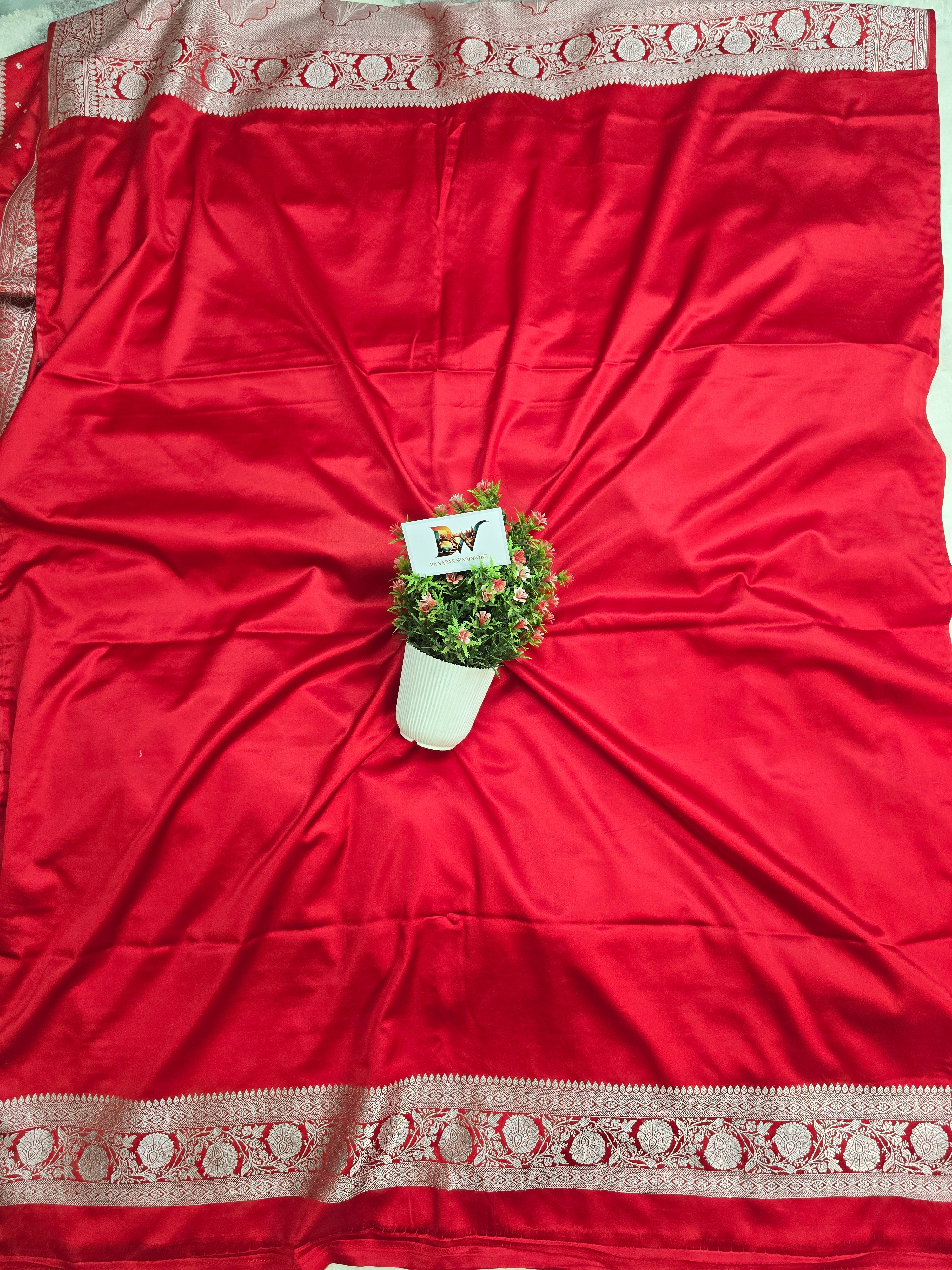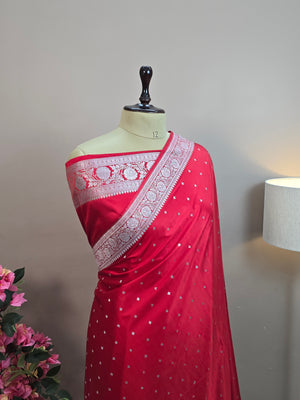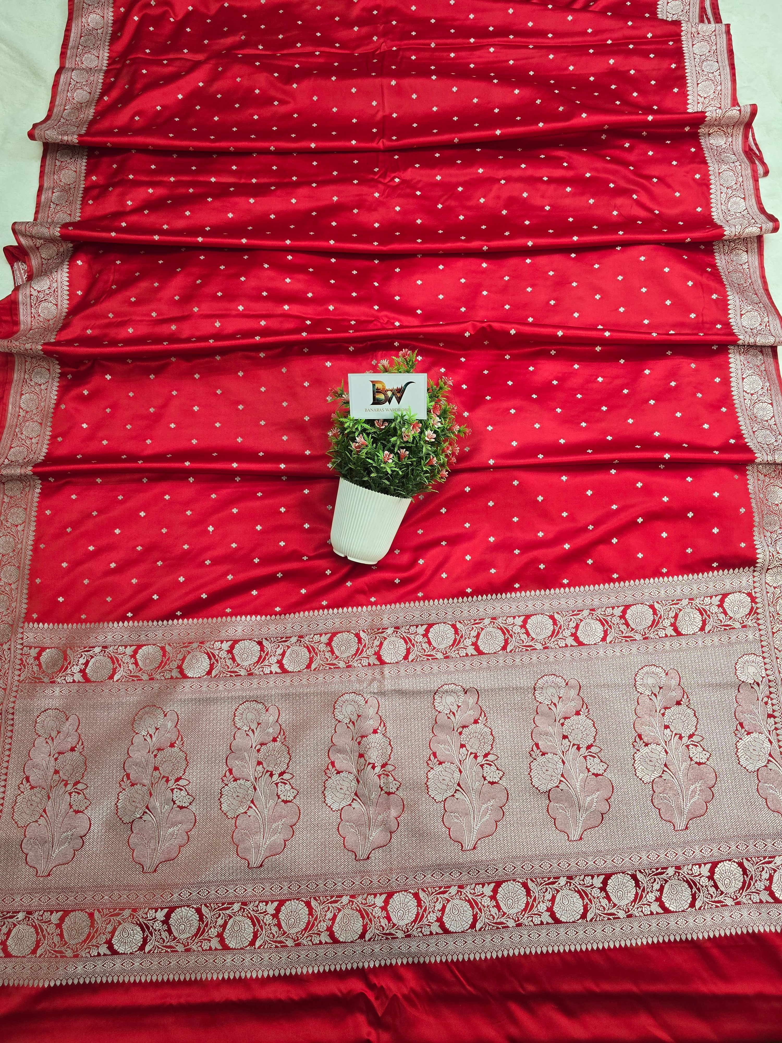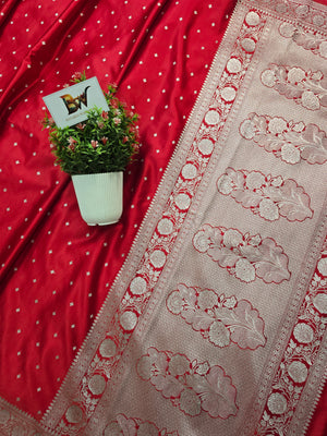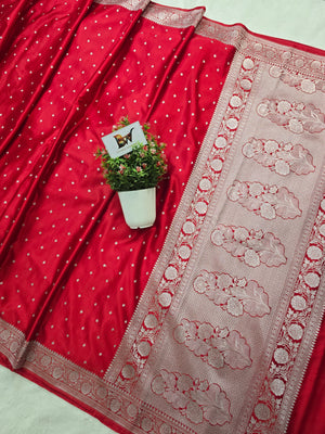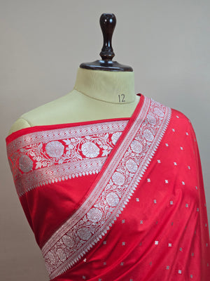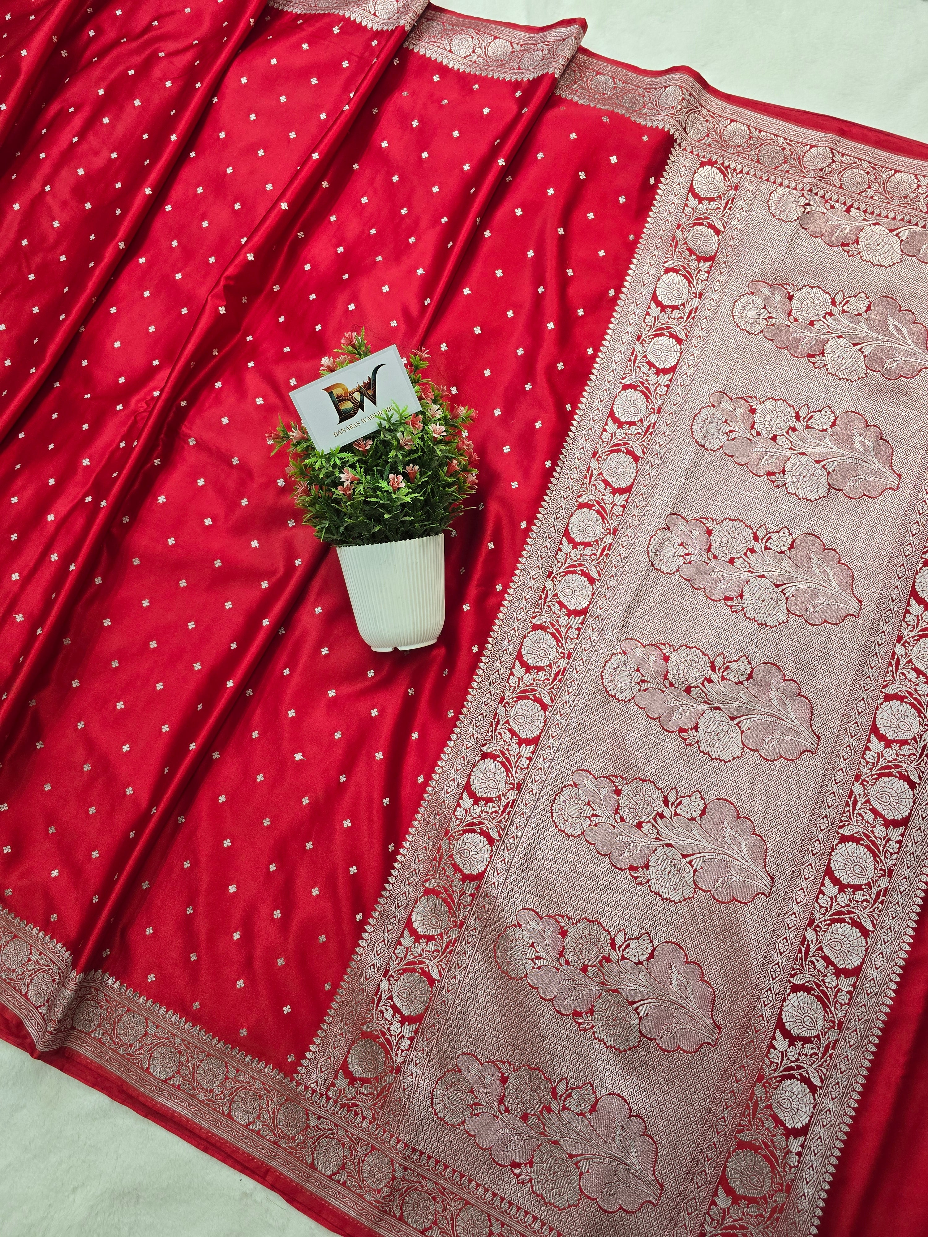 Mashru Katan Silk Banarasi Saree - Red Body with Silver Zari All Over Booti