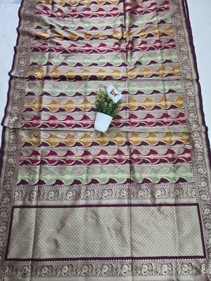 Elevate your festive wardrobe with this exquisite Pauri Katan Silk Rangkaat Banarasi Saree, crafted for those who appreciate rich textures and traditional craftsmanship. The saree features a beautiful multicolor rangkaat weave combined with luxurious katan silk, giving it a vibrant yet elegant appeal.