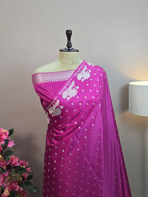 Elevate your ethnic wardrobe with this elegant Mashru Katan Silk Banarasi Saree in Rani Pink, beautifully crafted for women who appreciate refined luxury and timeless Banarasi weaving. The saree features a rich rani pink body adorned with delicate rose-gold zari booti motifs, giving it a subtle yet stunning shimmer.