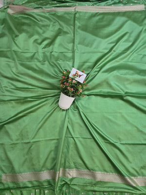 Elevate your ethnic wardrobe with this elegant Mashru Katan Silk Banarasi Saree in Sea Green, beautifully crafted for women who appreciate refined luxury and timeless Banarasi weaving. The saree features a rich mehendi body adorned with delicate rose-gold zari booti motifs, giving it a subtle yet stunning shimmer.