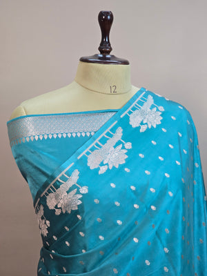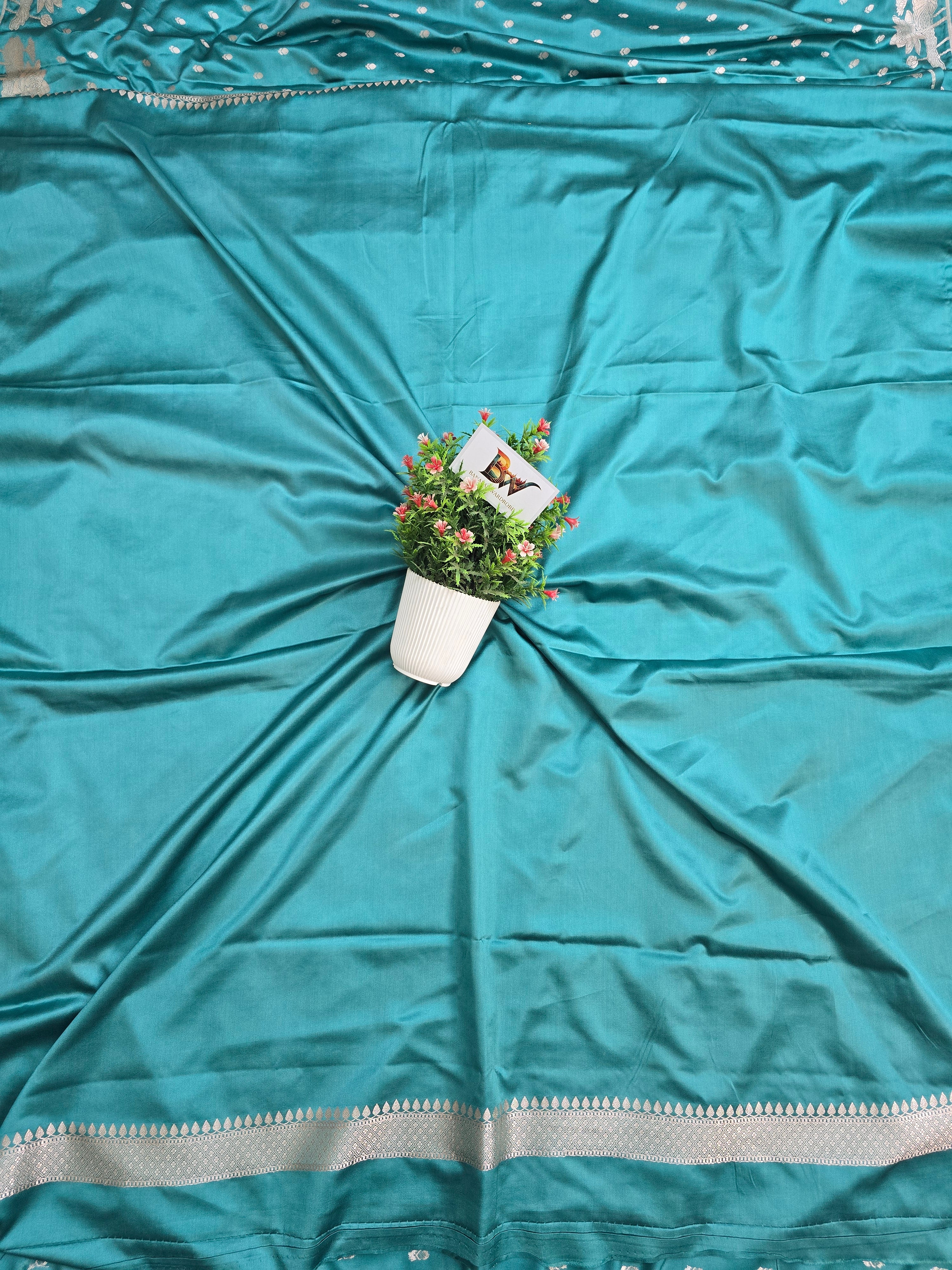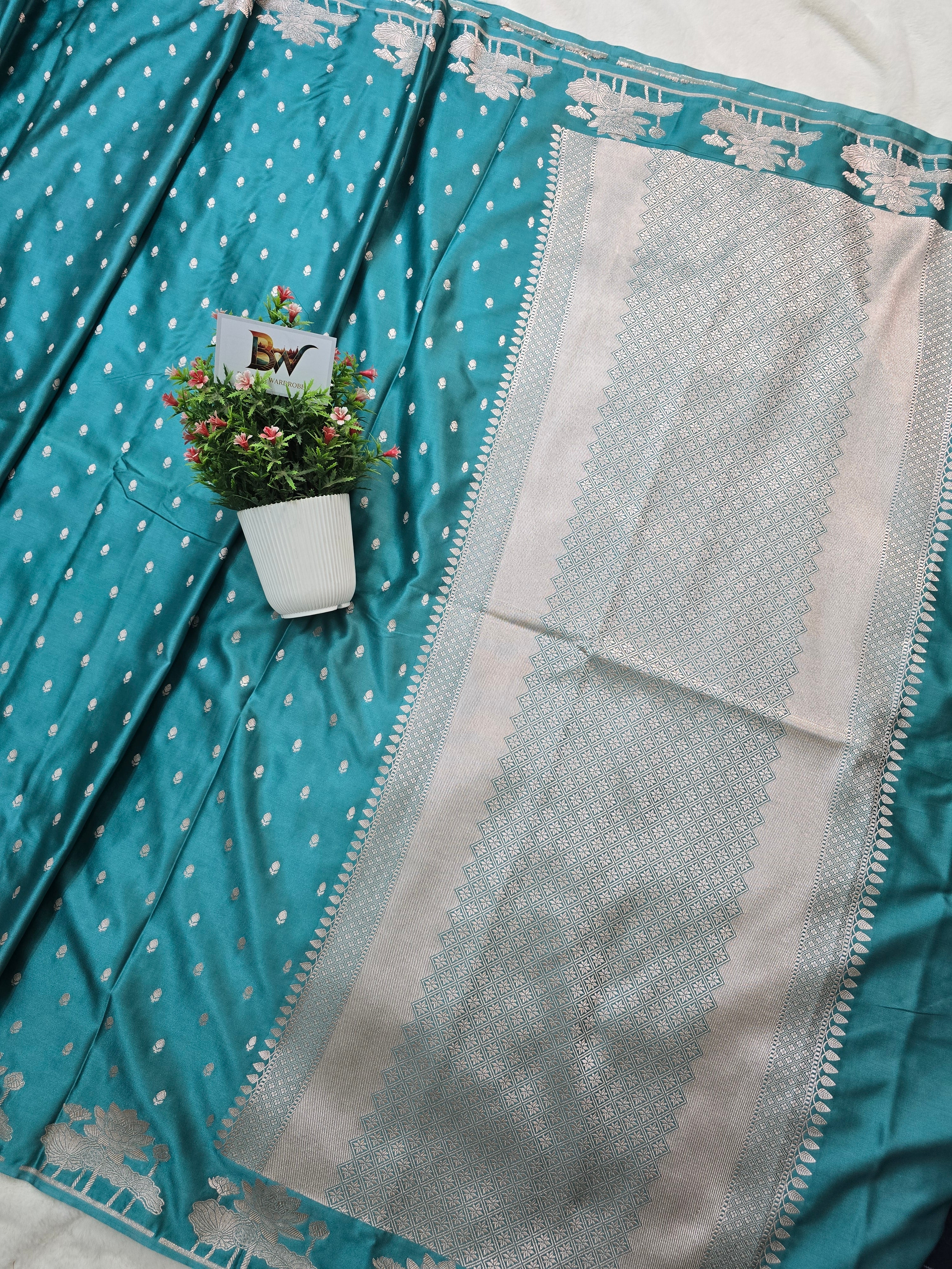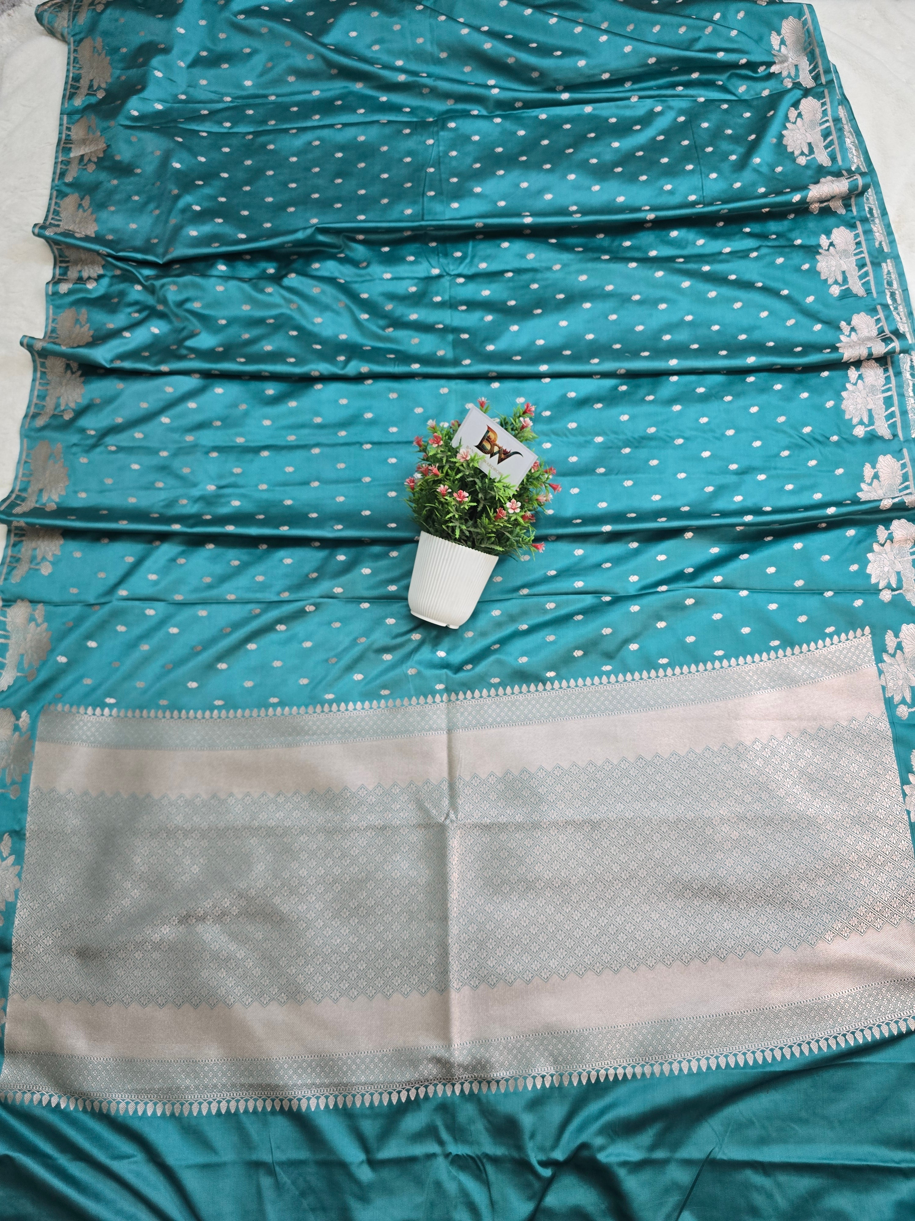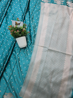 Mashru Katan Silk Banarasi Saree Open Border - Firozi Blue Body with All Over Booti