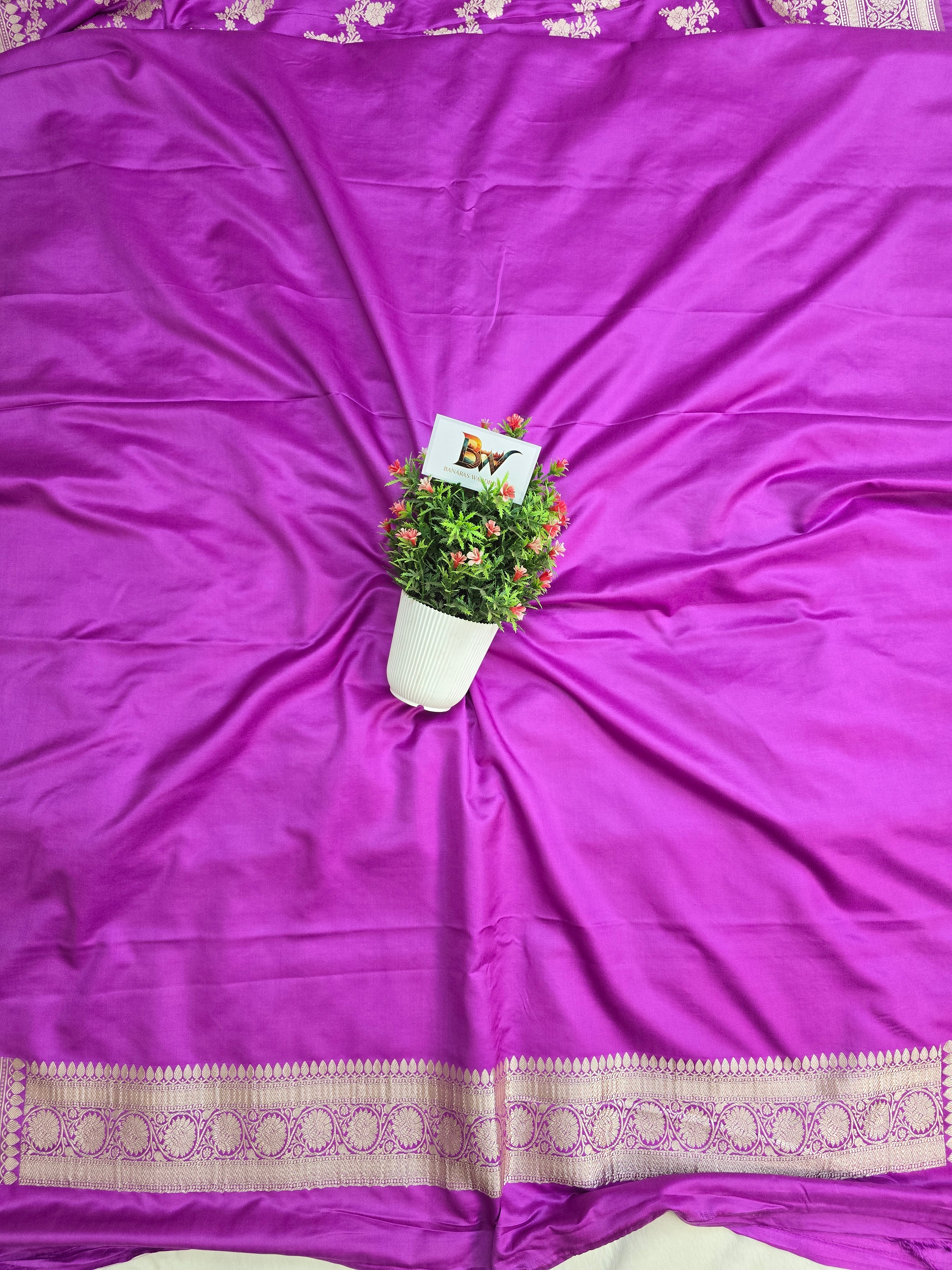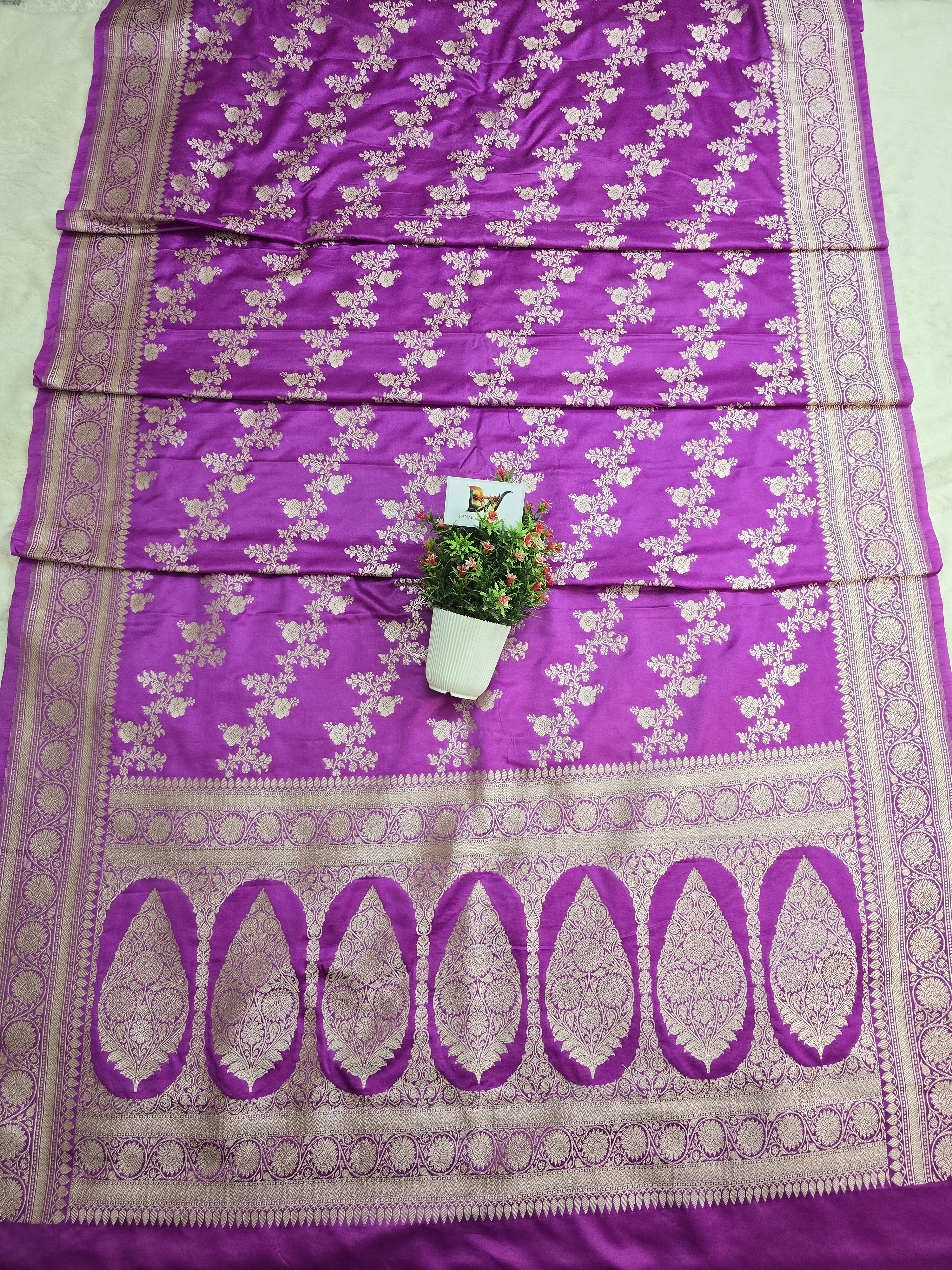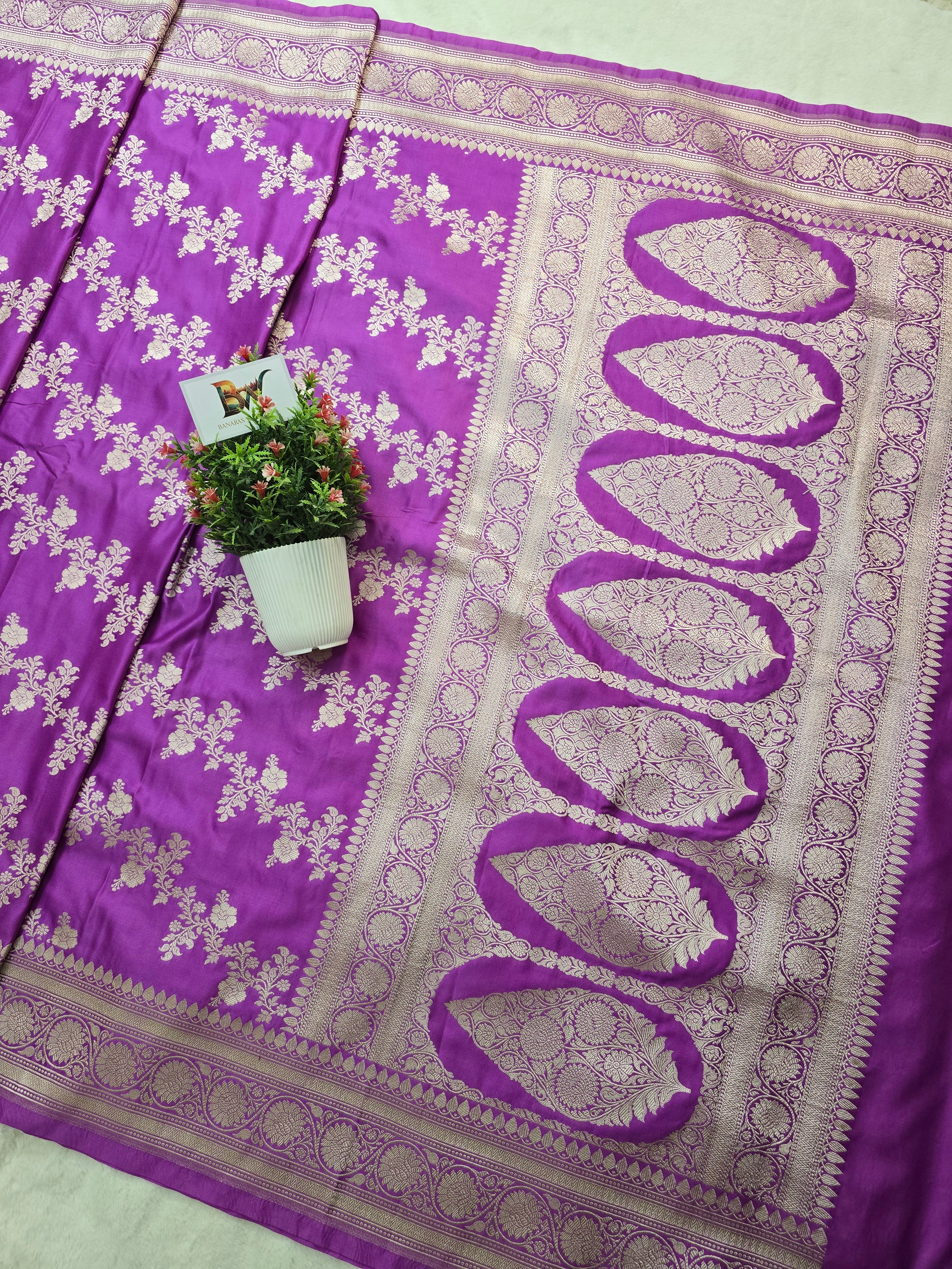 Elevate your ethnic wardrobe with this exquisite Mashru Katan Silk Banarasi Saree, crafted for women who love timeless elegance with a luxurious sheen. The saree features a rich purple body beautifully adorned with an all-over silver zari floral jaal, giving it a regal and graceful appeal.