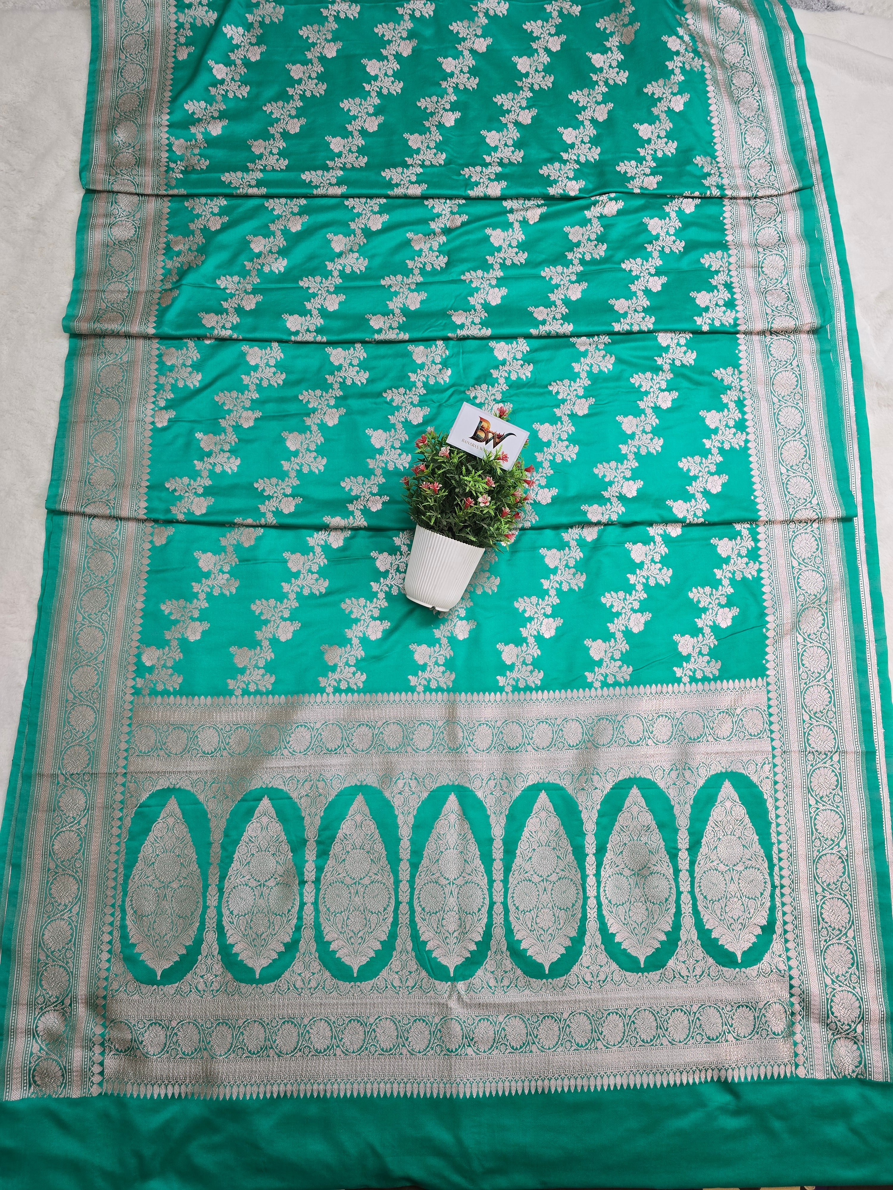 Elevate your ethnic wardrobe with this exquisite Mashru Katan Silk Banarasi Saree, crafted for women who love timeless elegance with a luxurious sheen. The saree features a rich sea green body beautifully adorned with an all-over silver zari floral jaal, giving it a regal and graceful appeal.