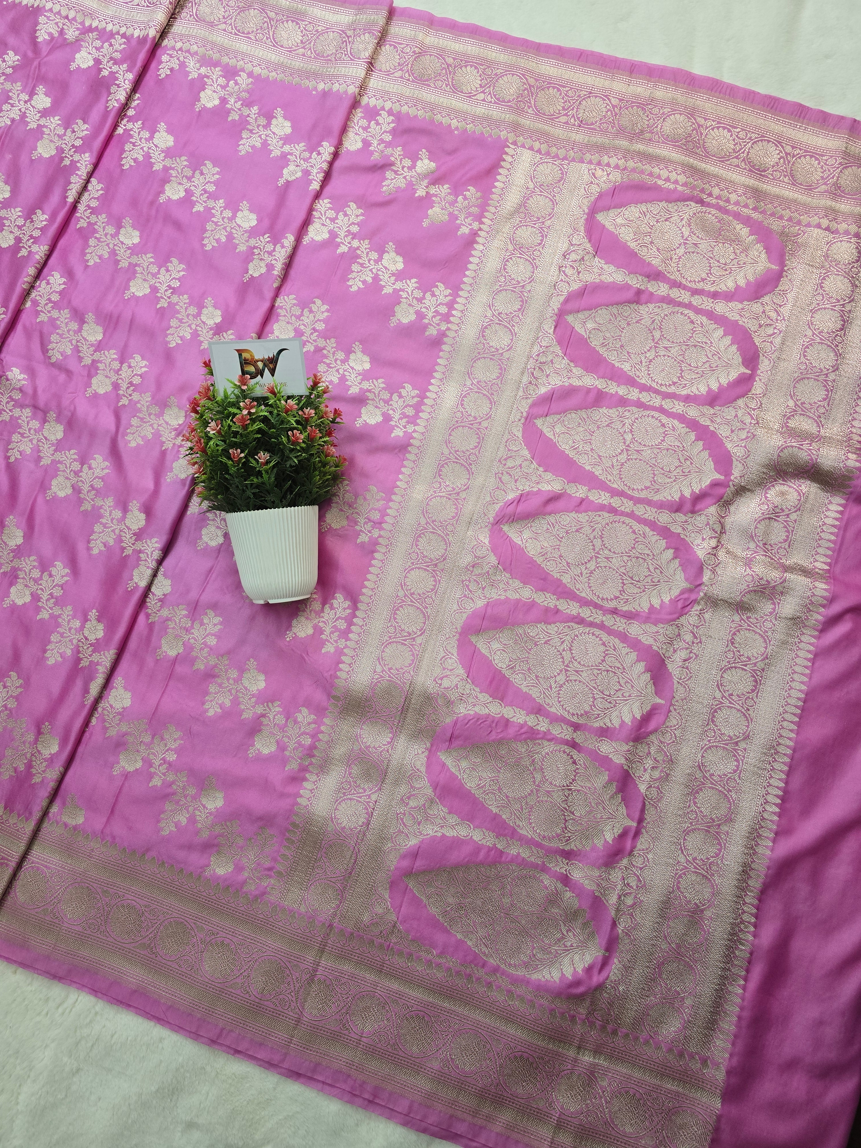 The floral jaal pattern border enhances the traditional Banarasi charm, while the smooth Mashru Katan Silk fabric ensures a soft, rich, and effortless drape. Perfect for weddings, festive occasions, parties, and special celebrations, this saree blends heritage craftsmanship with modern sophistication.