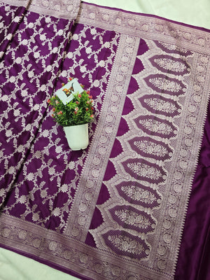 Elevate your festive and wedding wardrobe with this exquisite Mashru Katan Silk Jaal Saree, beautifully crafted with rich silver zari work. The saree features an elegant purple body adorned with intricate floral jaal motifs, giving it a luxurious and timeless appeal.