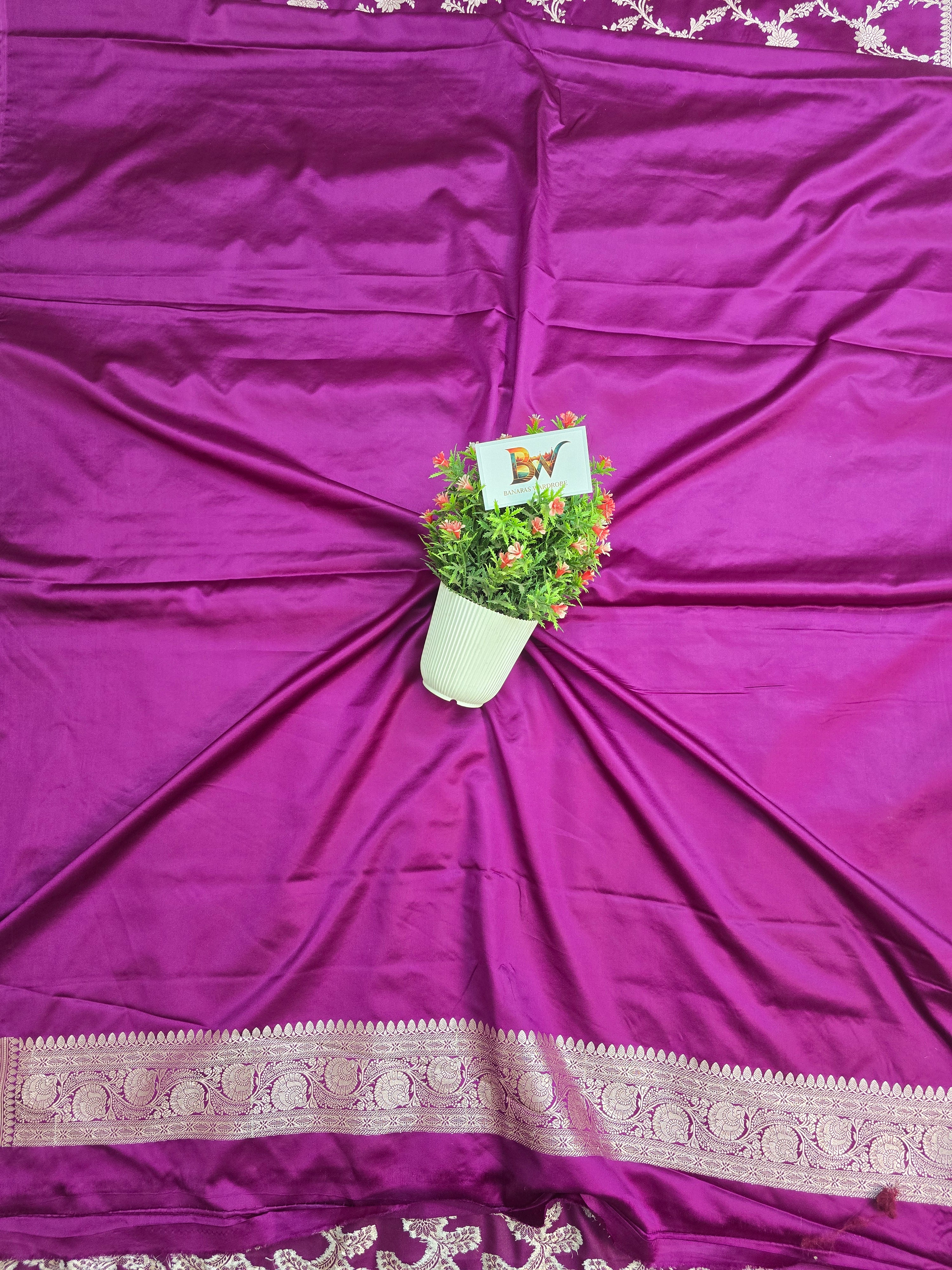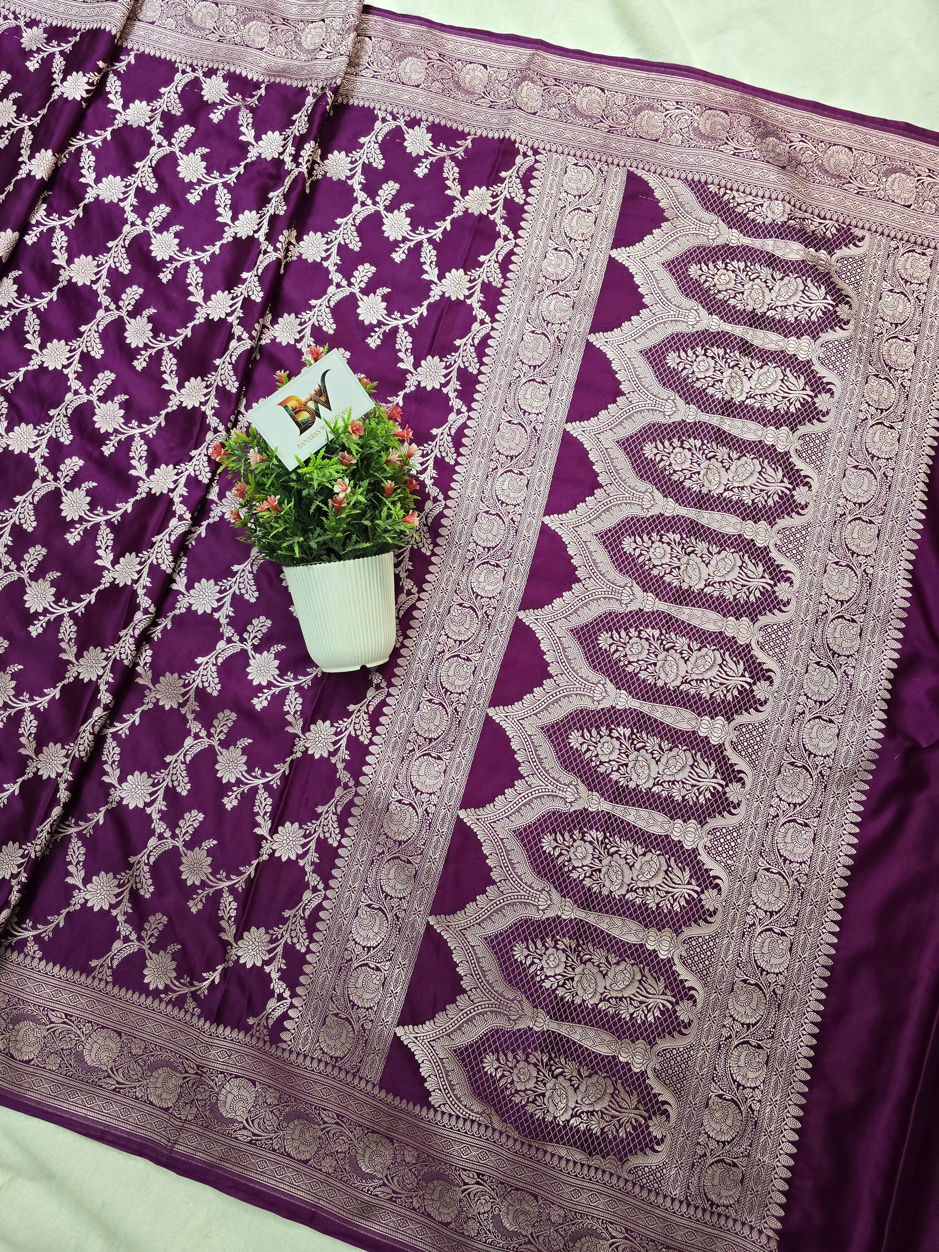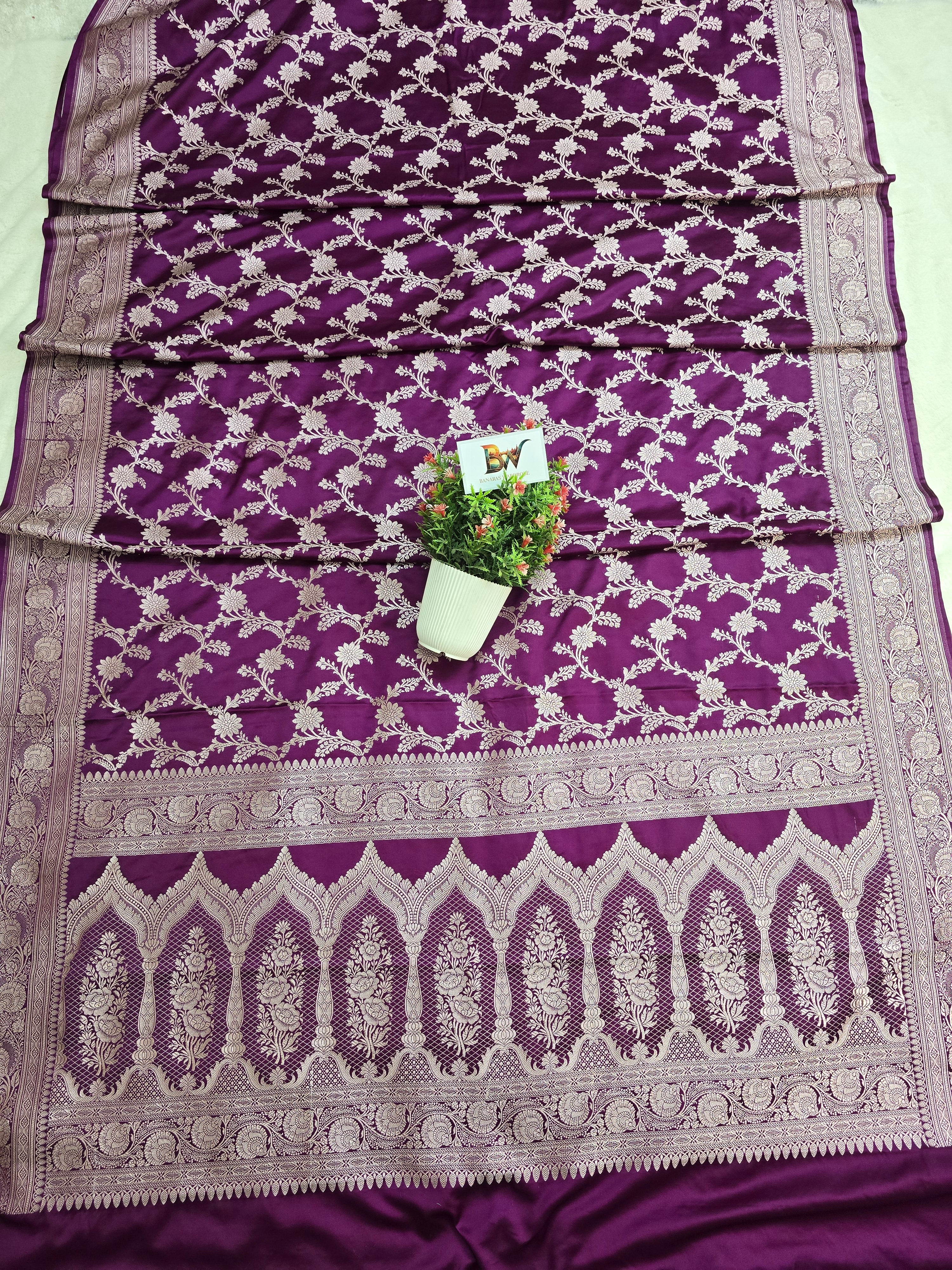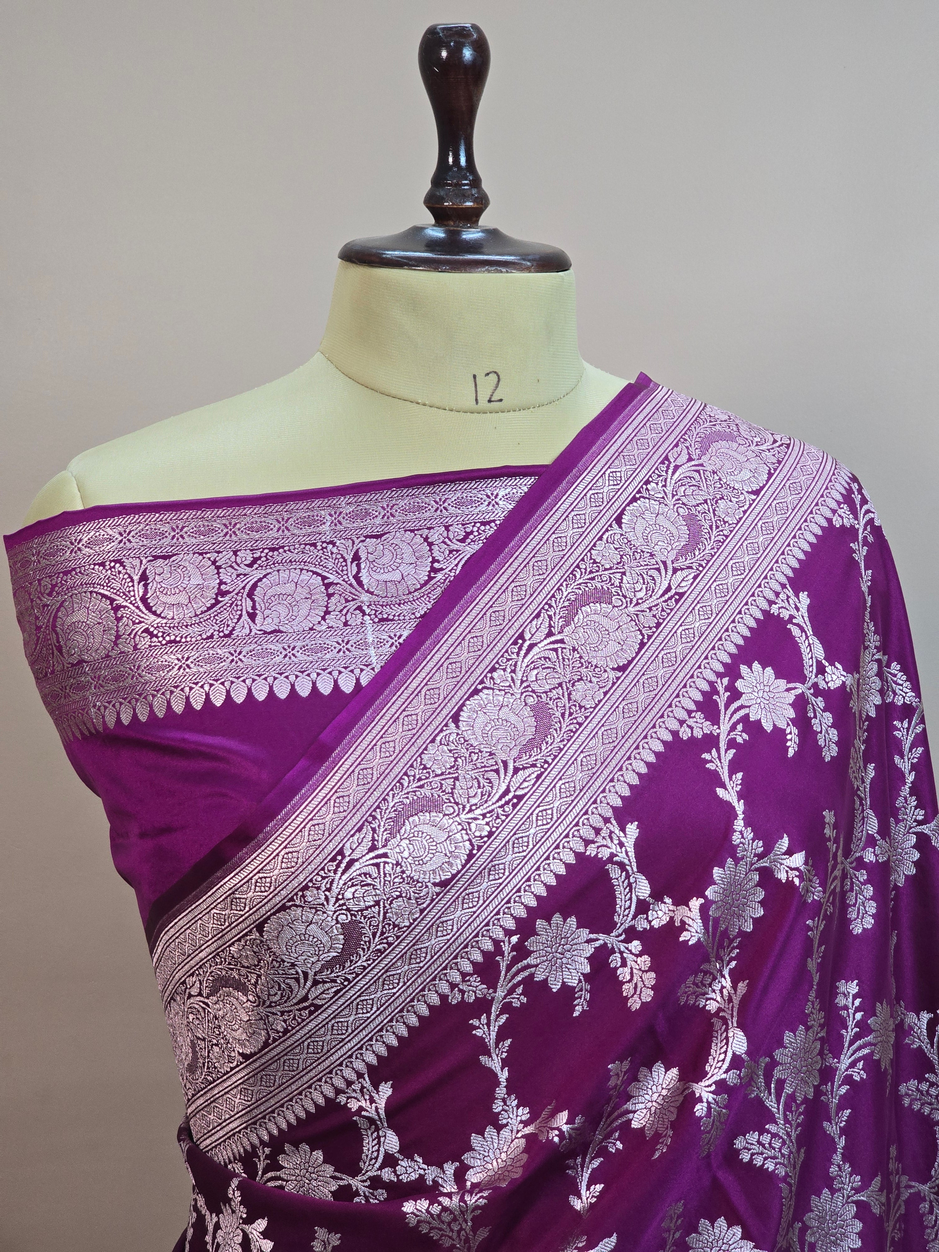 The highlight of this piece is its silver zari floral jaal pattern border, adding a regal Banarasi charm while maintaining a soft, smooth, and lustrous drape. Perfect for weddings, parties, festive occasions, and traditional events, this saree blends heritage artistry with modern sophistication.