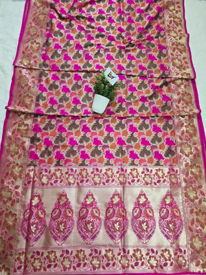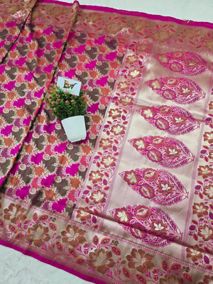 Add a touch of royal charm to your ethnic wardrobe with this exquisite Pauri Katan Silk Rangkaat Banarasi Saree, beautifully crafted with a rich multicolor rangkaat jaal pattern. The luxurious katan silk base offers a smooth, lustrous drape, while the intricate floral meenakari border enhances its traditional Banarasi elegance.