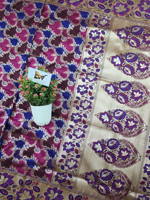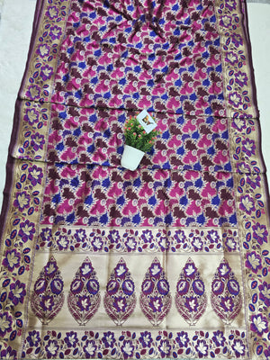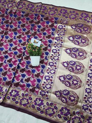 Add a touch of royal charm to your ethnic wardrobe with this exquisite Pauri Katan Silk Rangkaat Banarasi Saree, beautifully crafted with a rich multicolor rangkaat jaal pattern. The luxurious katan silk base offers a smooth, lustrous drape, while the intricate floral meenakari border enhances its traditional Banarasi elegance.