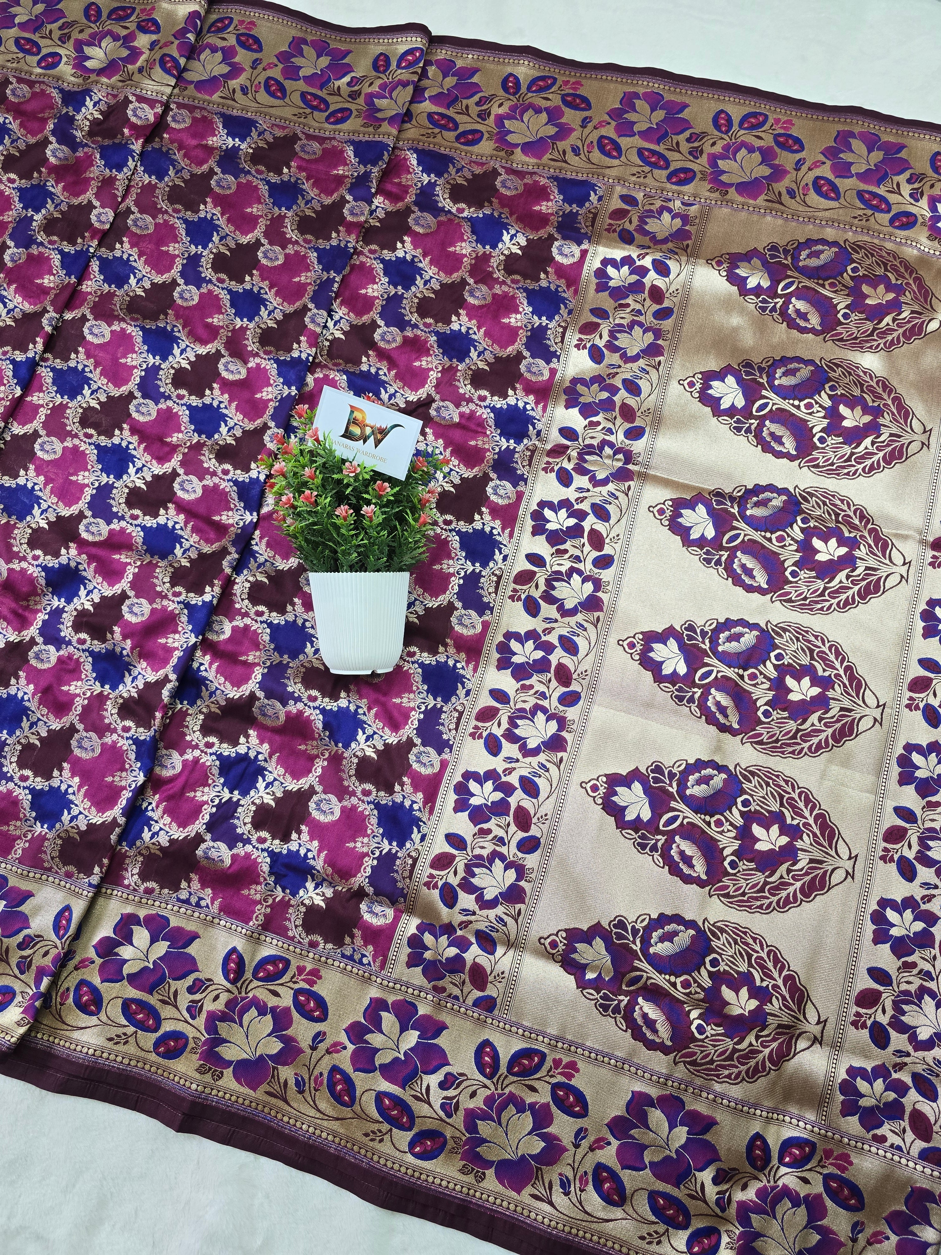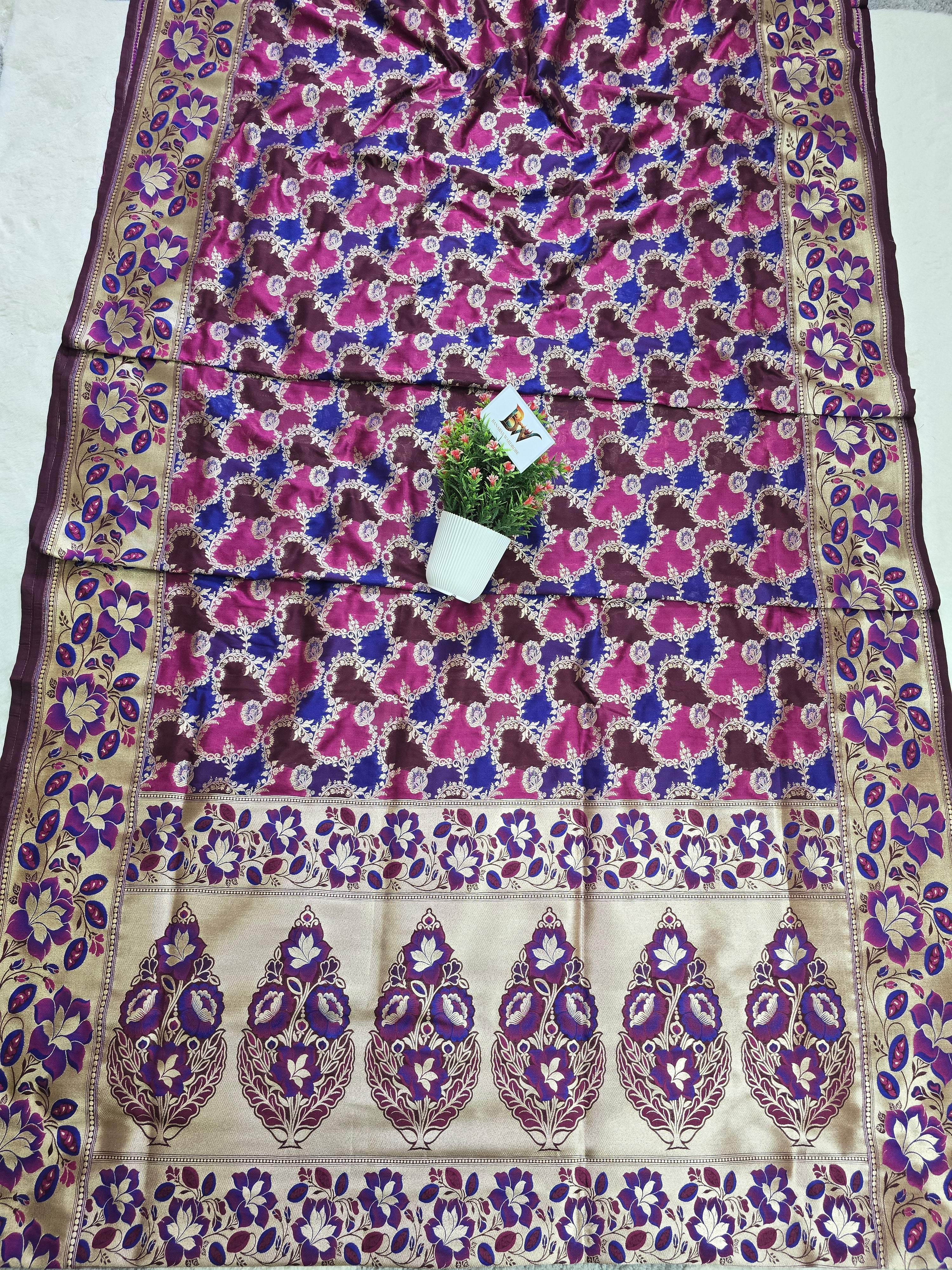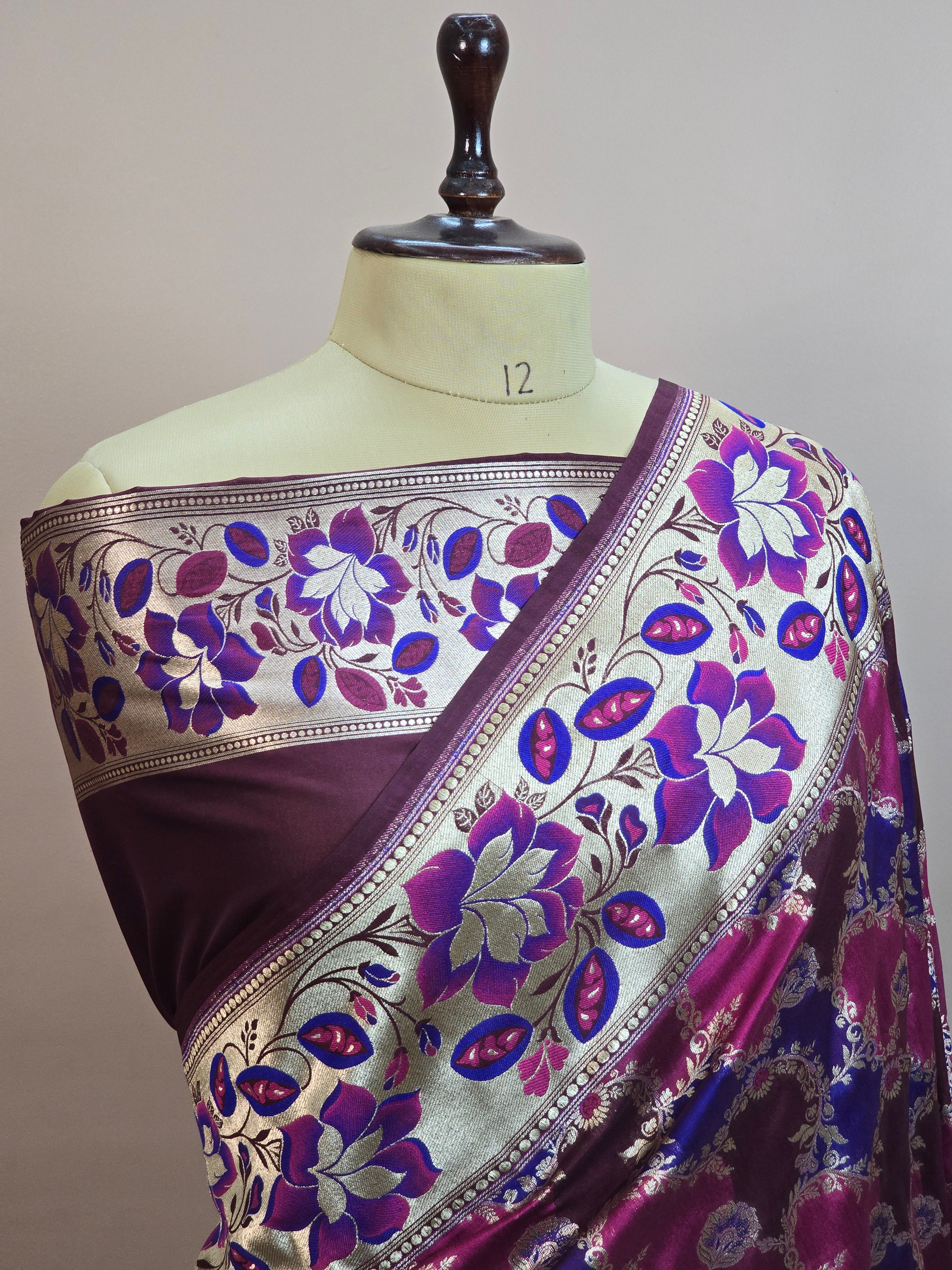 Home Pauri Katan Silk Rangkaat Banarasi Saree – Multicolor Jaal Weave with Floral Meenakari Border