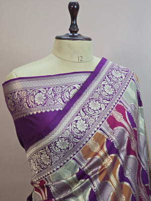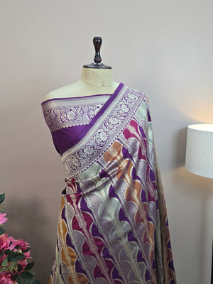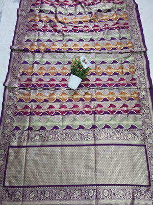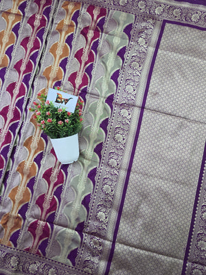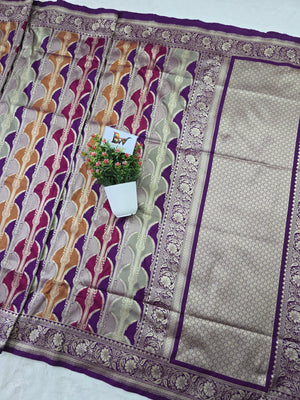Elevate your festive wardrobe with this exquisite Pauri Katan Silk Rangkaat Banarasi Saree, crafted for those who appreciate rich textures and traditional craftsmanship. The saree features a beautiful multicolor rangkaat weave combined with luxurious katan silk, giving it a vibrant yet elegant appeal.
