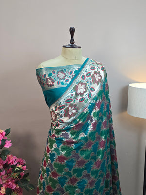 Pauri Katan Silk Rangkaat Banarasi Saree – Multicolor Jaal Weave with Floral Meenakari Border