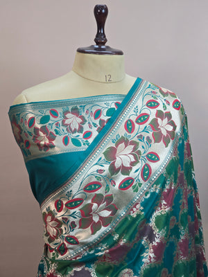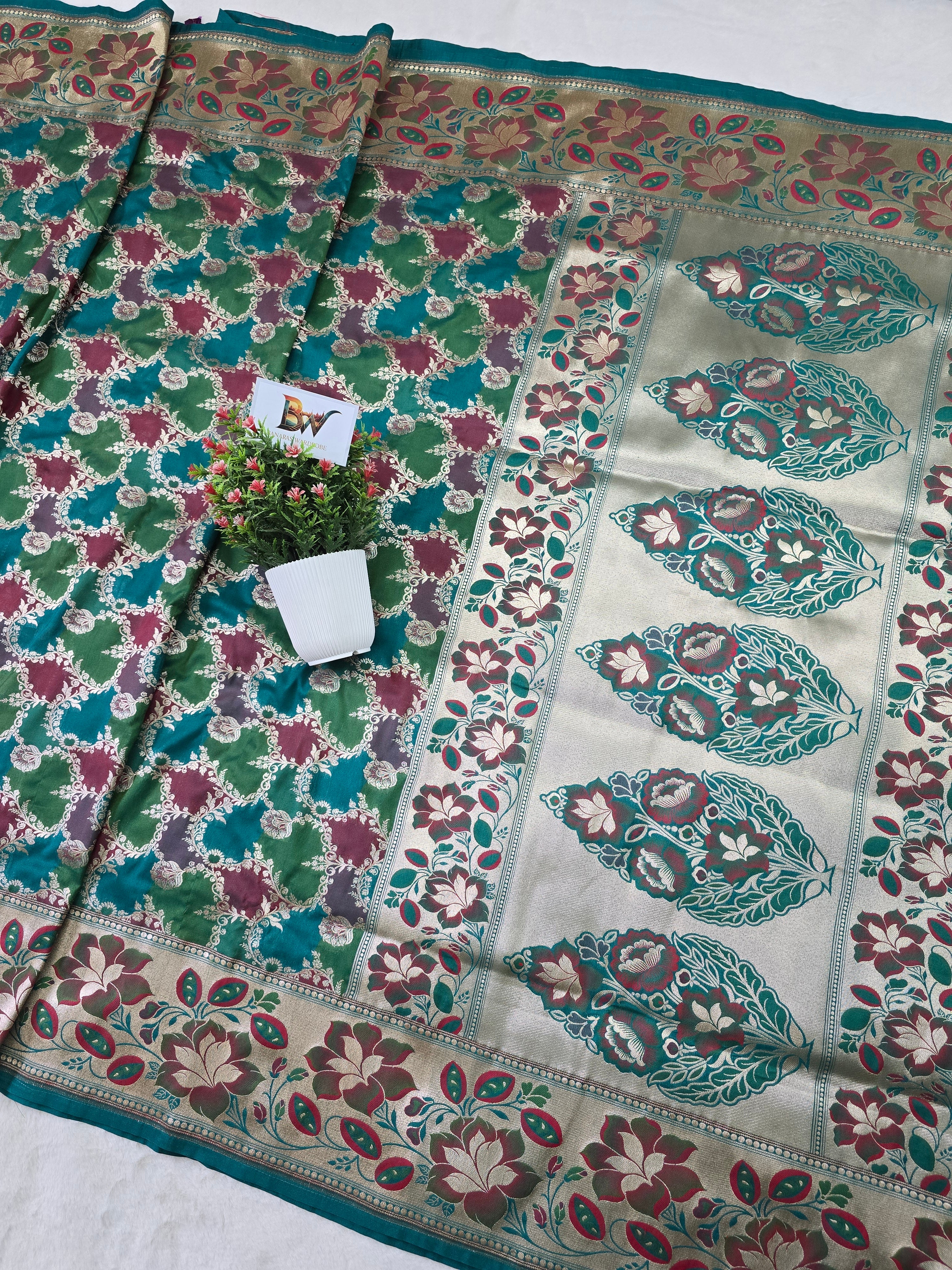 Home Pauri Katan Silk Rangkaat Banarasi Saree – Multicolor Jaal Weave with Floral Meenakari Border
