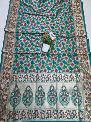 Add a touch of royal charm to your ethnic wardrobe with this exquisite Pauri Katan Silk Rangkaat Banarasi Saree, beautifully crafted with a rich multicolor rangkaat jaal pattern. The luxurious katan silk base offers a smooth, lustrous drape, while the intricate floral meenakari border enhances its traditional Banarasi elegance.