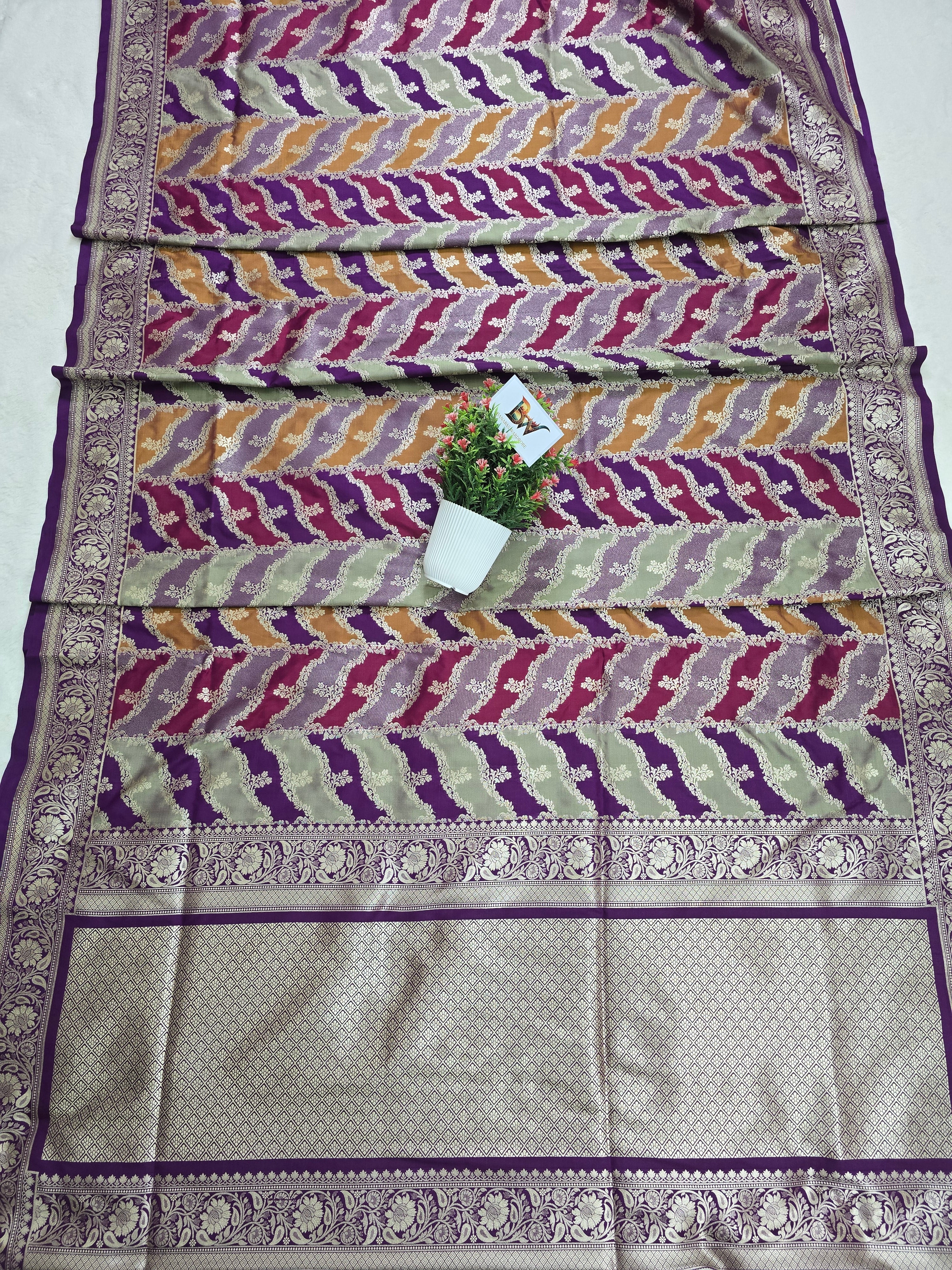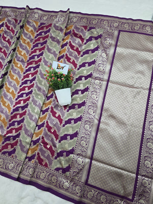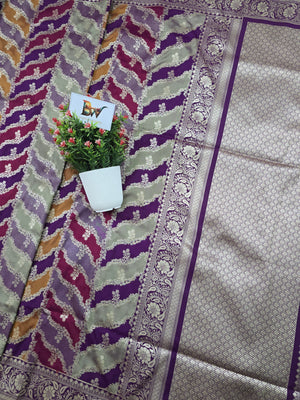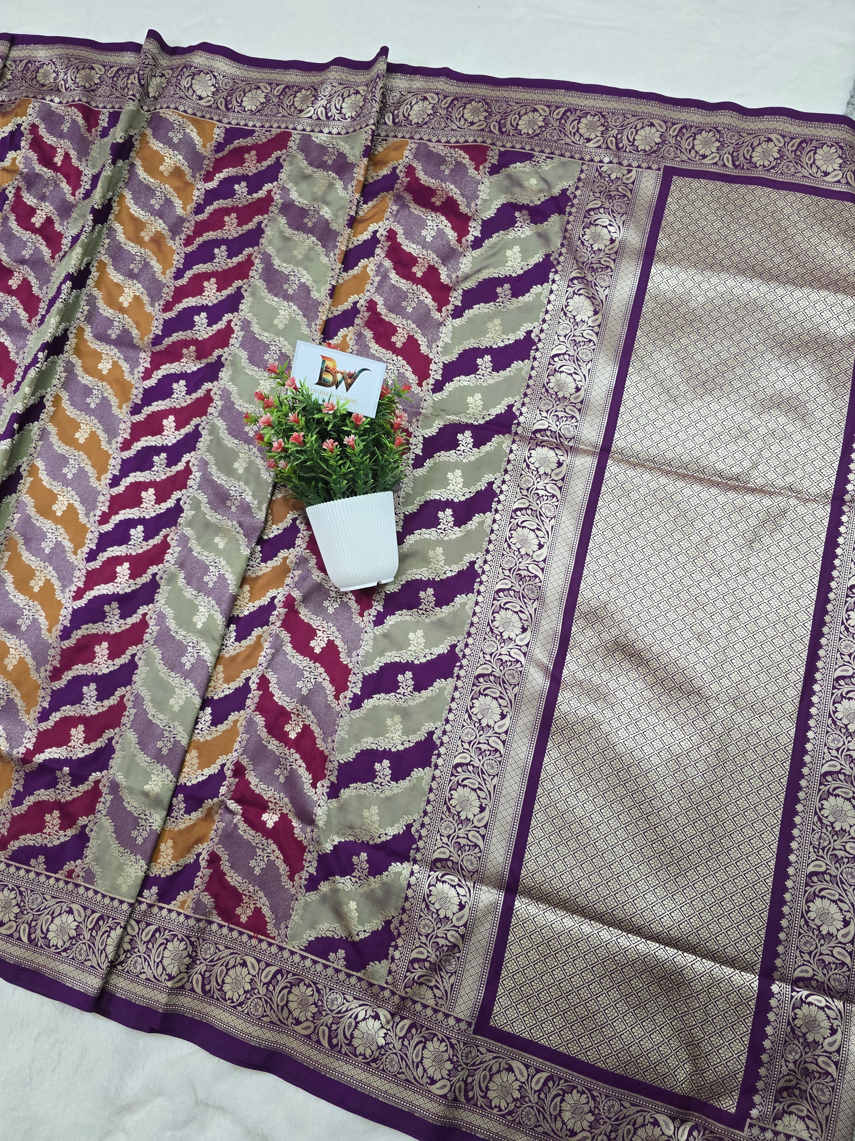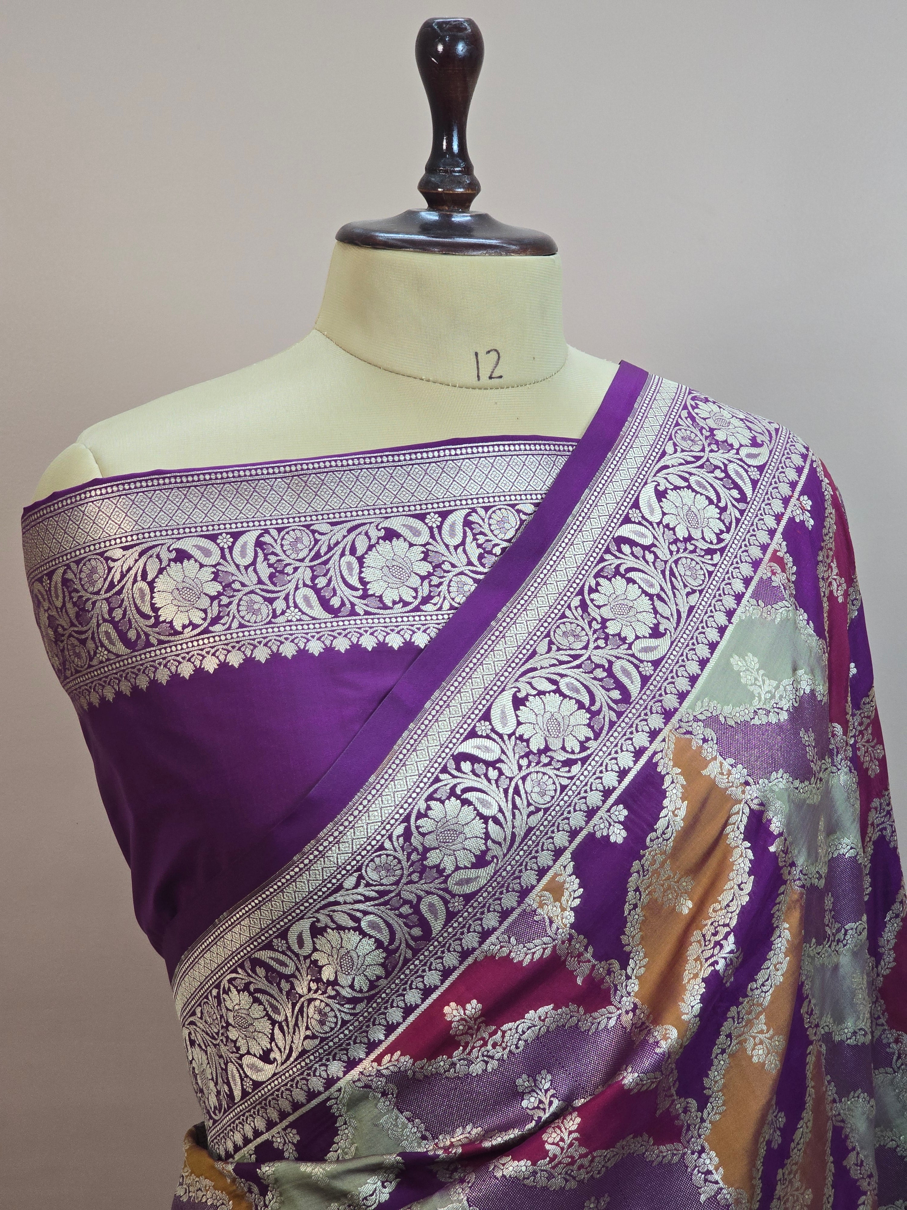 Pauri Katan Silk Rangkaat Jaal Banarasi Saree – Multicolor Weave with Zari Floral Border