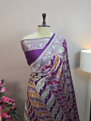 Elevate your festive wardrobe with this exquisite Pauri Katan Silk Rangkaat Jaal Banarasi Saree, crafted for women who appreciate luxurious textures and traditional artistry. This saree features a rich multicolor rangkaat weave arranged in a beautiful jaal pattern, giving it a vibrant and regal appeal.