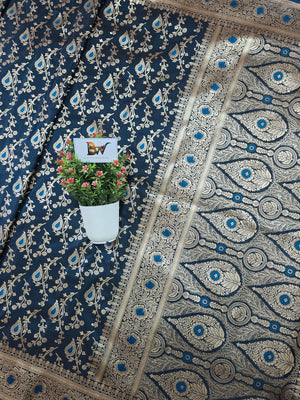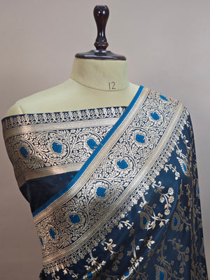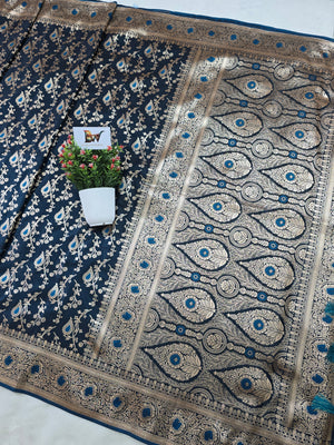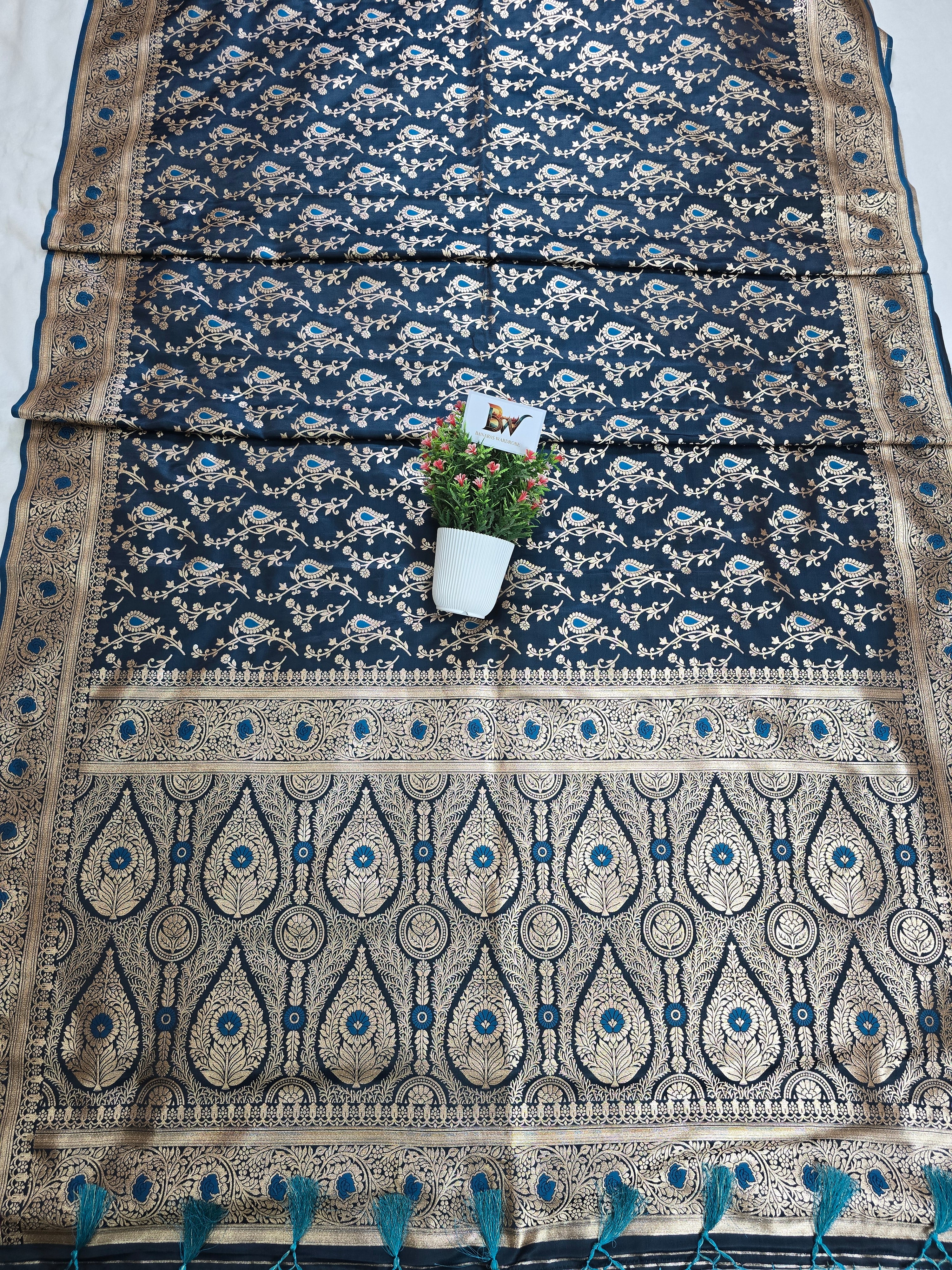 The saree is beautifully framed with a stunning meenakari floral jaal border, adding heritage charm and intricate artistry to the overall design. Soft, smooth, and designed for a graceful drape, this piece is ideal for weddings, festive celebrations, and traditional functions where you want to look regal yet refined.