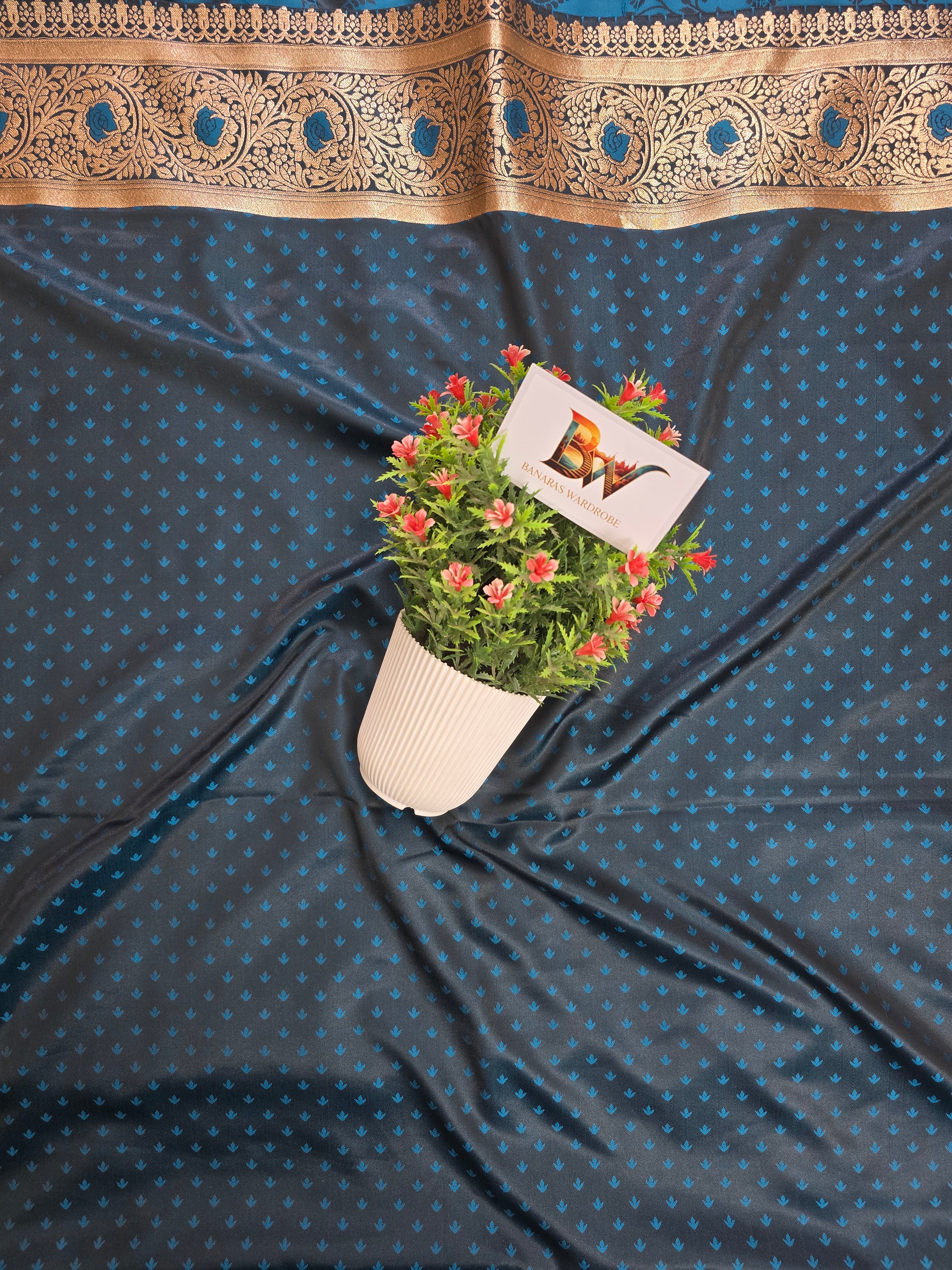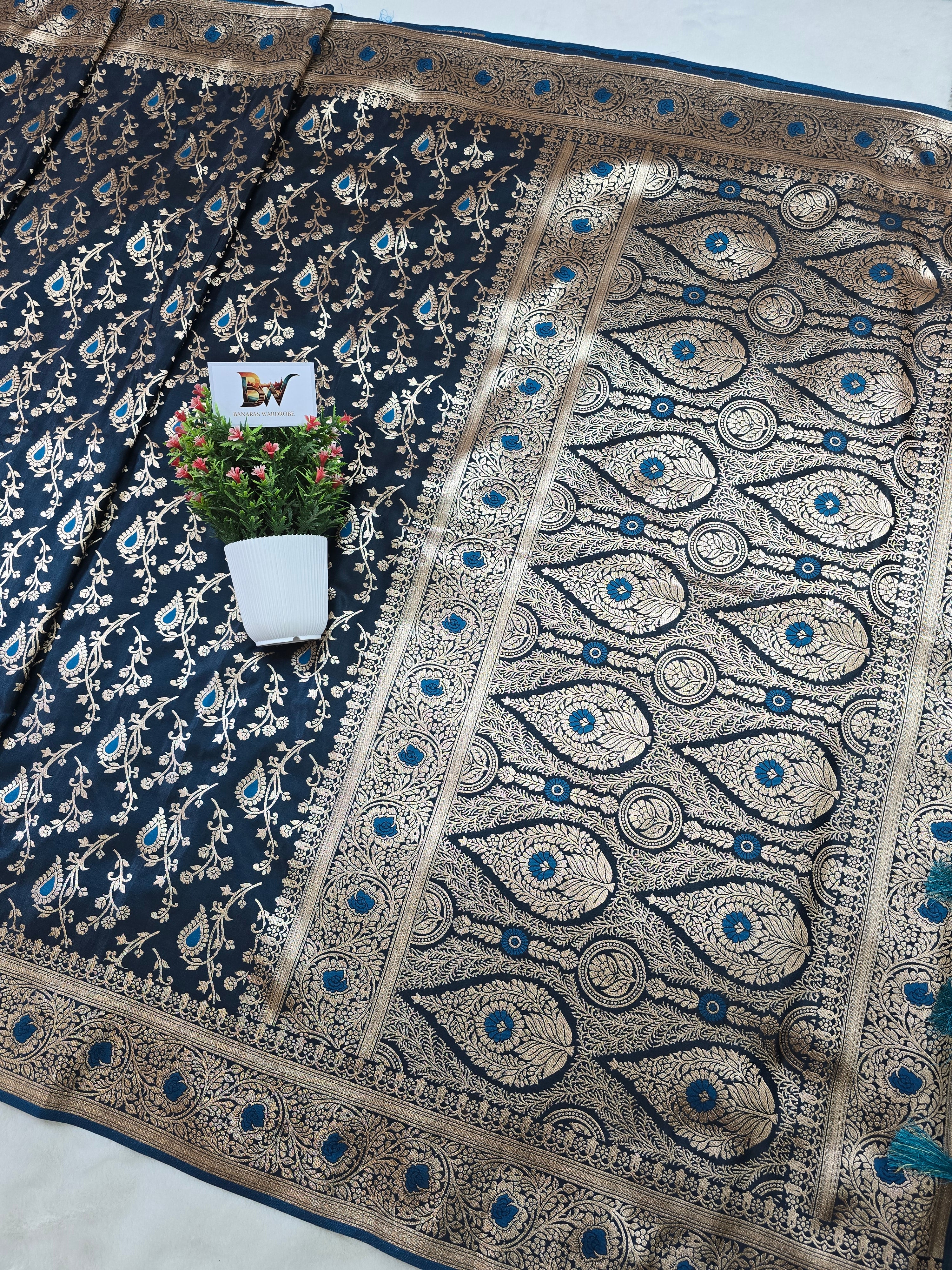Satin Malai Katan Banarasi Saree – Meenakari Booti Jaal with Rose Gold Zari